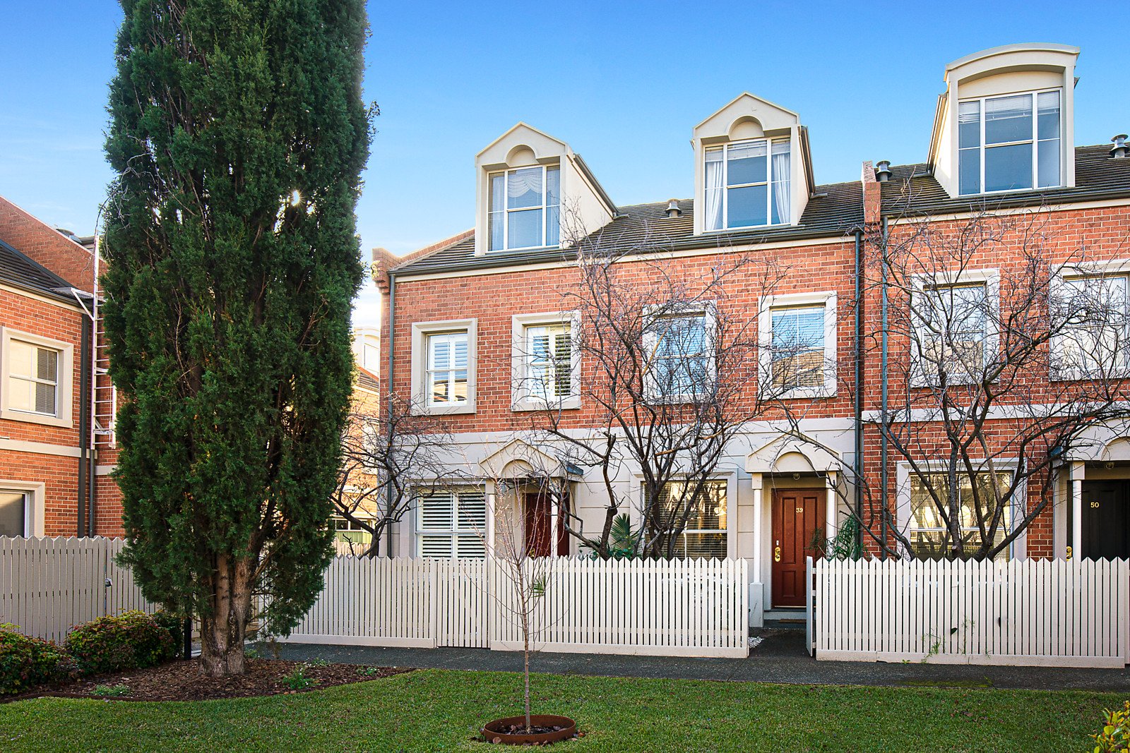 Centrally positioned, the kitchen overlooks a living area with seamless flow to the glorious private sunshine of its north-facing deck, whilst a semi-attached dining room frames vistas of the communal gardens and the in-ground swimming pool. A spectacular top-floor master bedroom highlights an ensuite, built-in robes, an alcove study and commanding views of the pool, whilst the remaining bedrooms share access to the main bathroom and are appointed with built-in robes. Securely accessed via intercom entry or the secure undercover parking space that is adjacent to the home's rear courtyard, it also features a powder room and plenty of under stair storage.