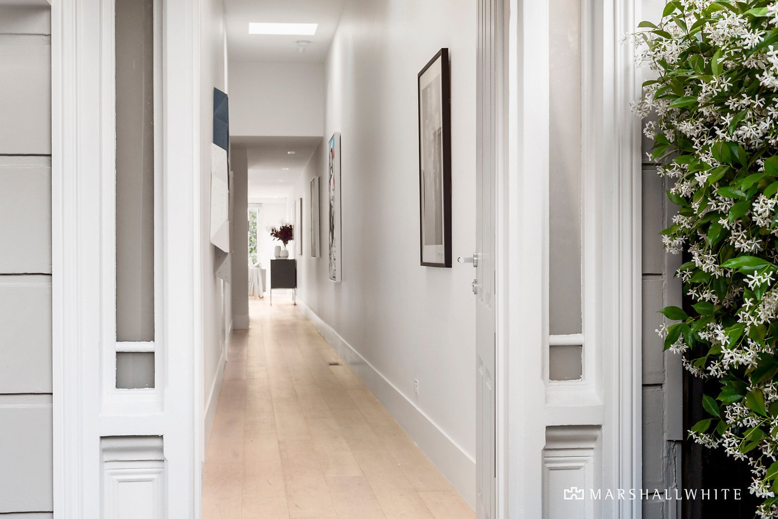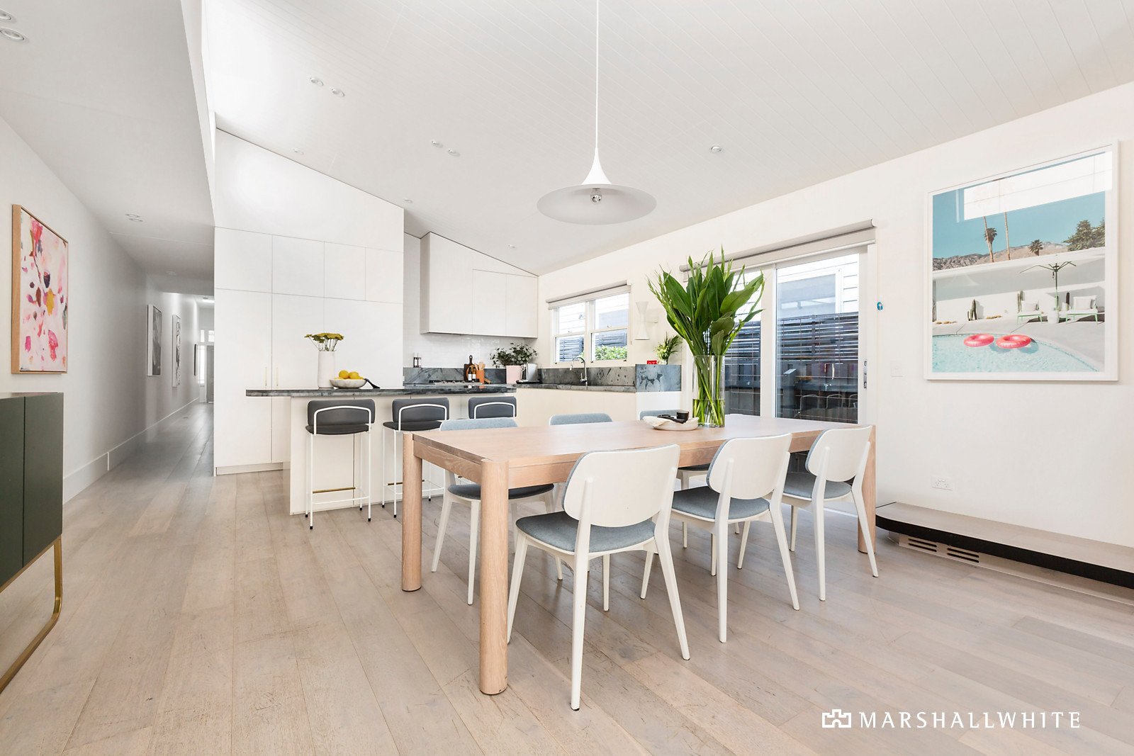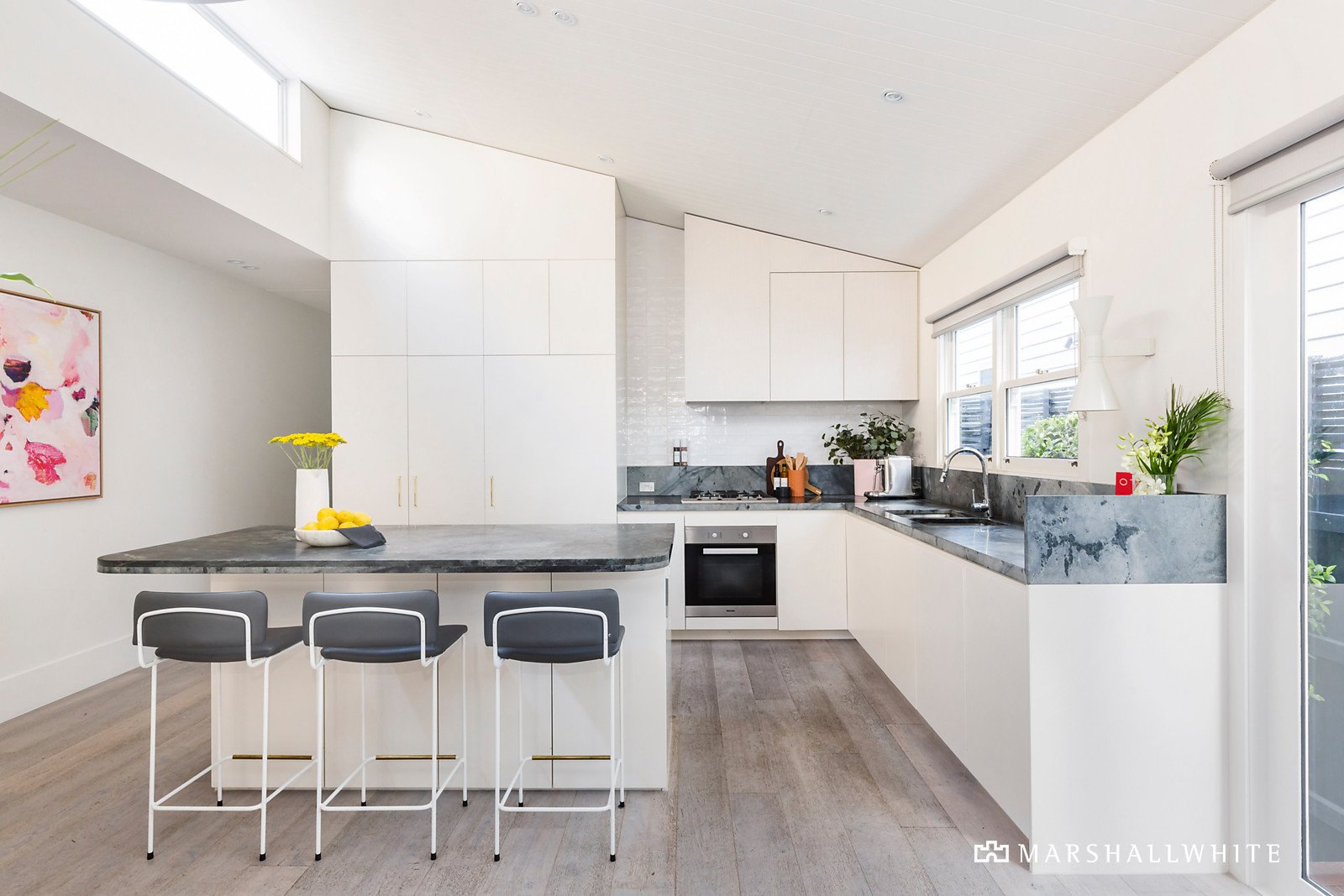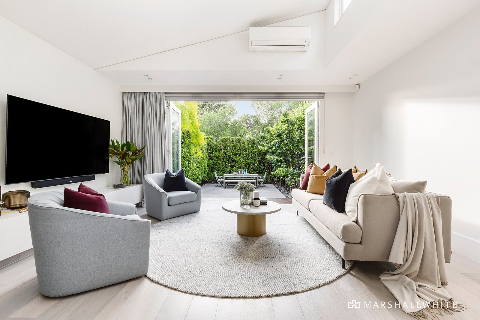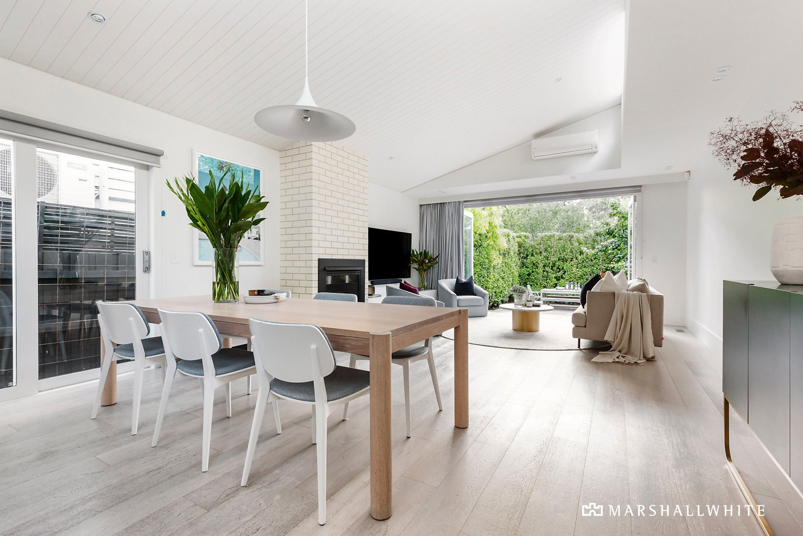 Behind the captivating block-fronted exterior, limed oak floors flow through the sky-lit hall to a gorgeous main bedroom with loads of built-in robes and a stylish en suite, two additional double bedrooms with built-in robes and a designer bathroom. Raked ceilings and north-facing clerestory windows add to the scale and natural light in the expansive open plan living and dining room featuring a gas log fire and streamlined gourmet kitchen boasting stone benches, Miele appliances and an integrated fridge/freezer. Providing a seamless transition for indoor-outdoor entertaining, bi-fold doors open the living spaces completely to the beautifully landscaped northwest-facing bluestone paved garden, surrounded by high hedges.