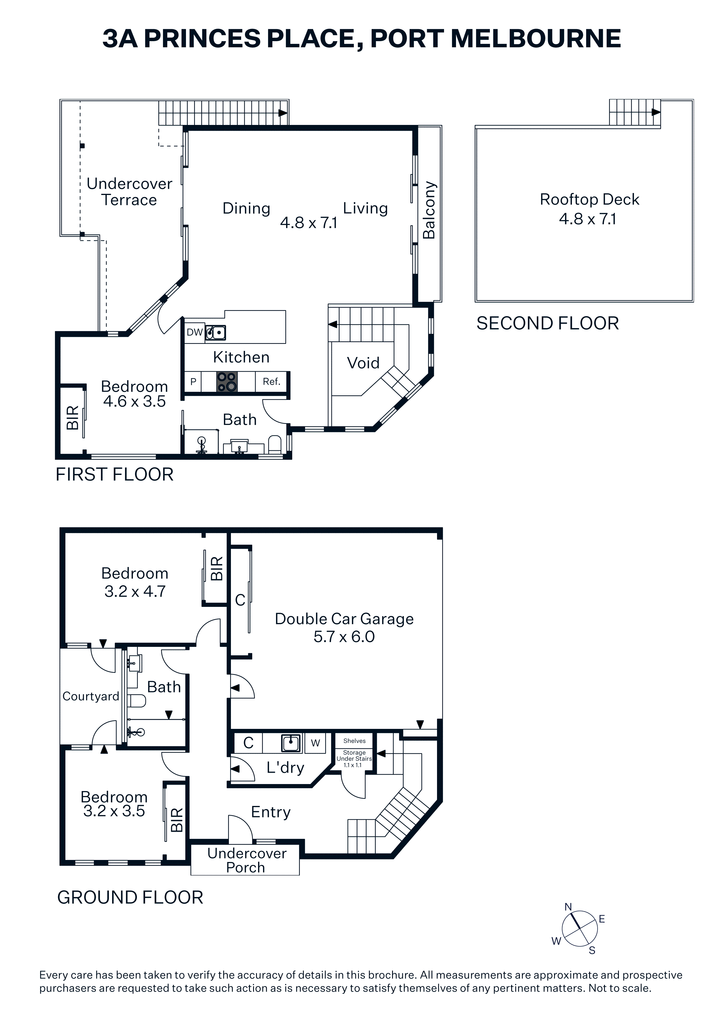 Tasmanian oak floors and a soaring double-height stairwell with architectural window atrium draw in all-day light, carrying through the two-bedroom, one-bathroom ground-floor layout. A central courtyard joins the robed bedrooms, giving each room its own outlook and connection to the outdoors. Upstairs, substantial open-plan living and dining areas, with both north and south sides opening to al-fresco balcony spaces, accompany a gourmet kitchen, appointed with Smeg appliances and stone benchtops. Sliding doors extend to a generous covered entertaining area and a roof terrace framed by the city skyline, creating a private, high-impact space for hosting. A large third bedroom sits on this level as well, set apart for privacy, with extensive robes and a dual-access en-suite.