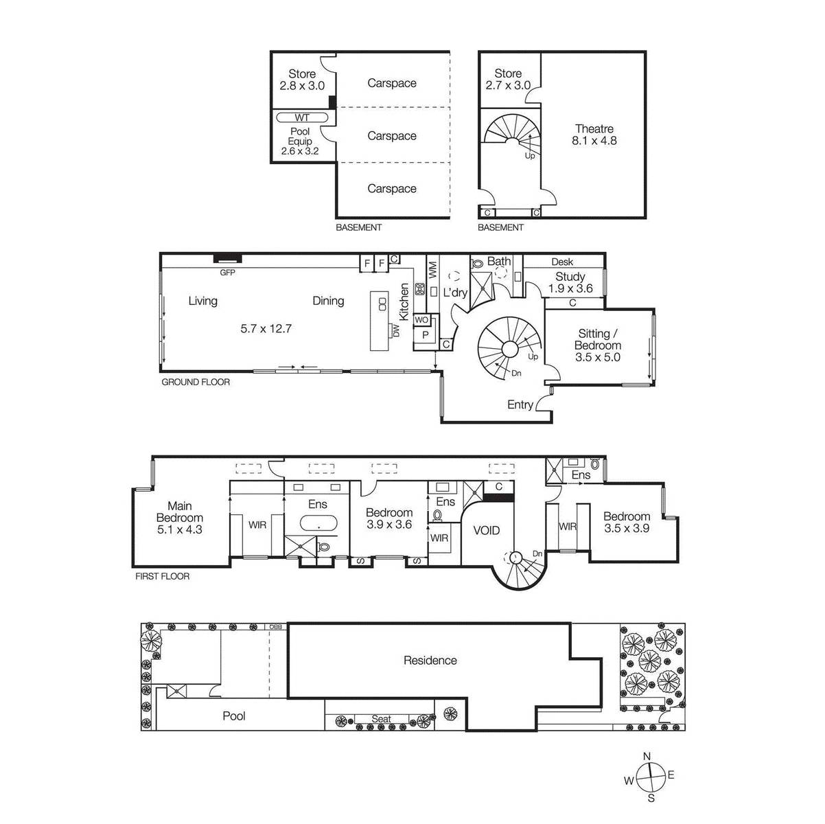 A versatile formal lounge or fourth bedroom with glass sliders to the front yard, Travertine bathroom, deluxe laundry and custom fitted study complete the ground floor. Follow the curved staircase down to the lower level where a gold standard, home cinema stars along with a multi-purpose room (music room or home gym), mudroom/storage and secure access to 2-car basement garaging.