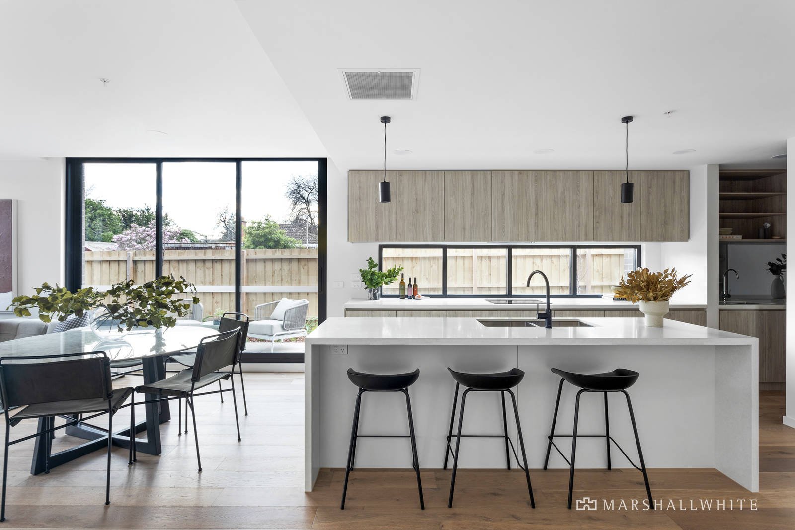 Surrounded by floor to ceiling glass and featuring oak floors and high ceilings, a wonderful sense of light and space defines the expansive open plan living and dining room served by a premium kitchen appointed with stone benches, Miele appliances and a butler's pantry. Two sets of glass sliders open the living spaces to the northeast facing private entertaining terrace fully enveloped by leafy landscaped gardens. The generous main bedroom with walk in robe and designer ensuite is in one wing accompanied by a spacious home office while in a separate wing there are two additional bedrooms with robes and a stylish bathroom with bath.