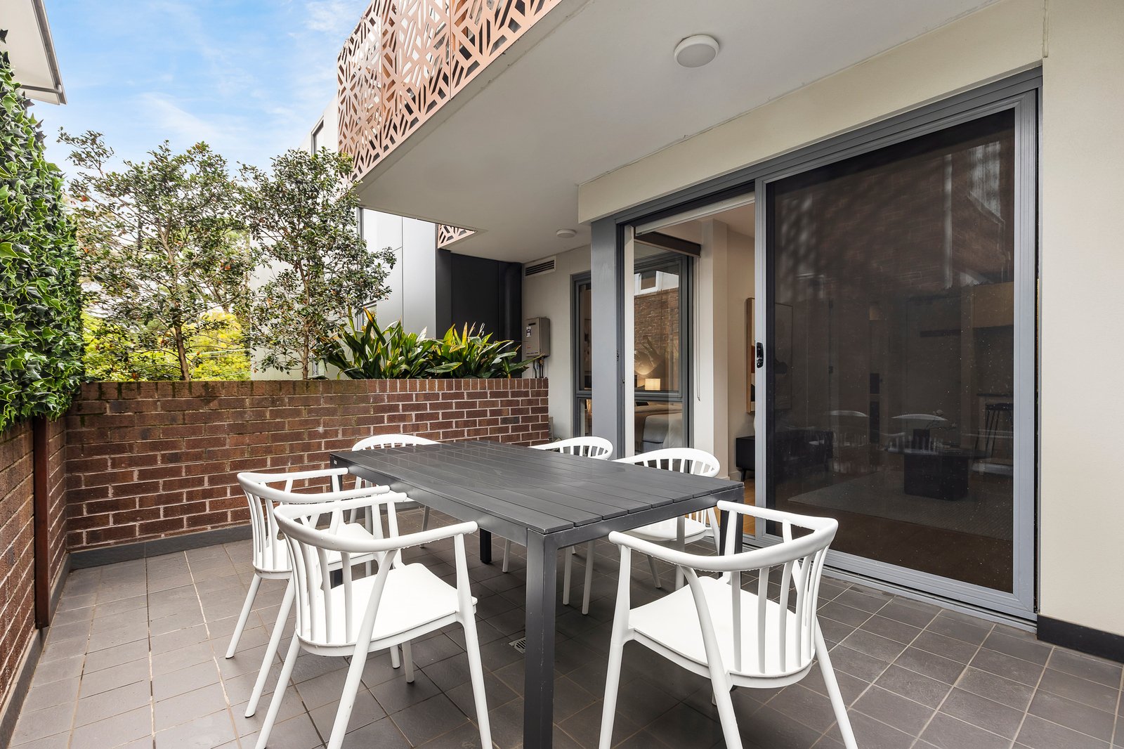 Inside, timber floors enhance the light-filled open plan living and dining area, complete with split system heating and cooling for year-round comfort. The sleek stone kitchen features excellent storage including a pull-out pantry and stainless steel Smeg appliances. Sliding doors extend the living space to the generous, high-fenced terrace, ideal setting for entertaining, weekend dining, or relaxed morning coffee.