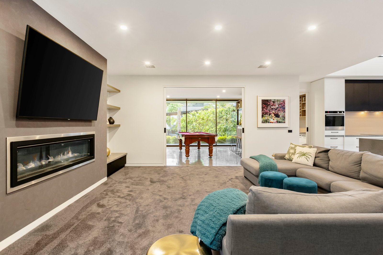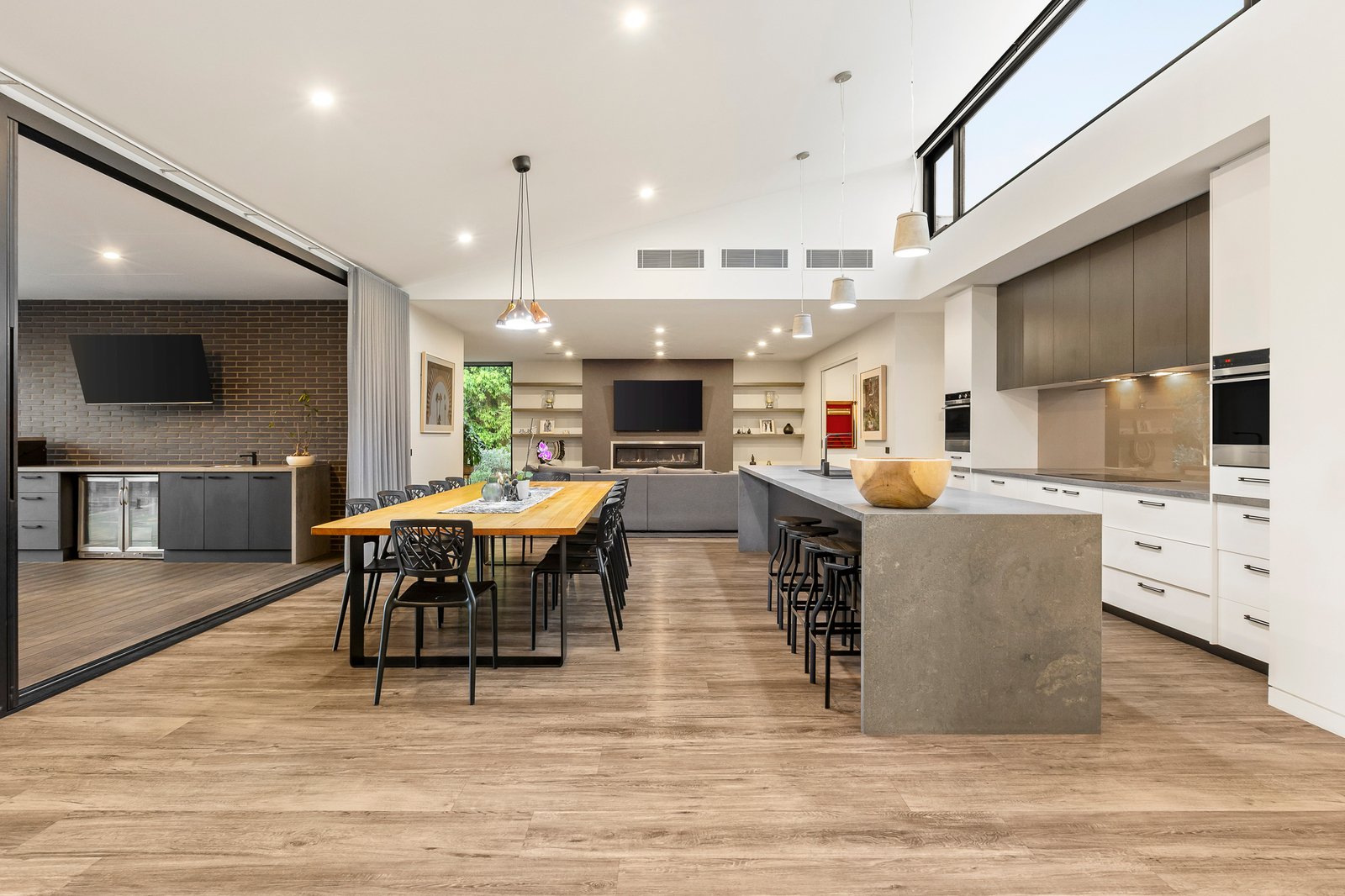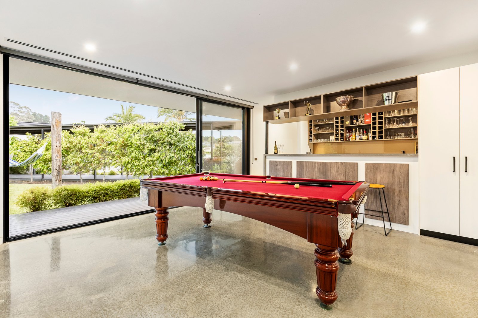 At the heart of the home, the chef’s kitchen is a statement in luxury, boasting concrete benchtops, twin ovens, a full butler’s pantry, and a Billi system delivering boiling, chilled, and sparkling water. Multiple living zones—including a theatre room, games room with bar, and an open-plan lounge with a gas fireplace—are designed for effortless entertaining.