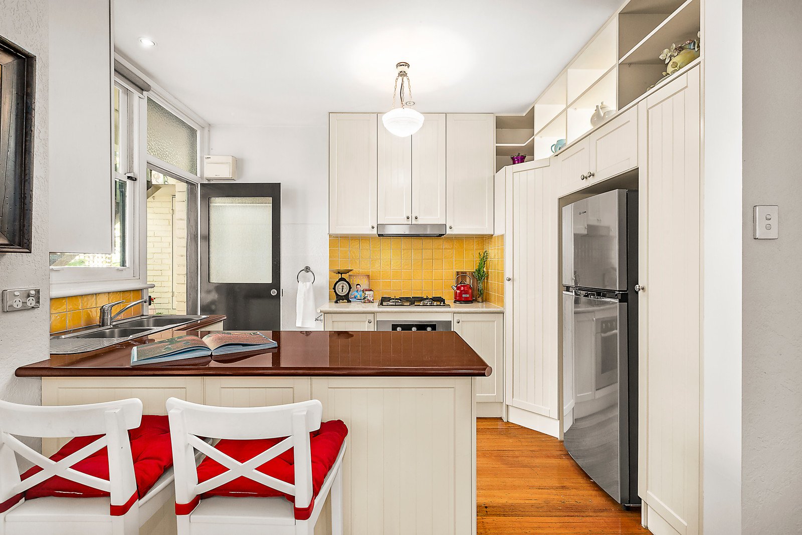 As it highlights polished timber floors, ornate ceilings, picture rails, original plasterwork and stain glass windows, the home's past is meticulously preserved and comfortable alongside crisp plantation shutters and an original fire place that has been converted to gas. The kitchen / meals is arranged around a breakfast bar and features modern cabinetry in a heritage style, whilst the lounge room is warm and welcoming and the bathroom equipped with laundry facilities.