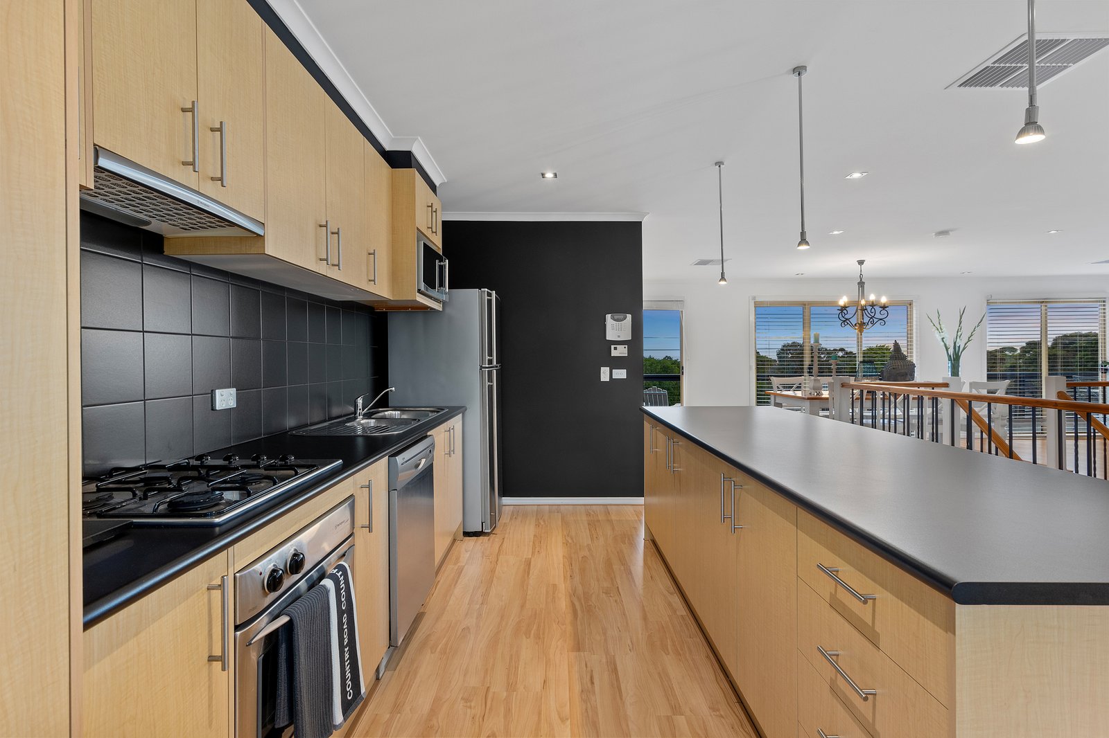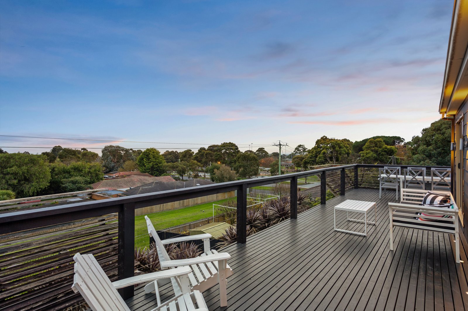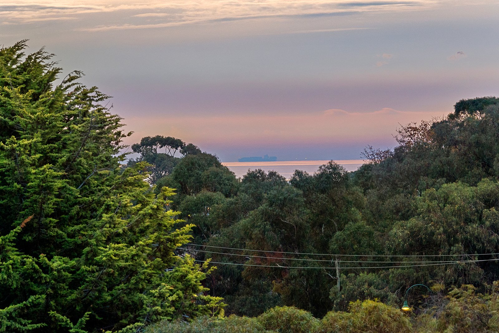 Beneath a soaring void, the striking entrance foyer with a central staircase introduces ground-floor bedrooms and two bathrooms, including the master with a private and stylish ensuite. Upstairs, a well-appointed kitchen with abundant storage oversees a light-filled dining area and the generous living room, opening via a bank of sliding doors to the wrap-around 6sqm (approx.) balcony deck. Treetop views over Ballam Park toward Port Phillip Bay and Melbourne's skyline emphasise the sense of sanctuary atop it all, whilst extraordinary sunsets form a perfect backdrop to any occasion.
