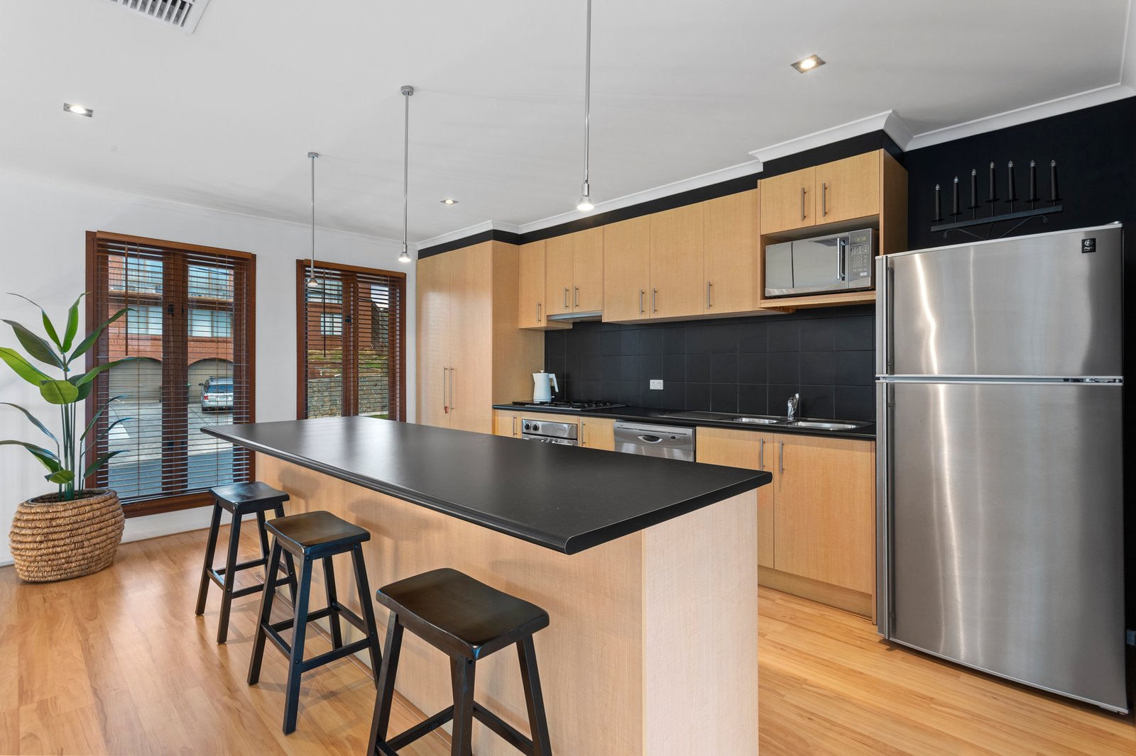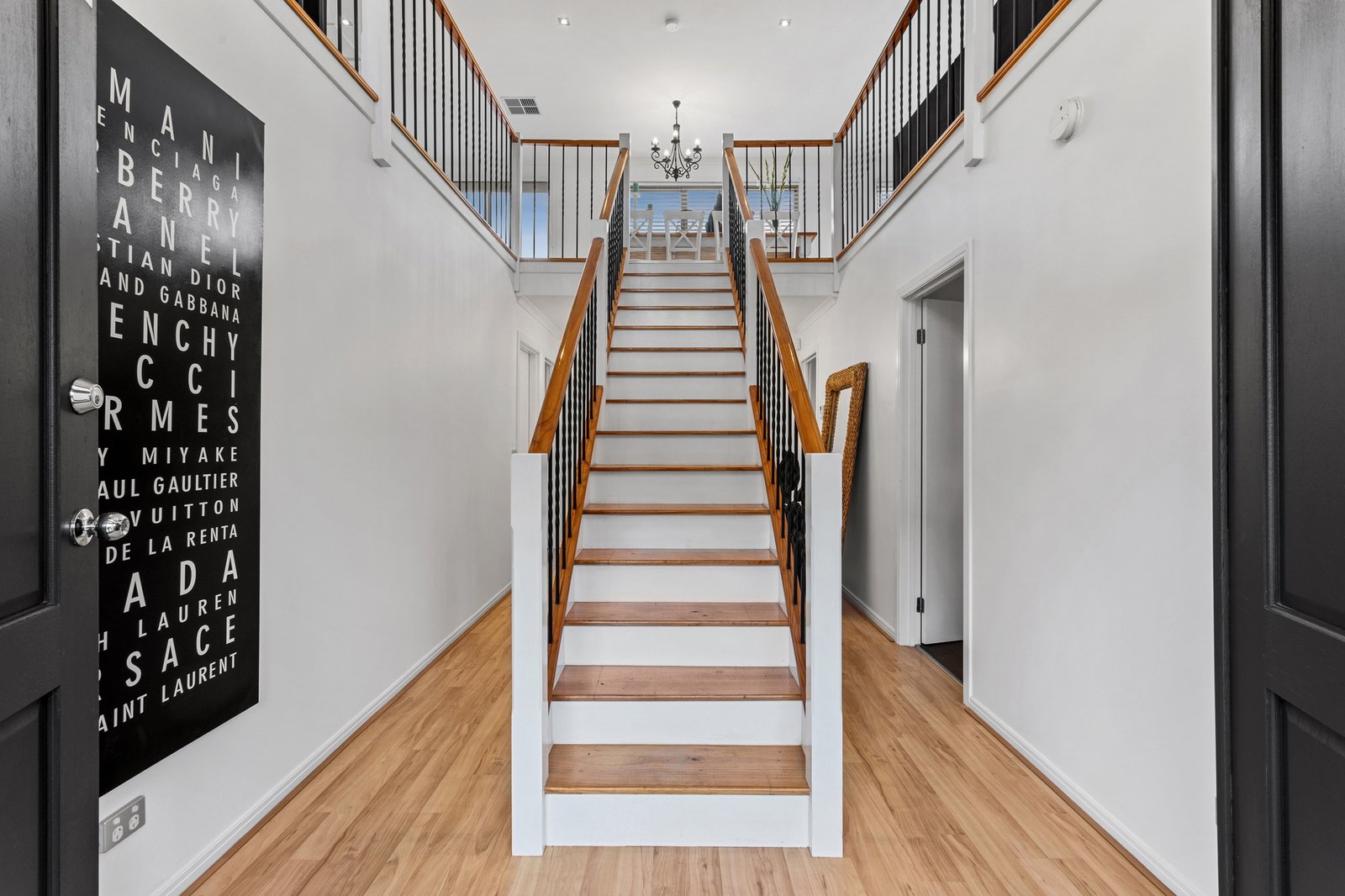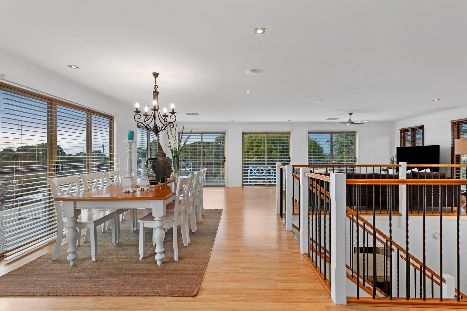 Beneath a soaring void, the striking entrance foyer with a central staircase introduces ground-floor bedrooms and two bathrooms, including the master with a private and stylish ensuite. Upstairs, a well-appointed kitchen with abundant storage oversees a light-filled dining area and the generous living room, opening via a bank of sliding doors to the wrap-around 6sqm (approx.) balcony deck. Treetop views over Ballam Park toward Port Phillip Bay and Melbourne's skyline emphasise the sense of sanctuary atop it all, whilst extraordinary sunsets form a perfect backdrop to any occasion.