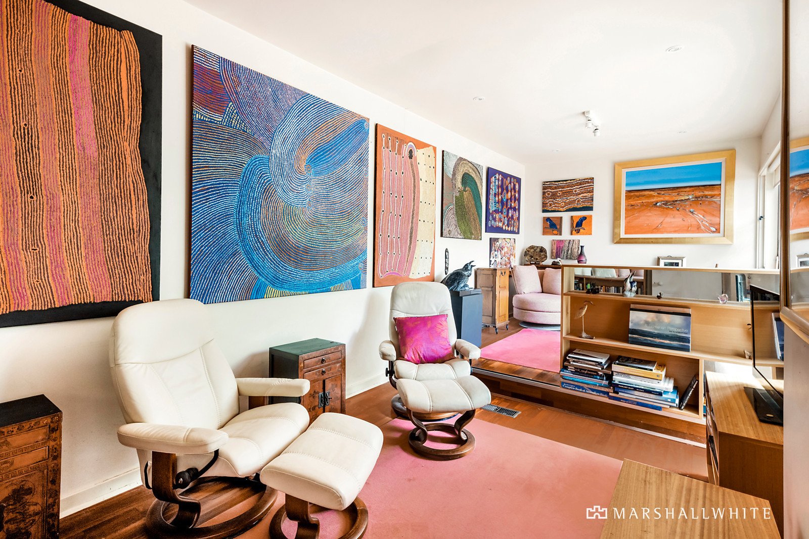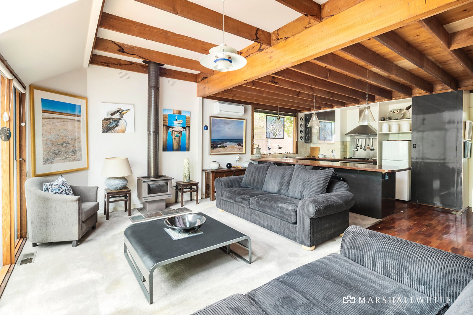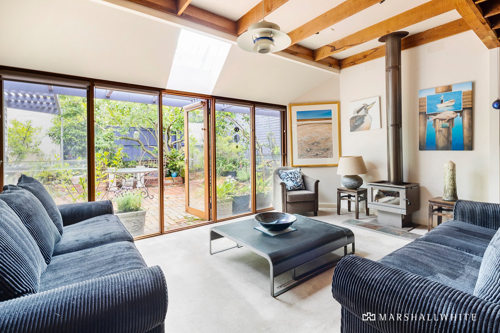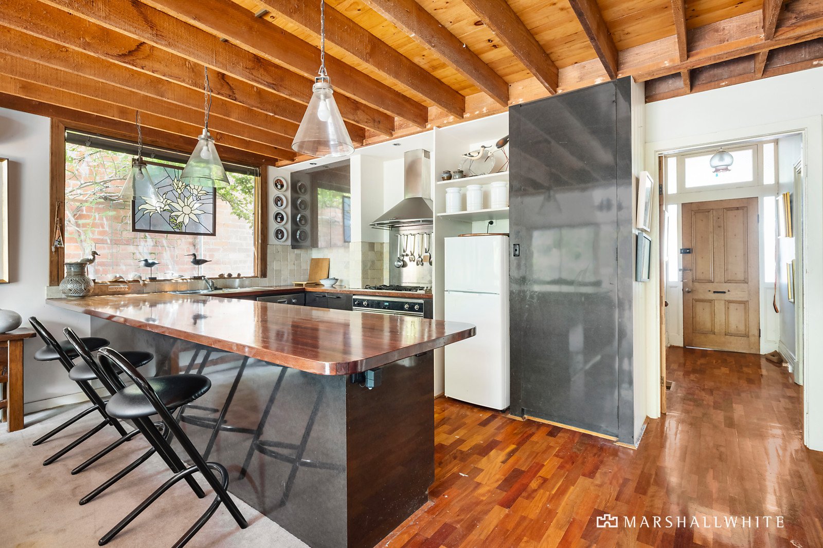 Parquetry floors flow through the central hall to an elegant dining room with high ceilings. Timber beamed ceilings preside above the well-equipped Ilve kitchen and generous living room with a wood fire heater opening to a private west-facing leafy garden. A versatile gallery/study area also opens to the garden. A double bedroom with built in robe and sky lit bathroom are downstairs while upstairs there is a second double bedroom with walk in/built in robes.
