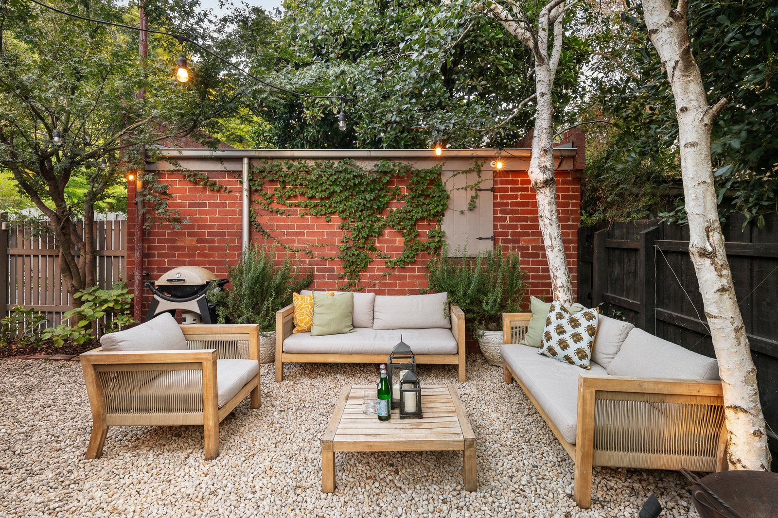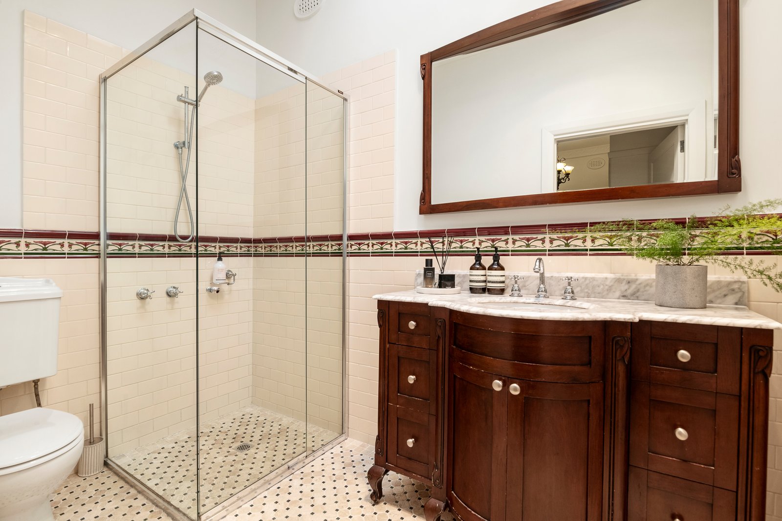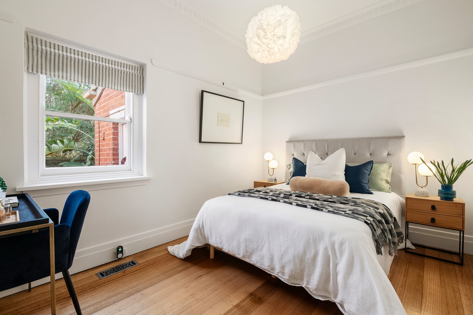 The inviting entrance hall with its ornate ceilings and timber floors flows through to generous living room and formal dining room, both featuring ornate ceilings and fireplaces. The superbly appointed gourmet stone kitchen and light-filled casual dining room open to the sunny private garden, a leafy oasis for relaxed outdoor living. Two beautiful bedrooms and a third bedroom or home office are accompanied by a stylish bathroom.