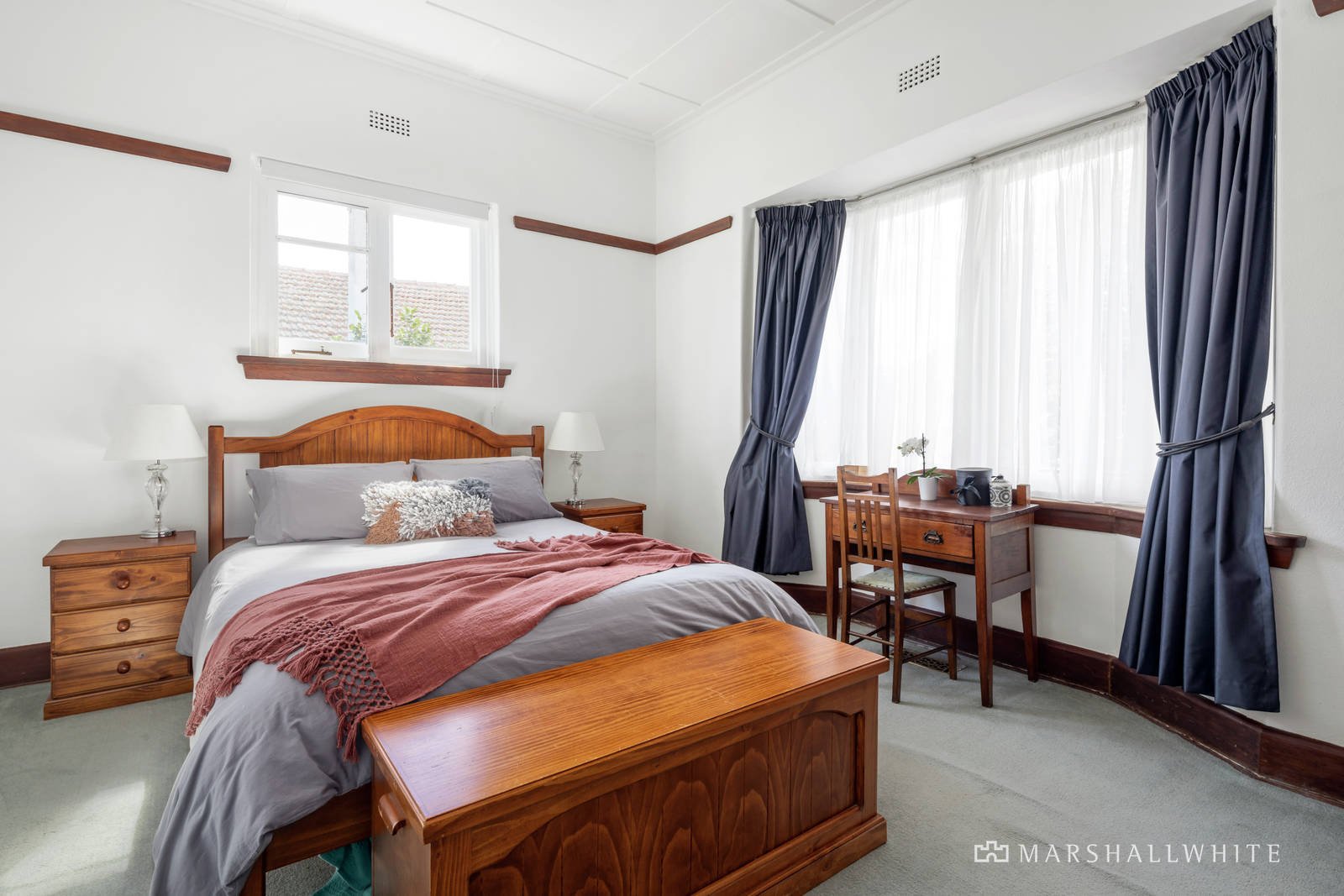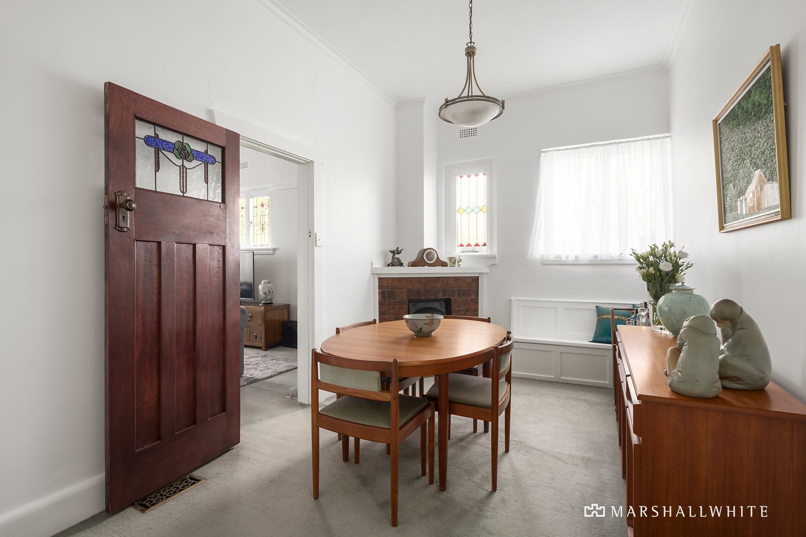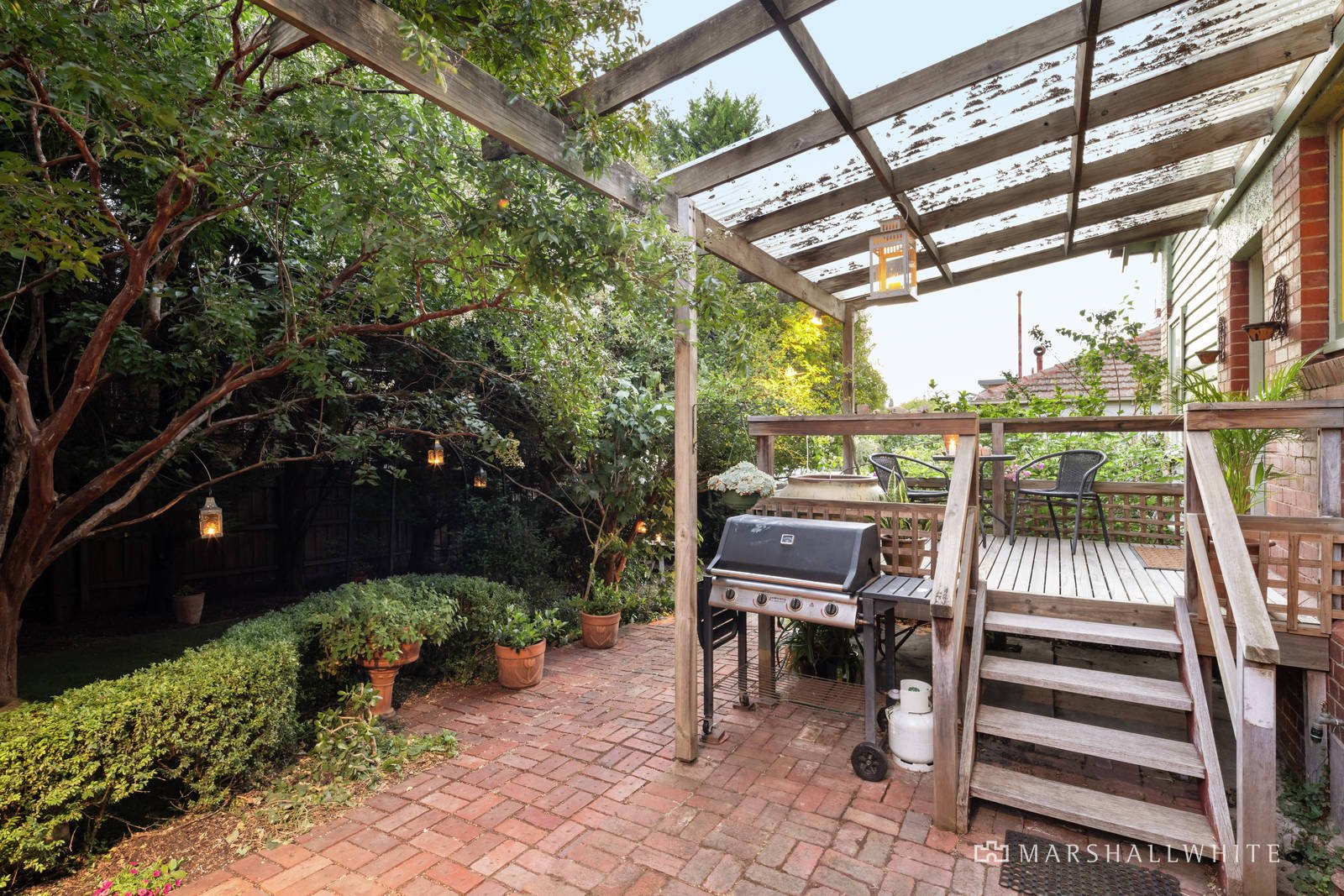 Behind a broad frontage, the central entrance hall boasting high ceilings introduces a gracious living room and inviting formal dining room both with fireplaces. The well-equipped galley kitchen leads out to a covered deck overlooking the private leafy garden with a garage/storeroom. The main bedroom with built in robe and a stylish en suite/bathroom is accompanied by a home office with robes and upstairs, an expansive second bedroom with walk in robe, bathroom and city views.