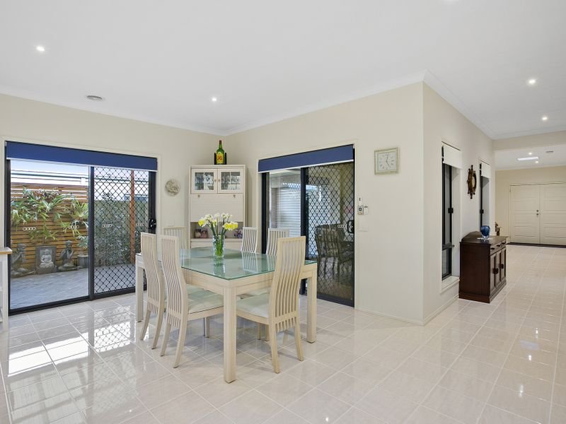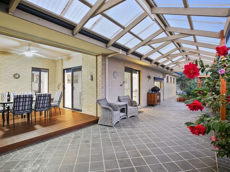 Two sets of sliding doors lead out onto a covered patio and enclosed spotted gum deck with motorised clear café blinds, allowing for perfectly integrated indoor/outdoor living and entertaining amongst the scented florals.