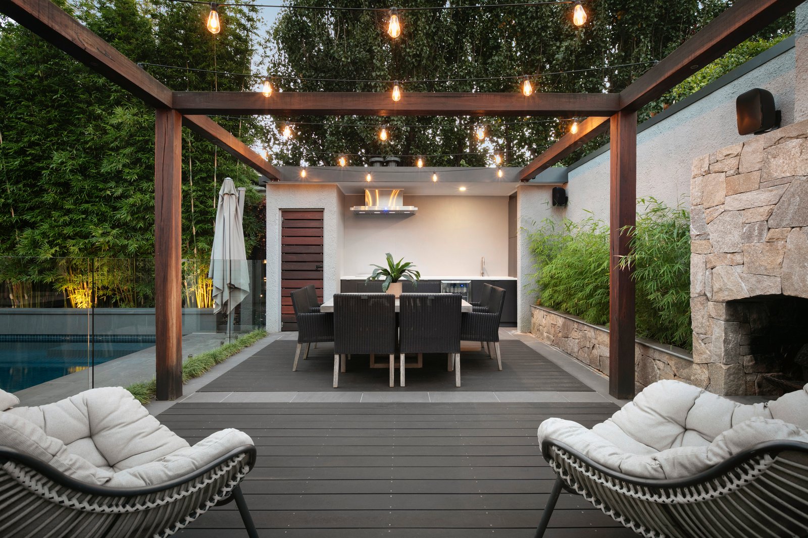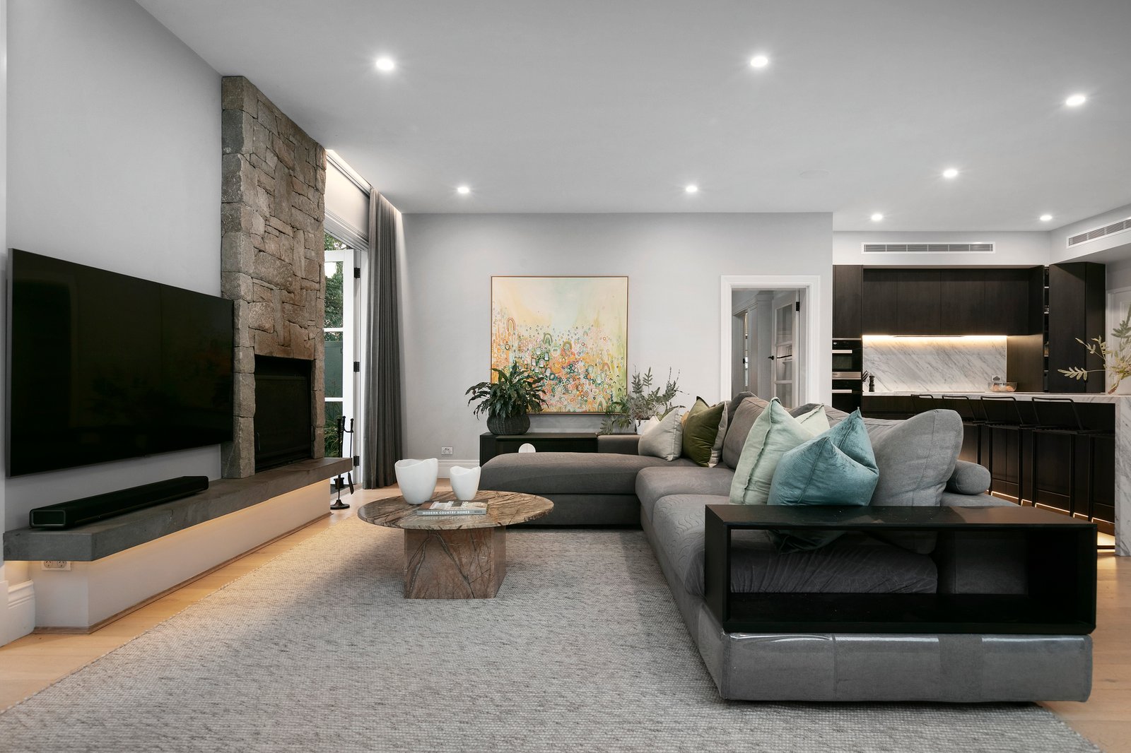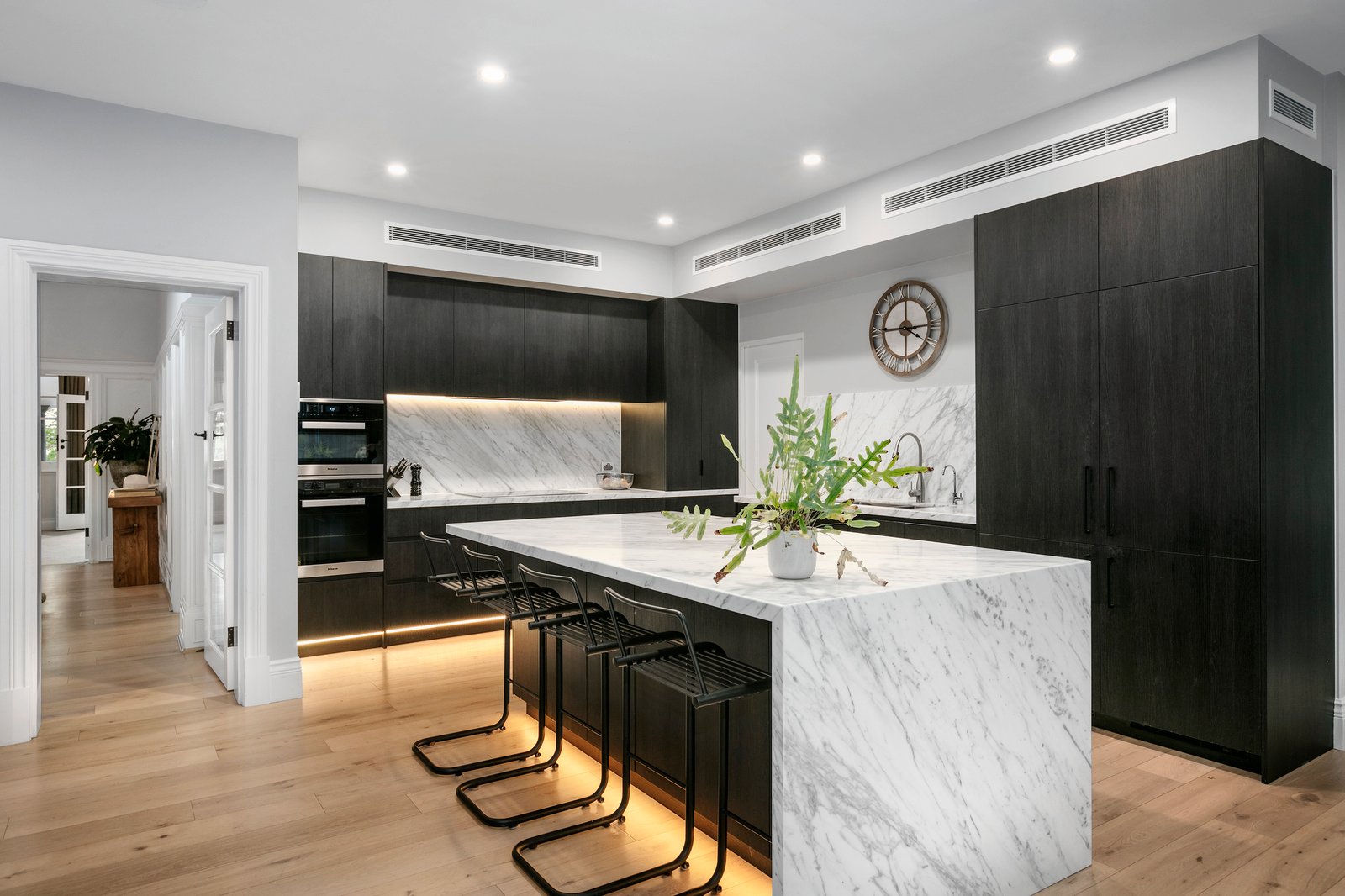 Experience the grandeur of the formal living and dining rooms where a gas fireplace with a dramatic marble surround makes a statement, while French doors connect to the front veranda and garden. Entertain in style, making the most of two distinct living zones, including the main open plan family living zone complete with an open fireplace, opening to the deck, lawn and fully tiled pool. Extensive use of marble features throughout the well-equipped kitchen that comes complete with a large central island bench, integrated Miele and Liebherr appliances and a brilliant dual butler’s pantry and laundry with wine fridges and an extra oven. An outdoor kitchen with inbuilt barbecue, sink and wine fridge adds to the appeal.