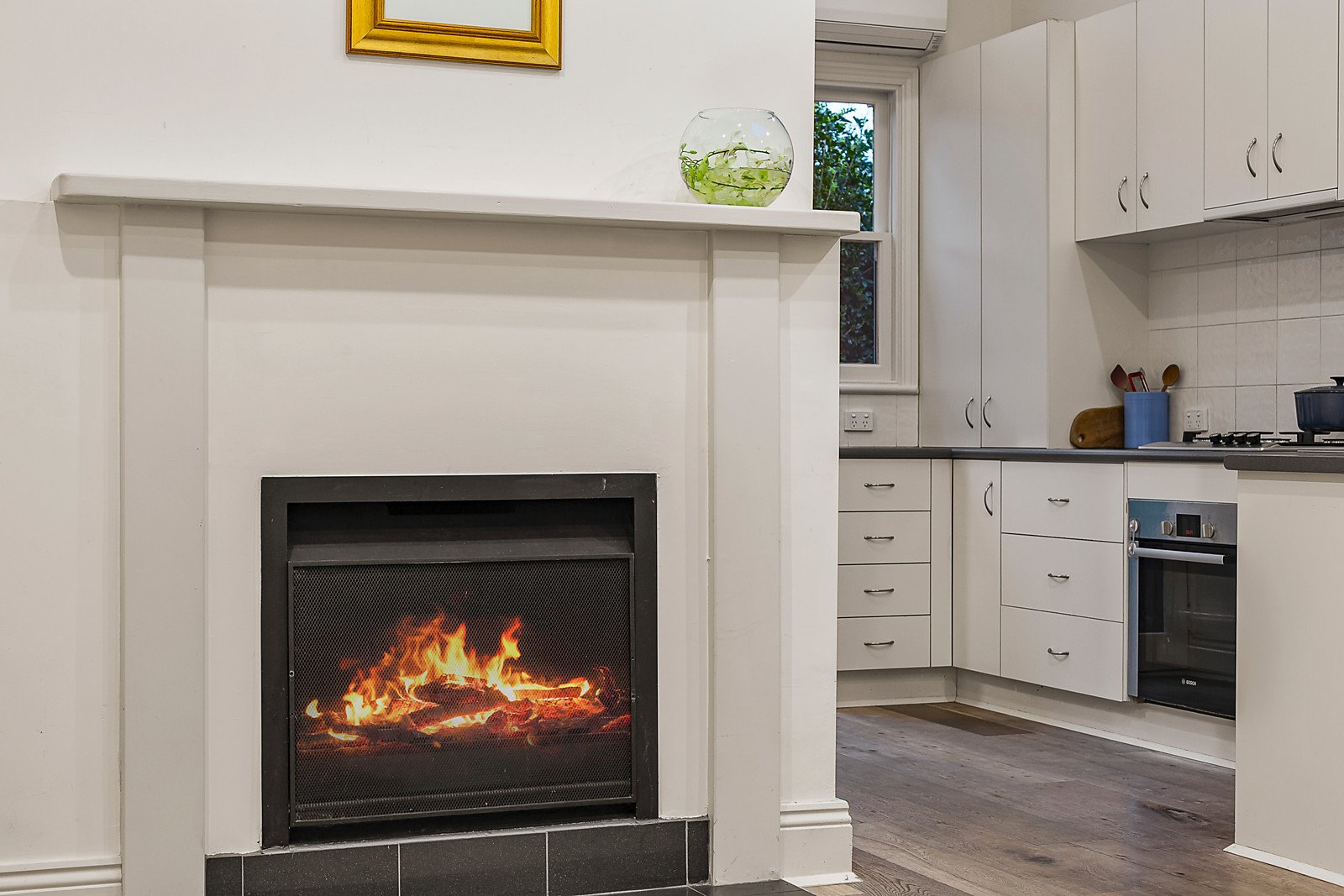 The arched hallway with its high ceilings introduces two beautiful bedrooms with open fires and built in robes and a stylish bathroom with Euro-laundry. Vaulted ceilings and wide oak floors accentuate the space and light in the generous open plan living and dining room with a modern Bosch appointed kitchen. The living area extends out to a northwest paved courtyard where surrounding lush hedges ensure complete privacy.