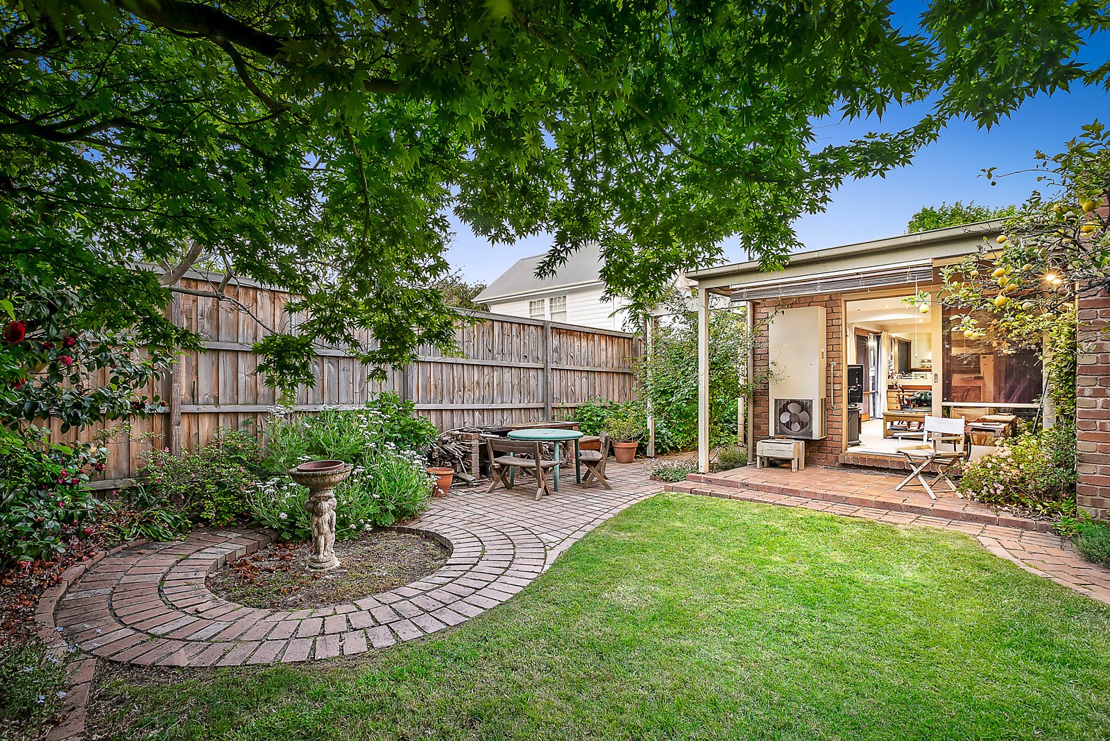 The wide entrance hall flows through to a study/4th bedroom and an expansive L-shaped sitting and formal dining room opening to north-facing vine covered terraces. The spacious capable kitchen and a generous family living and dining room open to a private northwest garden with shed and rear right of way. The main bedroom with built in robe and en suite is serenely set apart from two additional bedrooms with built in robes and a bathroom.