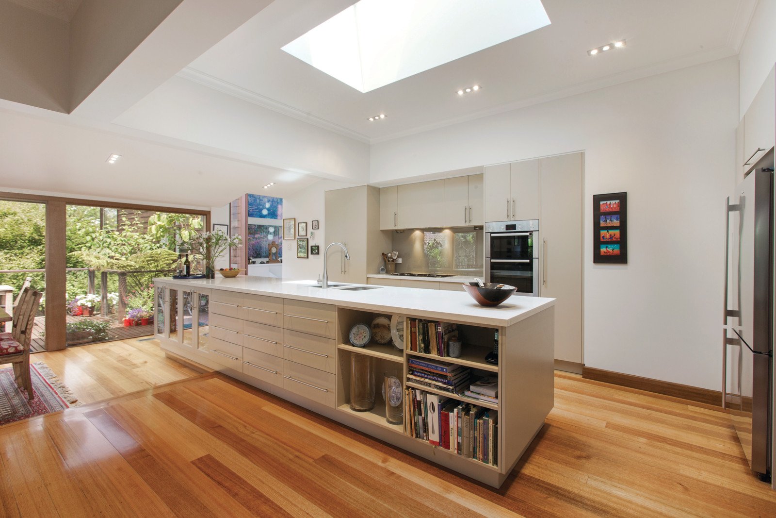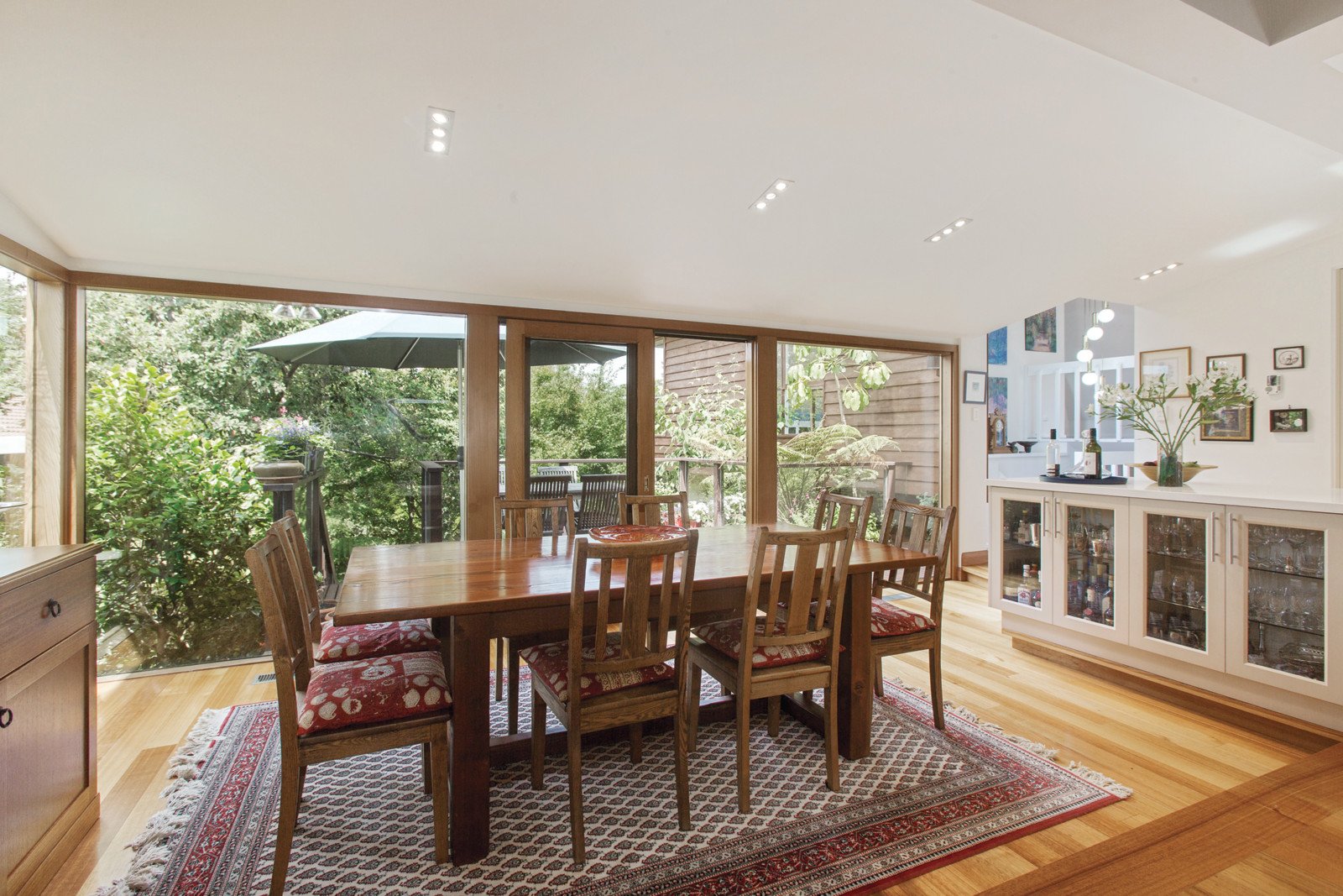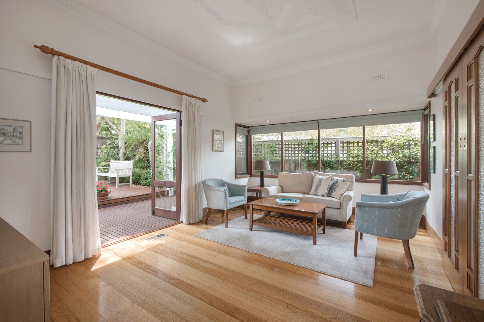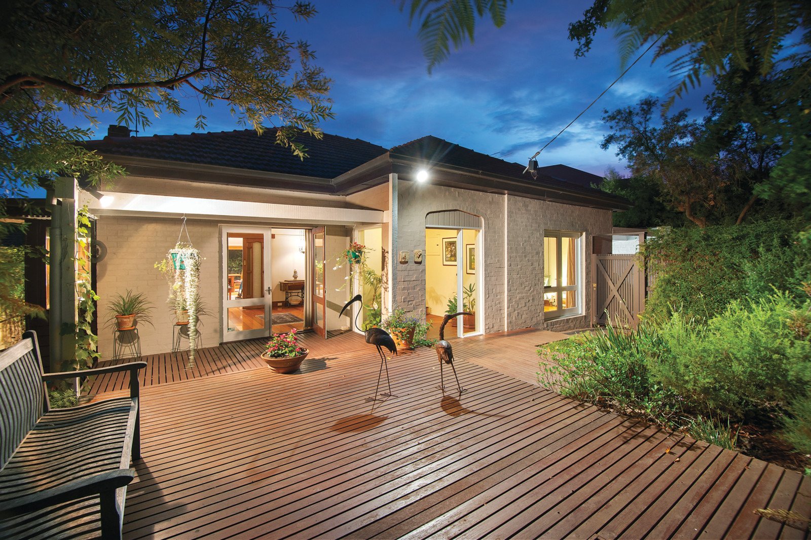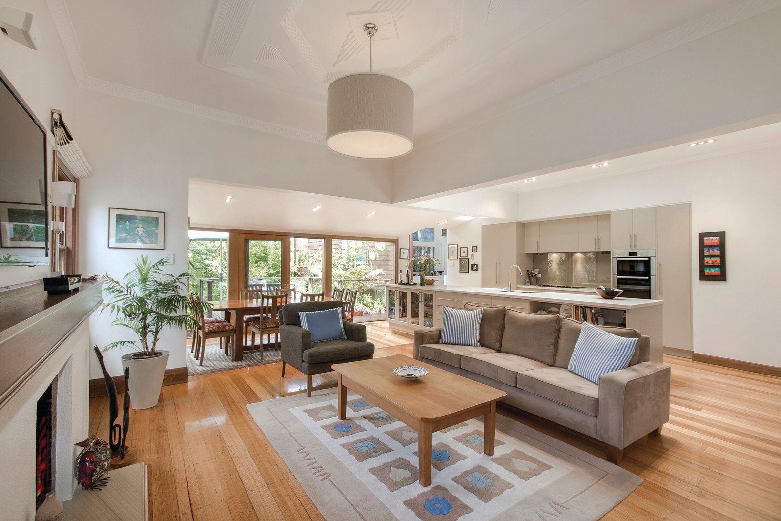 The Art Deco details showcased through the timber entrance hall are further reflected in the beautiful sitting room which opens to a private north-facing garden with deck and water feature. The expansive living and dining areas with a Deco OFP and sensational gourmet kitchen boasting stone benches and Bosch appliances also opens out to an elevated deck overlooking the deep private and leafy native garden. The main bedroom with lavish en-suite and walk in robe is complemented by a separate wing comprising three additional bedrooms, a fitted study and second bathroom.