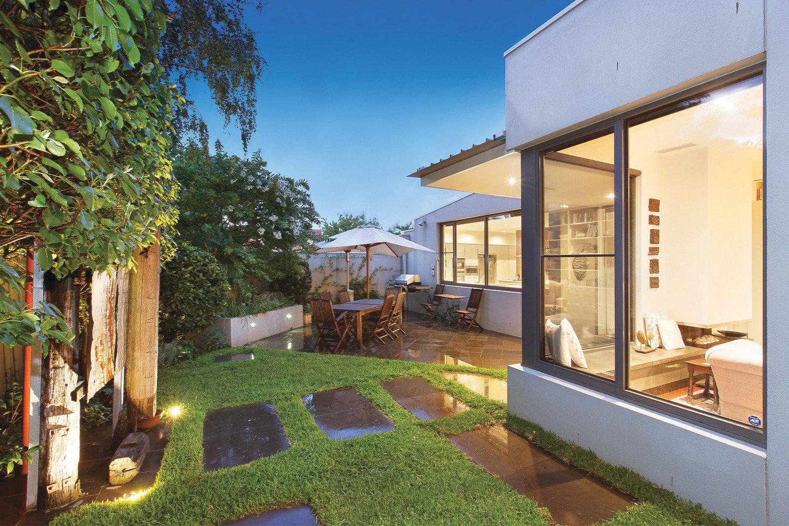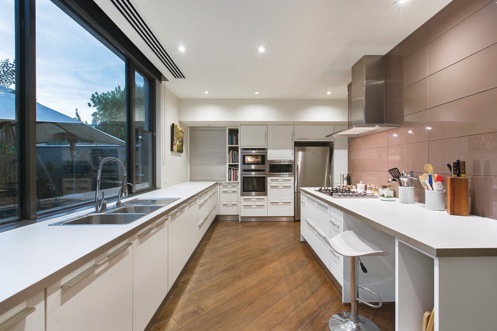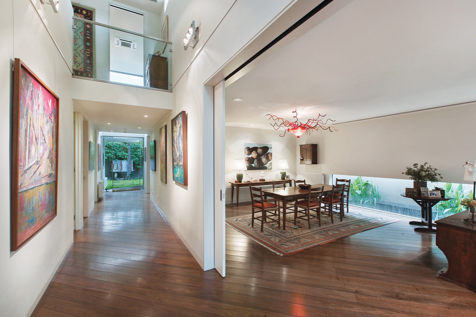 Beneath a soaring double height ceiling, wide recycled Messmate floors flow through a dramatic gallery to a palatial sitting and dining room overlooking a tranquil pond and opening to the lush private landscaped north garden. Equally spacious, the light-filled living room and exceptionally well appointed gourmet kitchen with butler's pantry overlook a leafy private garden with BBQ and bluestone terrace. A lavishly proportioned main bedroom with bespoke walk in robe and en-suite open to a glorious north-facing terrace while upstairs there is a second double bedroom with built in robe and stylish en-suite, third bedroom with built in robe, a designer bathroom and study or 4th bedroom. On the lower level, advantaged by its own private entrance, is a large multi purpose office/recreation room or 5th bedroom with powder-room, kitchenette, cellar/store-room and private courtyard.
