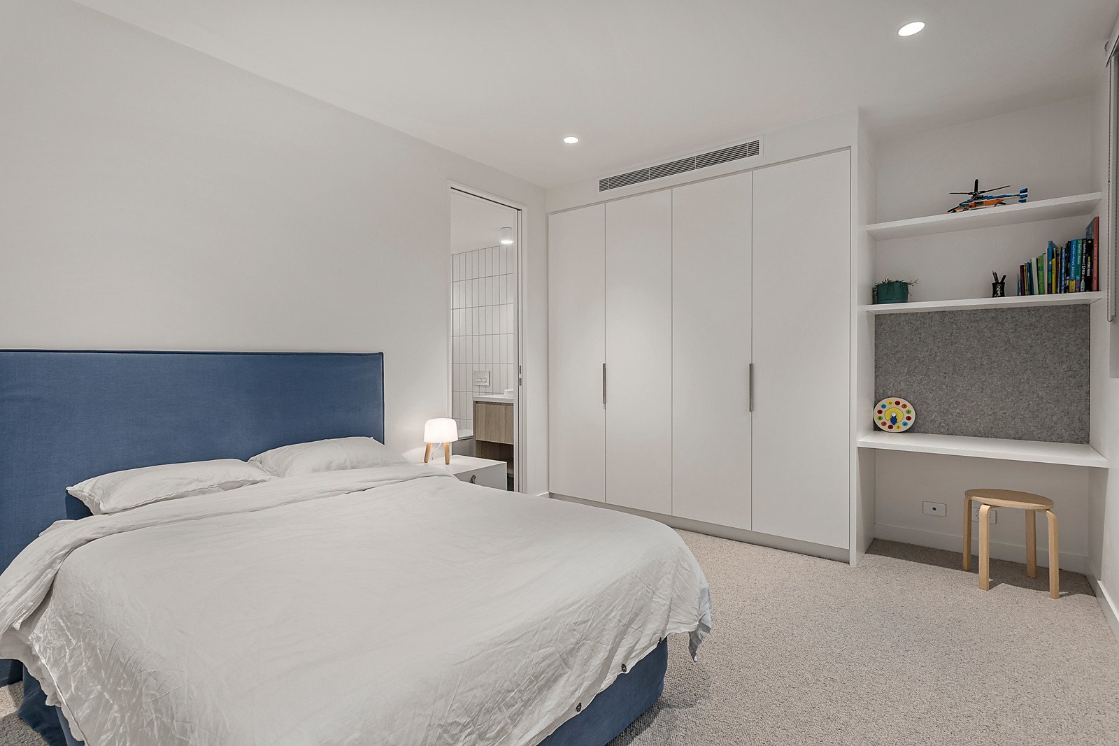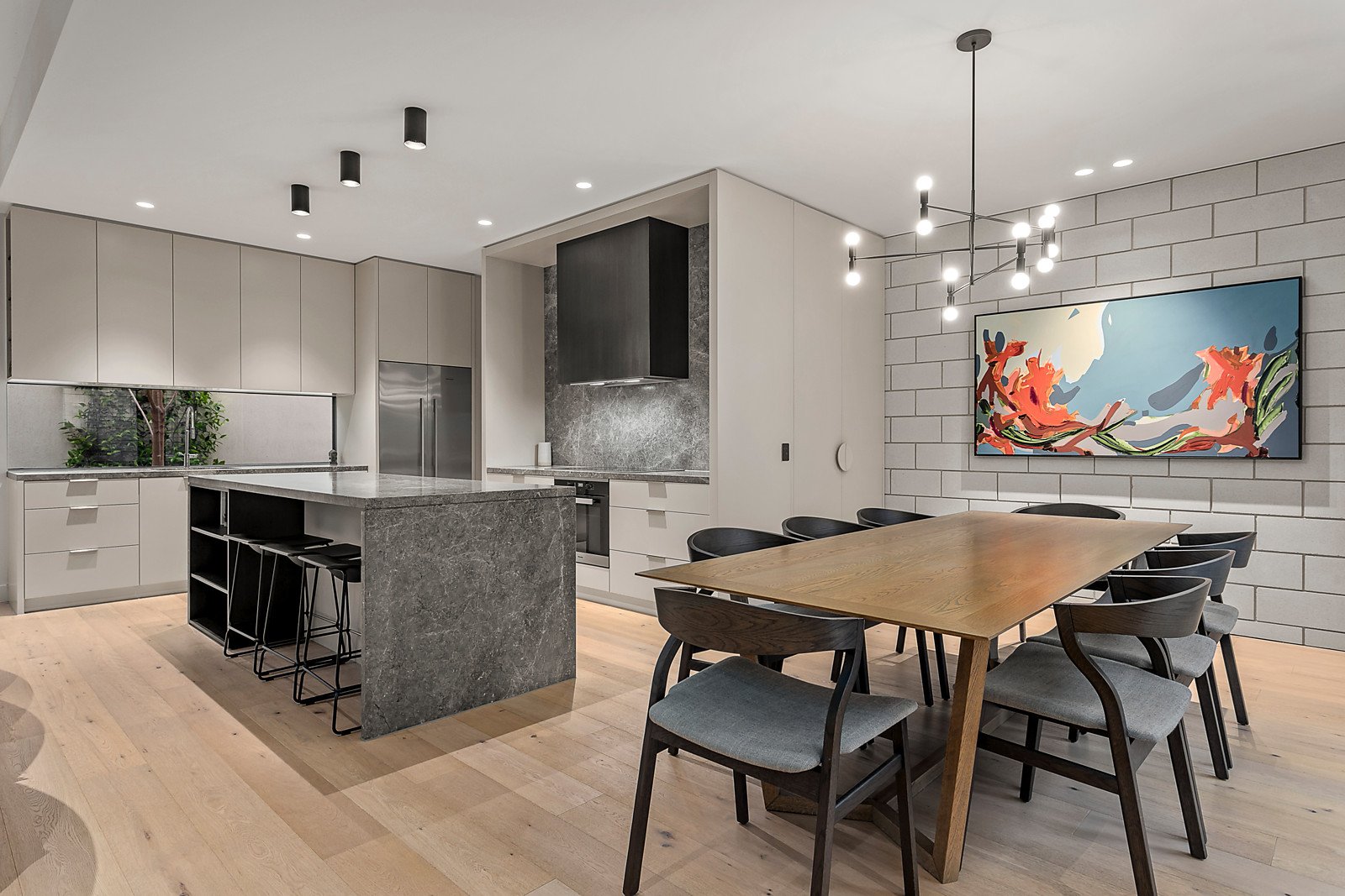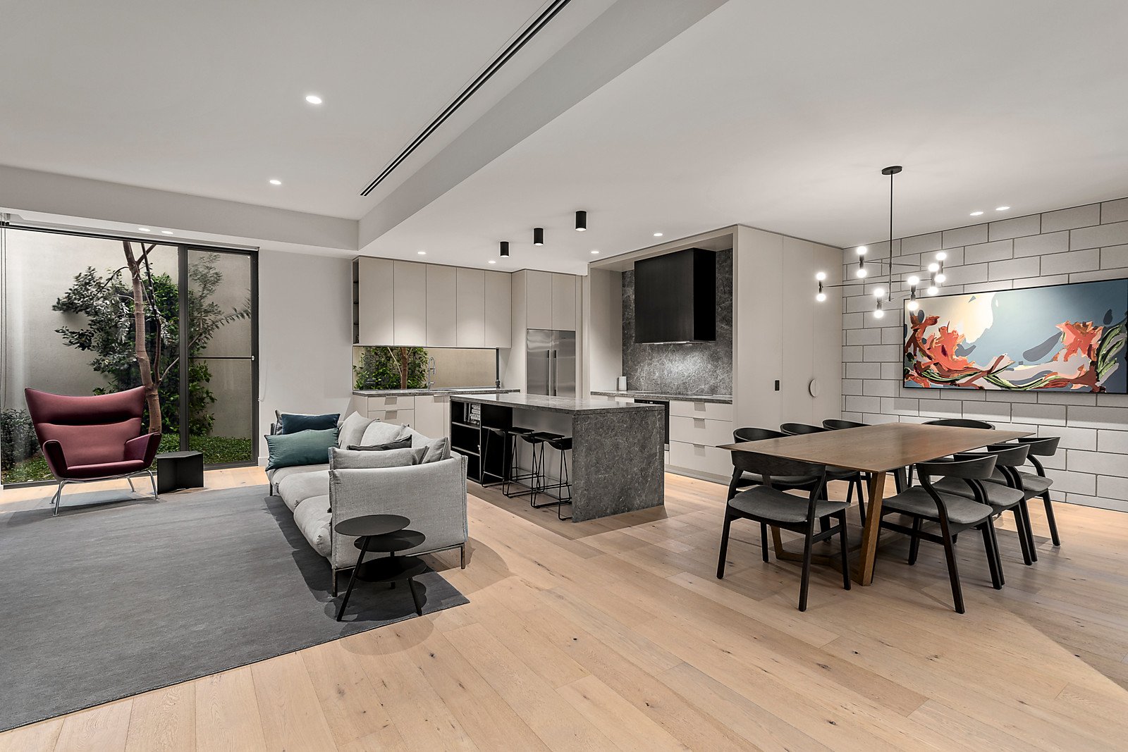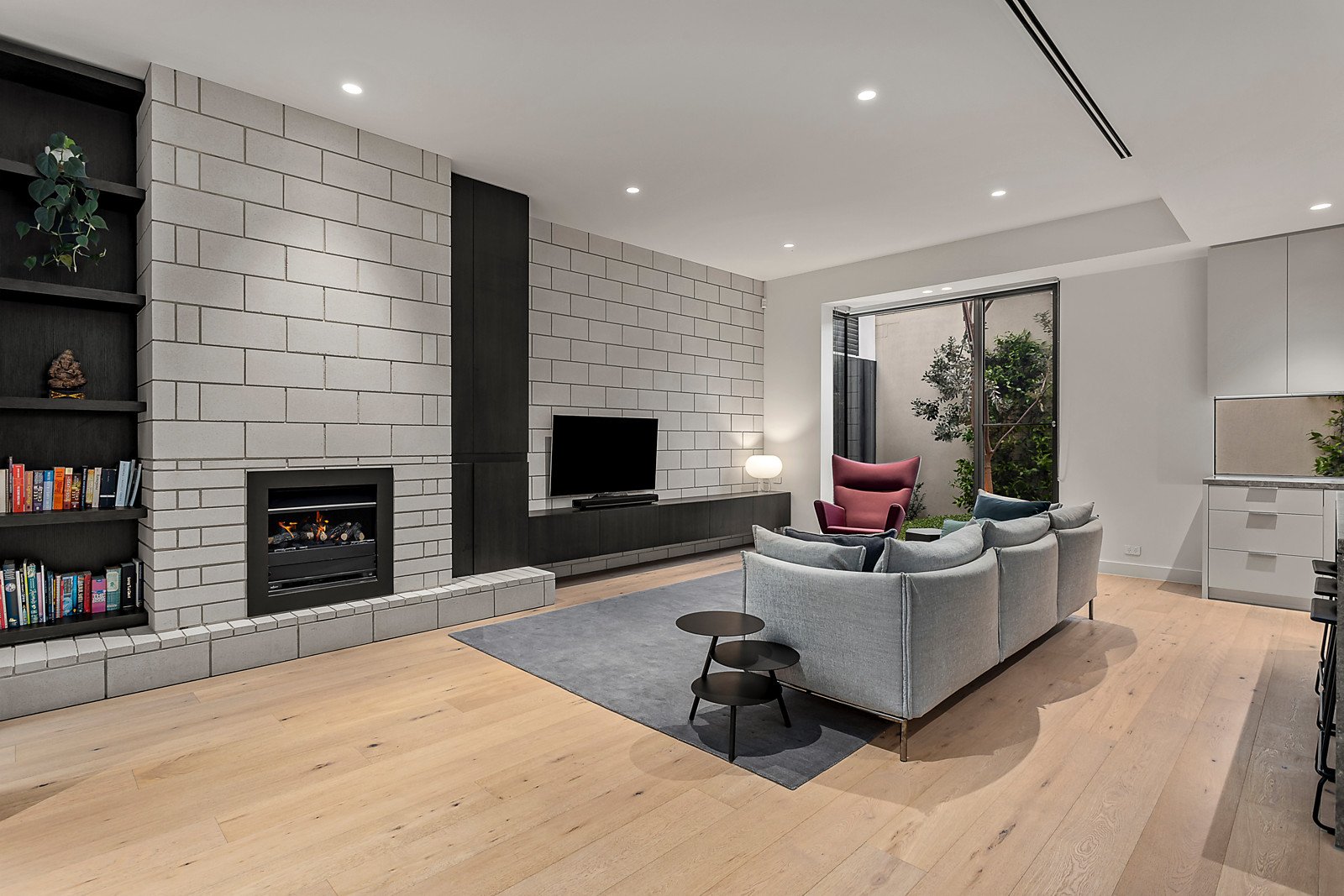The open plan family hub plays the perfect host with a chic colour palette, feature blockwork, gas fire place and stylish lighting. High ceilings in the living area, a generous dining space and a designer kitchen with butler's pantry makes for effortless living. Beyond a full height sliding door is a private, paved courtyard for quiet relaxation or alfresco entertainment. The first floor delivers a sophisticated master bedroom with walk-in robe and deluxe ensuite, two generous robed bedrooms with shared bathroom plus a family retreat. Completed with ground floor guest bedroom and bathroom, laundry with outdoor access, internal remote control double garage, abundant storage, high-end finishes and elegantly landscaped gardens, this home has broad appeal for those seeking an easy-care, luxurious lifestyle. State-of-the-art extras include zoned and integrated heating/cooling, Miele appliances, integrated Fisher & Paykel fridge, bespoke joinery, solar panel system and security alarm system. Enviably positioned in a vibrant locale close to parks, prestigious schools and transport.