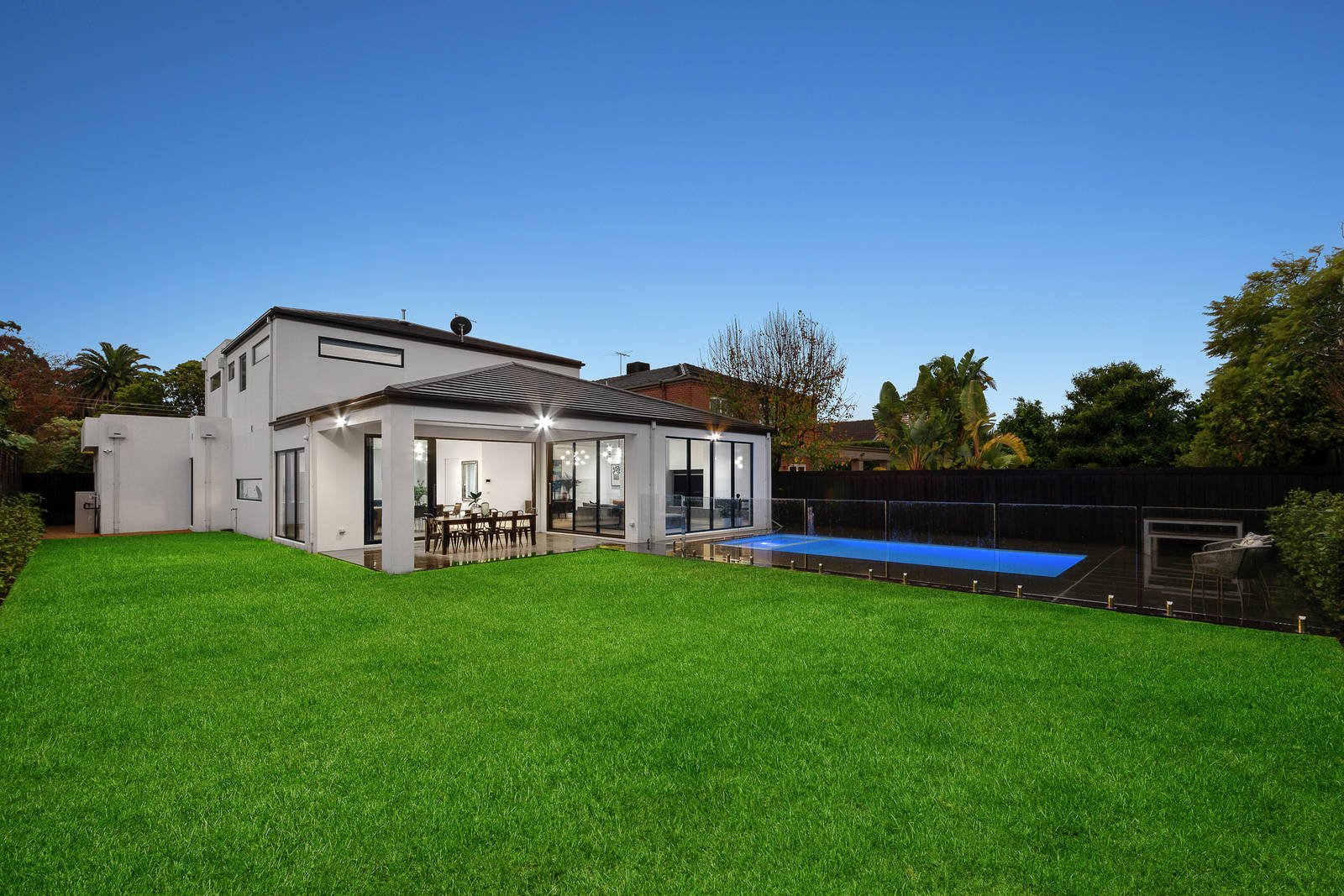 Defined by an exemplary level of design and finish, this architecturally striking near new contemporary residence's breathtaking scale, brilliant zoning and landscaped garden and pool setting create a family environment that is in a class of its own. The impressive pivot door, double height entrance and broad central gallery are preludes to the exceptional proportions throughout. Limed Oak floors flow through the hall to a fabulous media room, a state of the art gourmet kitchen appointed with Miele appliances, butler's pantry and stone benches, a light-filled dining area and expansive living room with an electronic ignition gas/pebble fireplace. Stacking glass sliders open the living/dining spaces to a large covered al fresco terrace and the deep private landscaped garden with a picturesque solar heated, smart-phone connected pool and spa. The beautiful main bedroom with walk in robe and lavish ensuite with a freestanding bath is serenely positioned downstairs overlooking the garden while a sensational children's zone upstairs comprises a second bedroom with ensuite and walk in robe, two additional bedrooms with walk in robes, a home office or 5th bedroom with robes, a stylish third bathroom with convenient separate powder-room and a retreat.