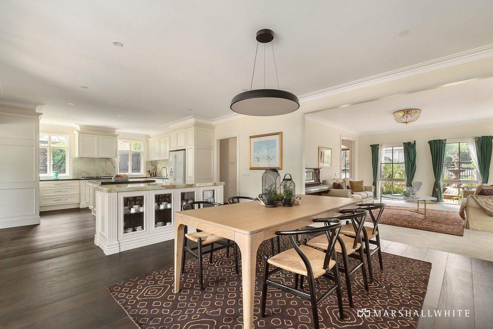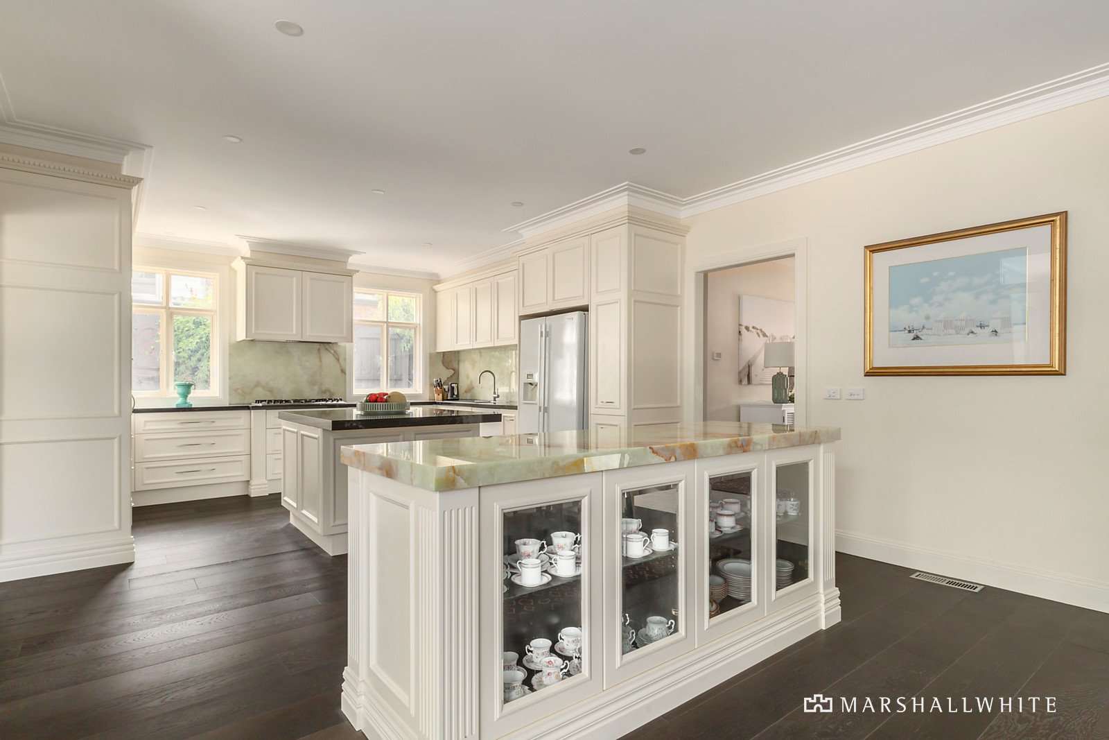 Dark oak parquetry floors add a richness to the wide entrance hall which flows through to a gracious sitting room and fitted home office. The dark oak floors continue in the sublime gourmet kitchen appointed with stone benches, solid Onyx splash-backs and European appliances and the evocative dining room boasting bespoke Onyx topped cabinetry. An expansive separate living room with open fireplace is ideal as a media room with surround sound. The dining area opens to a large undercover terrace and the deep private northwest facing leafy garden and solar heated pool. Generous family accommodation upstairs comprises the opulent main bedroom with walk in robes and designer en suite, a second spacious bedroom with retreat area and built in robe, two additional double bedrooms with robes and a stylish bathroom with freestanding bath.
