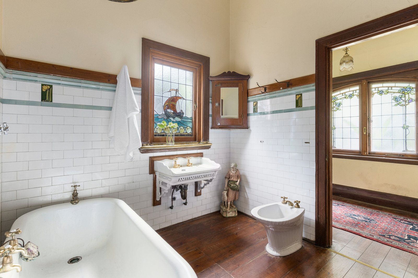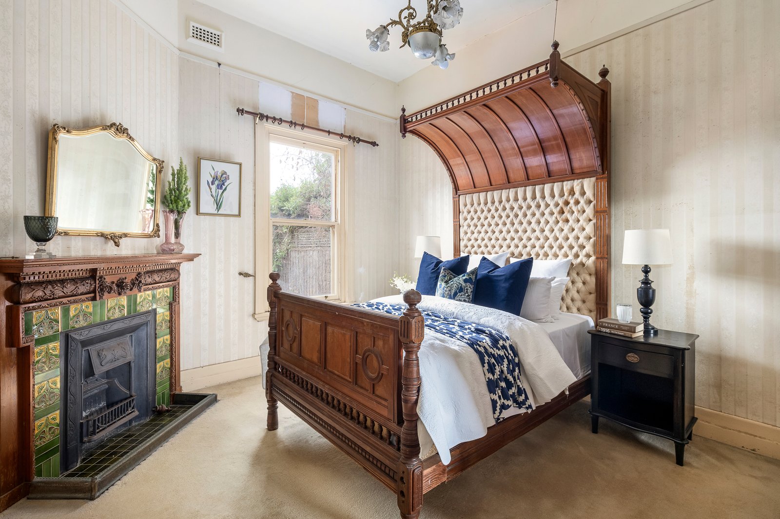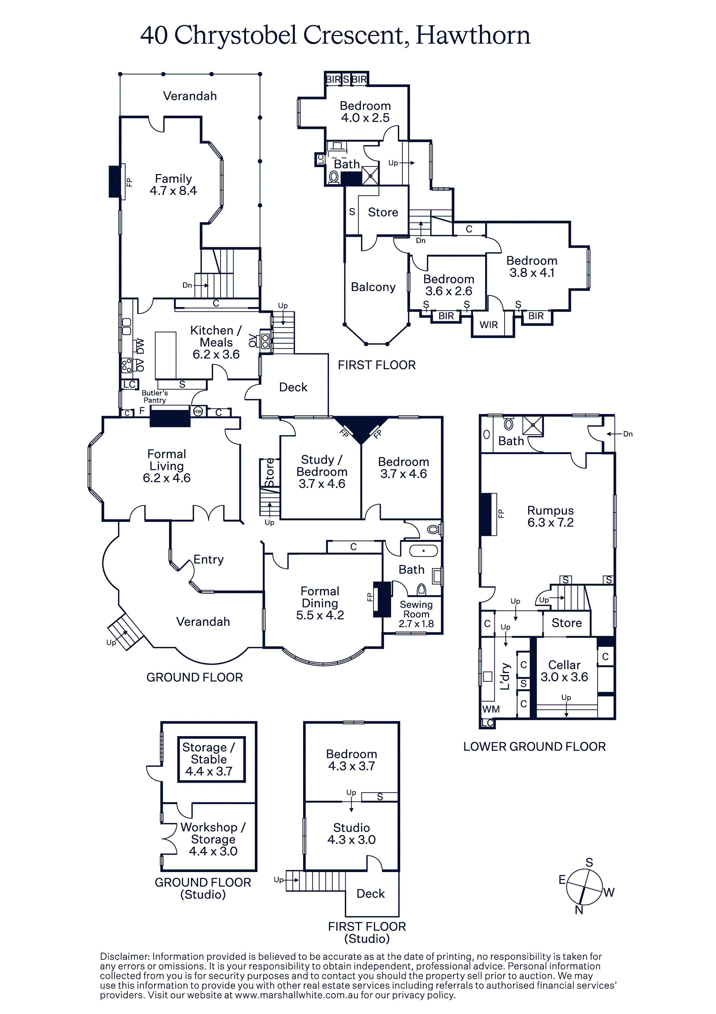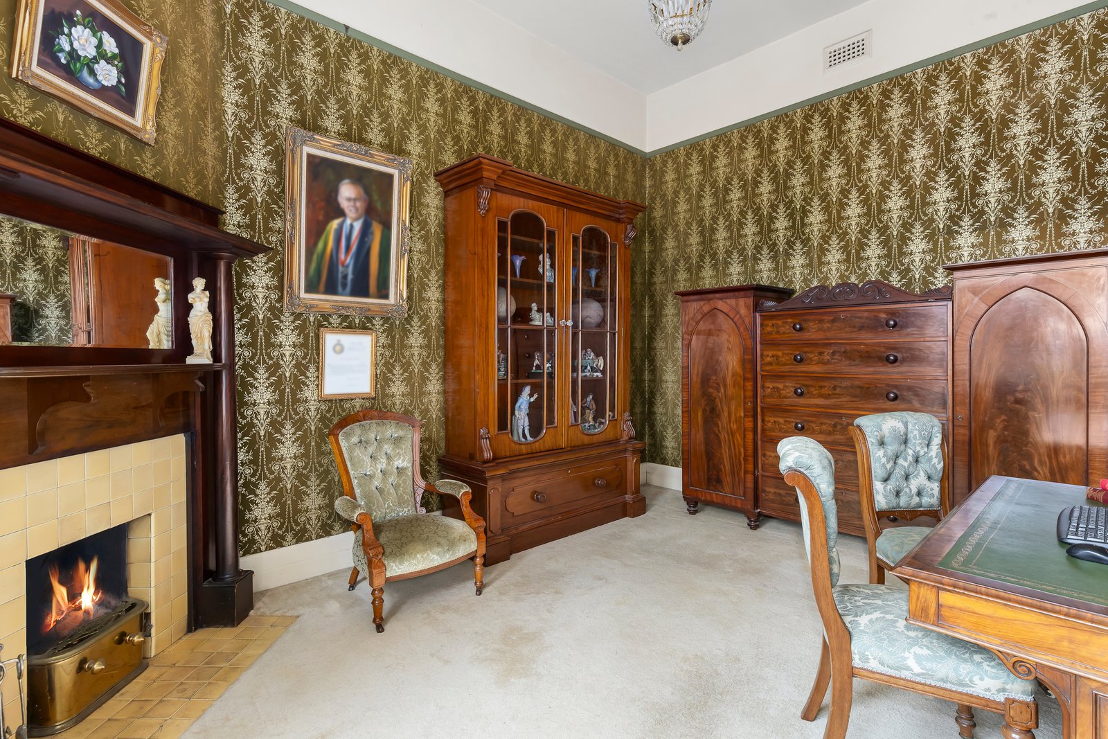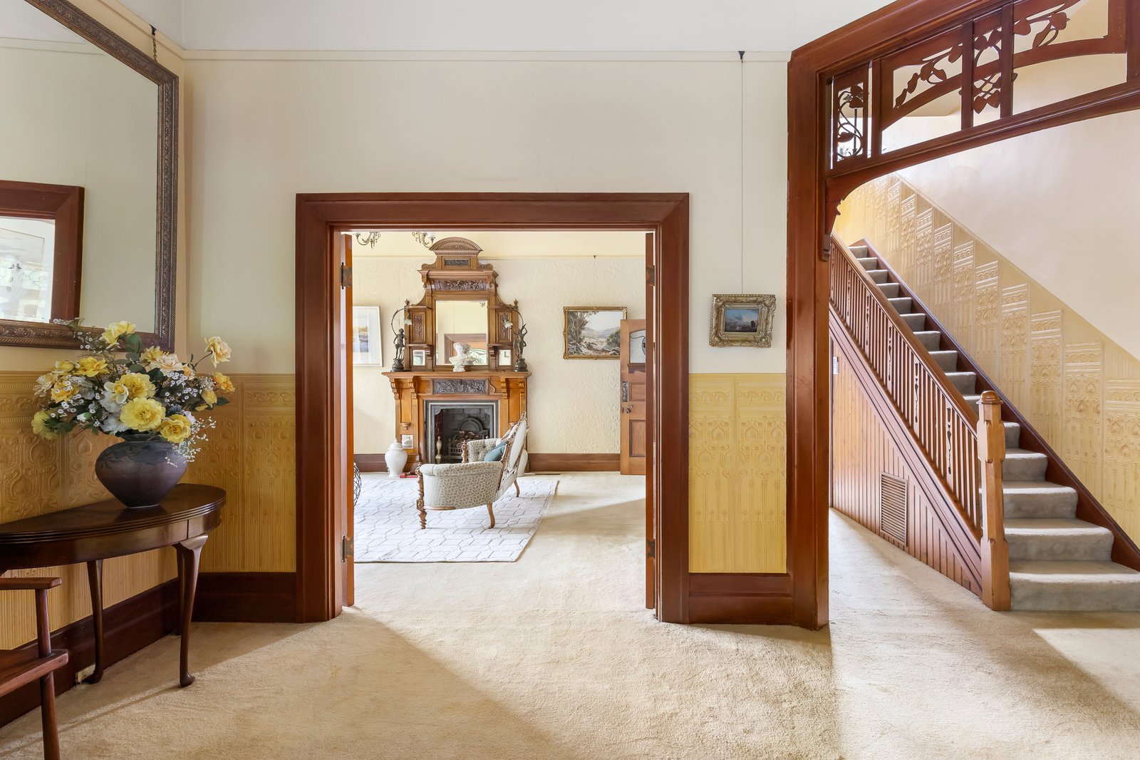 Set behind an expansive mosaic tiled verandah, the majestic entrance hall, grand sitting room, gracious formal dining room and refined library/executive study are all adorned with elaborate leadlight windows, decorative high ceilings, open fireplaces and imported French dados. The well-appointed timber kitchen includes a casual dining area and the original woodfire stove. The generous family room with an open fire is matched by a lower-level living/recreation room also with an open fire. A downstairs bedroom with fireplace and period style bathroom are accompanied upstairs by three additional bedrooms with built in robes, a pristine bathroom and large undercover balcony offering leafy views. The exceptionally spacious northeast oriented gardens with pool, spa and off street parking via the rear lane encompass 2-storey stables with the original stalls and workshop while above there is a bedroom, studio and balcony.