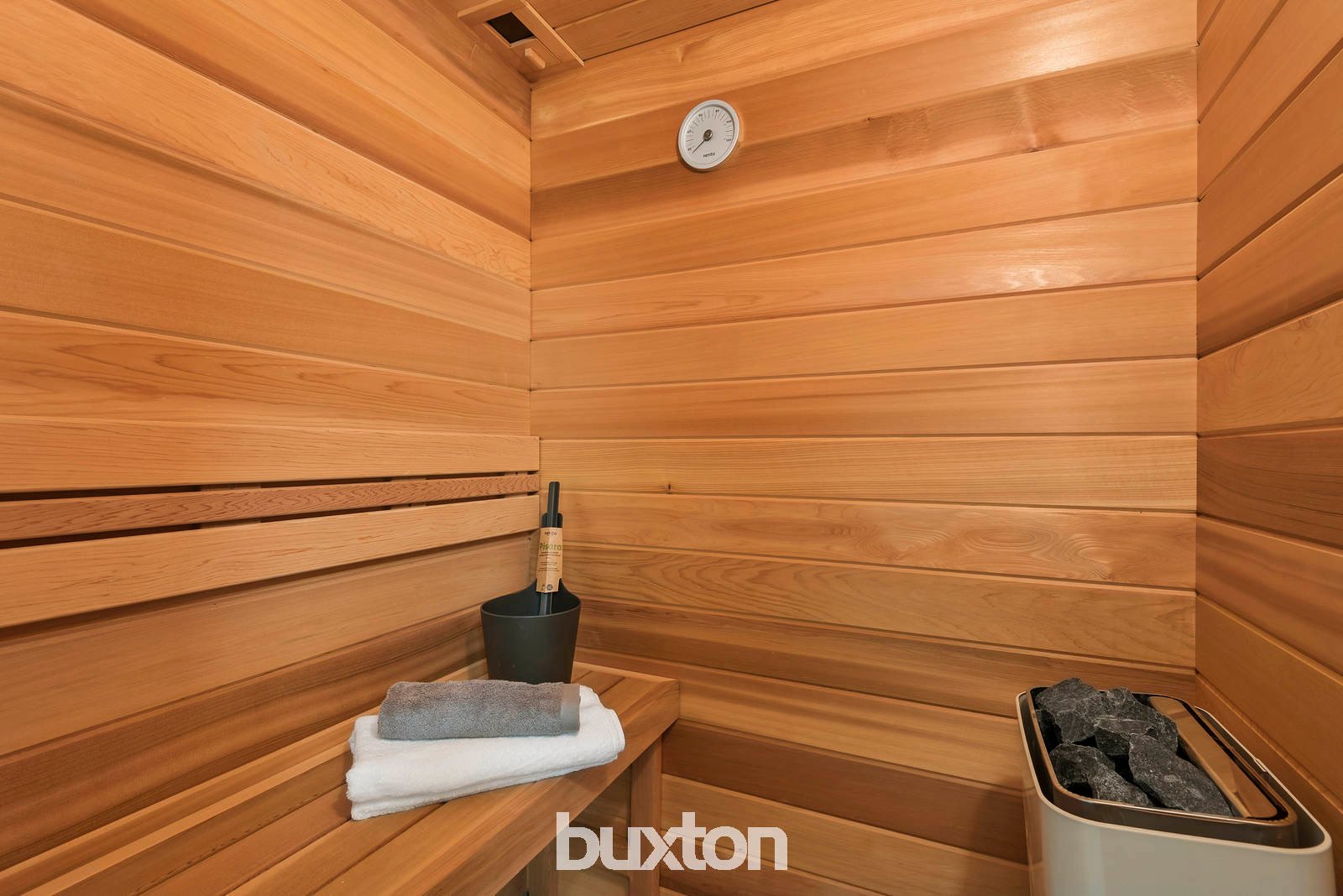 Delivering outstanding luxury on an easy-care block, fine appointments include European Oak parquetry, three-zone central heating/air-conditioning, ducted vacuum, security cameras and a sauna in the double auto garage.