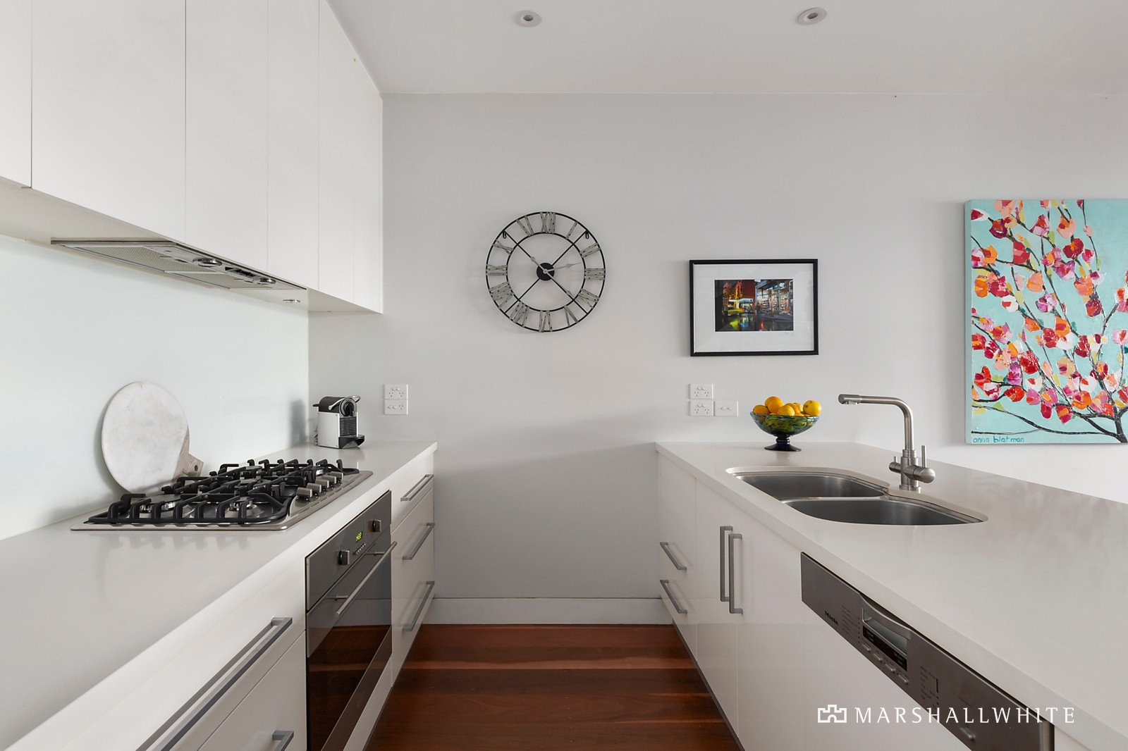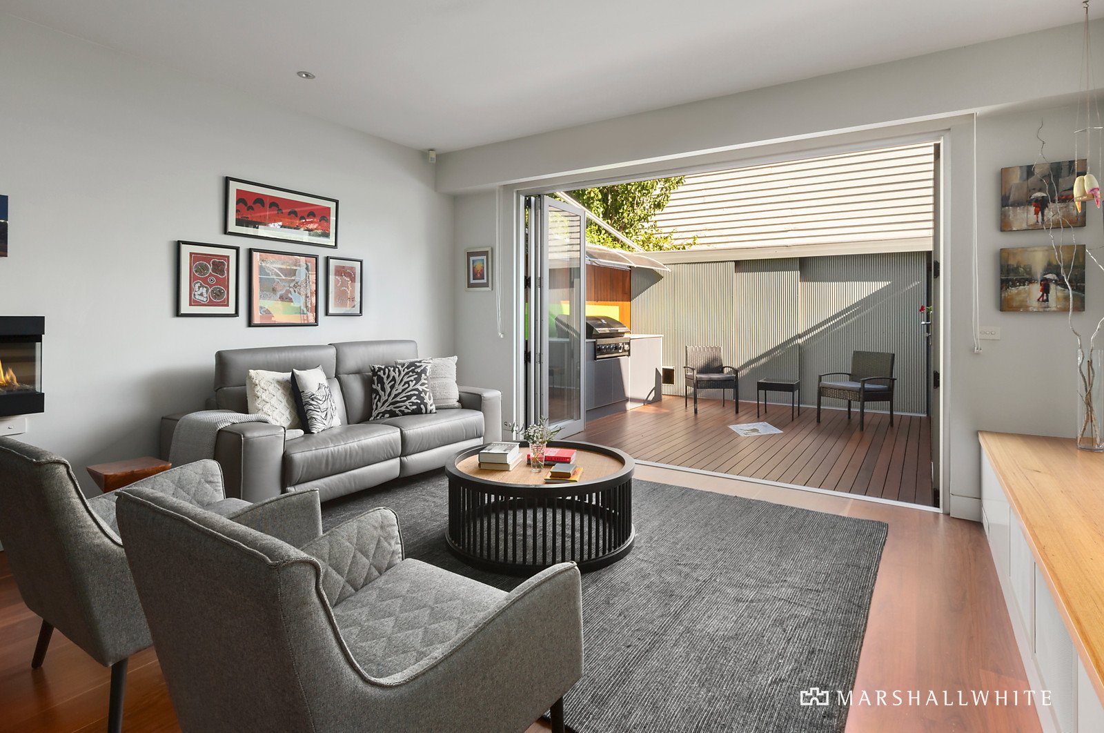 A traditional arched hall featuring high ceilings and Spotted Gum floors introduces a beautiful double bedroom with fireplace and ornate period features, a second double bedroom with robes and a stylish bathroom with bath. A stunning main bedroom suite upstairs includes a chic en suite, balcony, built in robes and a home office/retreat or possible 4th bedroom. The timber floors flow through the expansive open plan living and dining room with an electric fireplace and gourmet kitchen appointed with European appliances and stone benches. Bi-fold doors open the living completely to a large decked courtyard with built in BBQ and remote sun-awning, a wonderful venue for year-round al fresco dining.