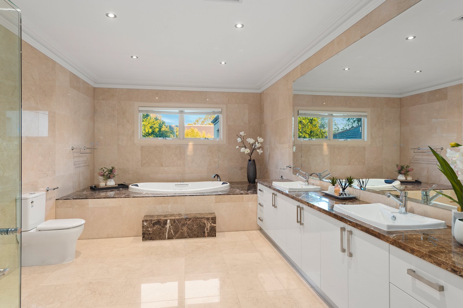 Each of the bedrooms is an impressively scaled pamper zone with walk-in or built-in robes – three also with fully-tiled five star ensuites and the remaining two sharing semi-ensuite access to another similarly vogue bathroom – plus there is a decadent spa bath in the main ensuite. As expected in a home of such high quality, the list of inclusions is extensive, offering also a double lock-up garage with internal access to the main home and secure driveway parking for another two vehicles, plus there is secure video entry, CCTV surveillance and a security alarm, as well as ducted heating and air conditioning.
