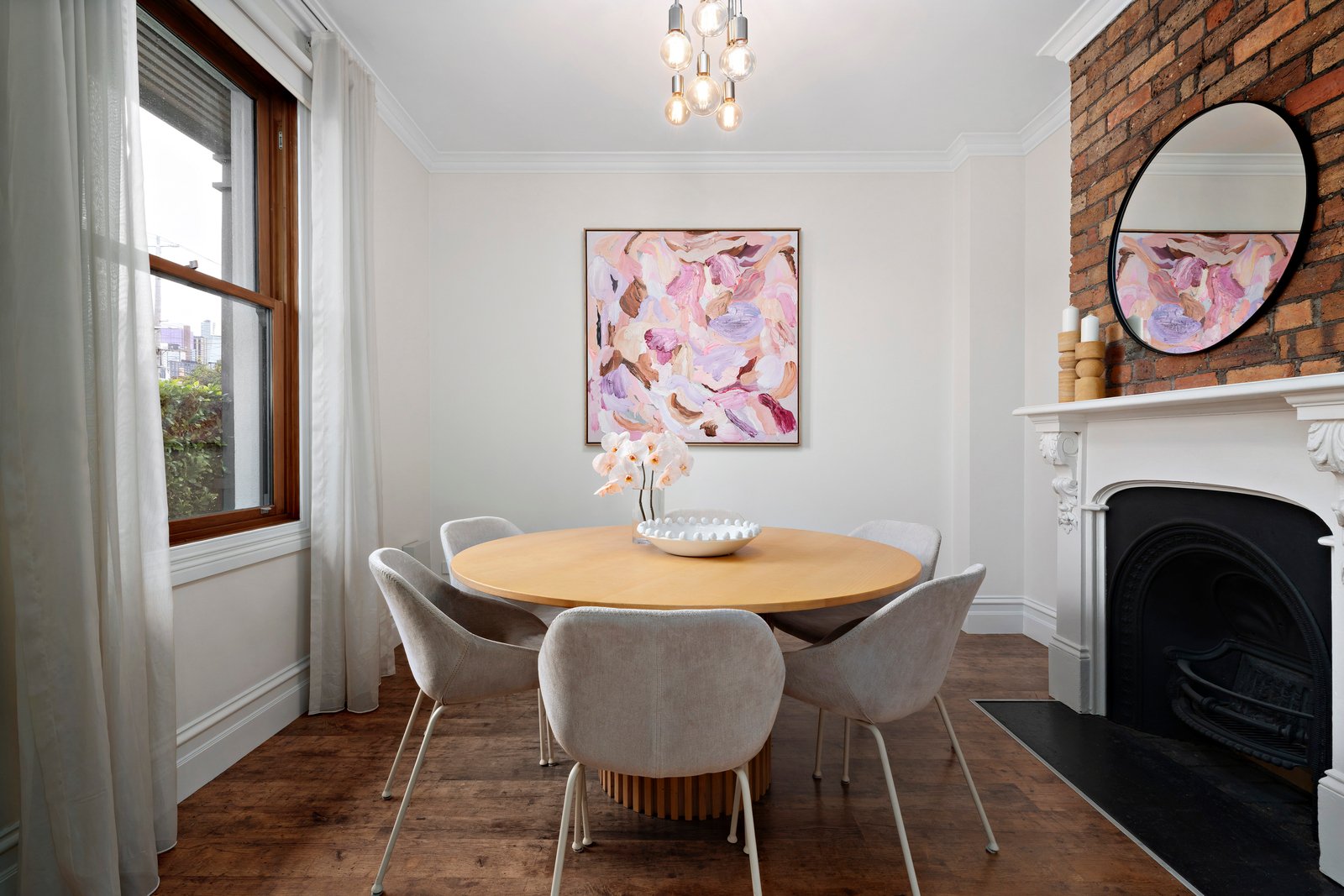 Designer updates elevate the hallmark character of exposed brick and period beauty inside, with a traditional hallway opening to a dining room before expanding into an open-plan domain made for large-scale indoor-outdoor living. Appointed with a classic Ilve 900mm stove, a Miele dishwasher and an integrated Liebherr fridge/freezer, the stone-bench kitchen stands against an original brick wall with striking effect, extending through the living and dining spaces where full-width bi-fold doors sweep open on two sides to a decked courtyard. Established pear trees and low-maintenance landscaping create a sensational, private setting for year-round entertainment, featuring a raw-edge timber bar and ample space for the BBQ.