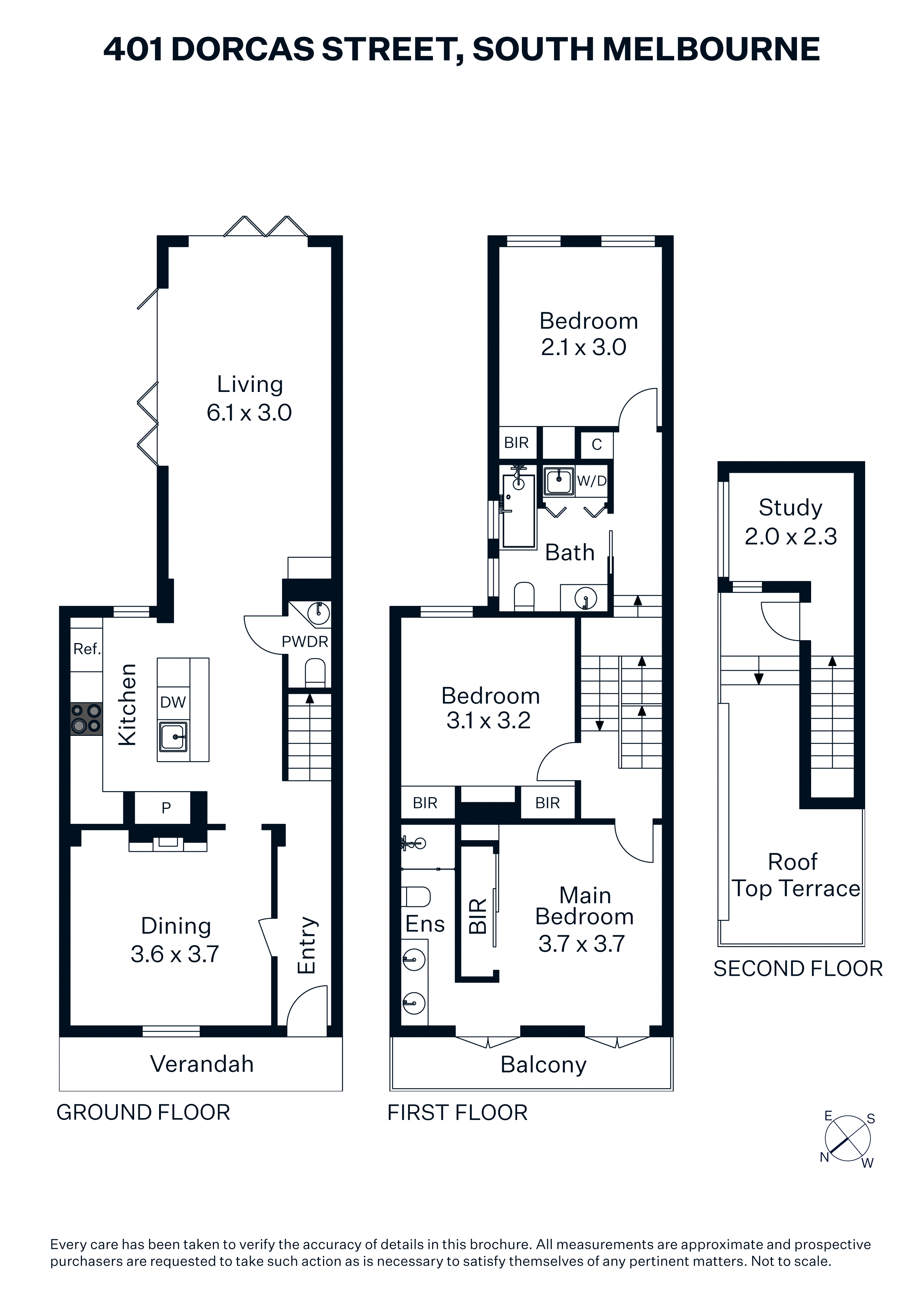 Upstairs, the north-facing main bedroom boasts a panoramic city view from its balcony and features a refined en-suite and built-in robes, followed by two additional bedrooms with built-in robes and a central family bathroom equipped with European laundry facilities. Further up, there’s a fantastic landing space perfect as a home office, opening to a rooftop terrace, where uninterrupted views of the city lights backdrop unparalleled entertainment high above the streetscape.