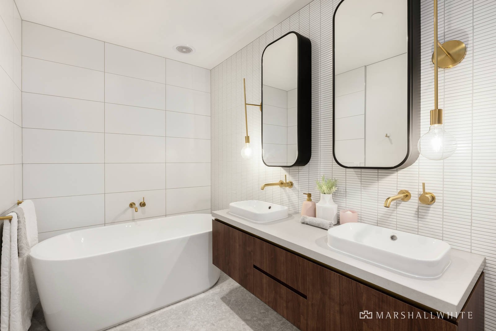 The state-of-the-art kitchen features stone waterfall benches and splashbacks and fully integrated Miele appliances. The generous open-plan living area with low-line gas fireplace extends to a stunning wrap-around balcony, ideal for entertaining. There are three bedrooms, including a spacious master suite. Bathrooms feature warm walnut cabinetry, the main also with a deep soaking tub.