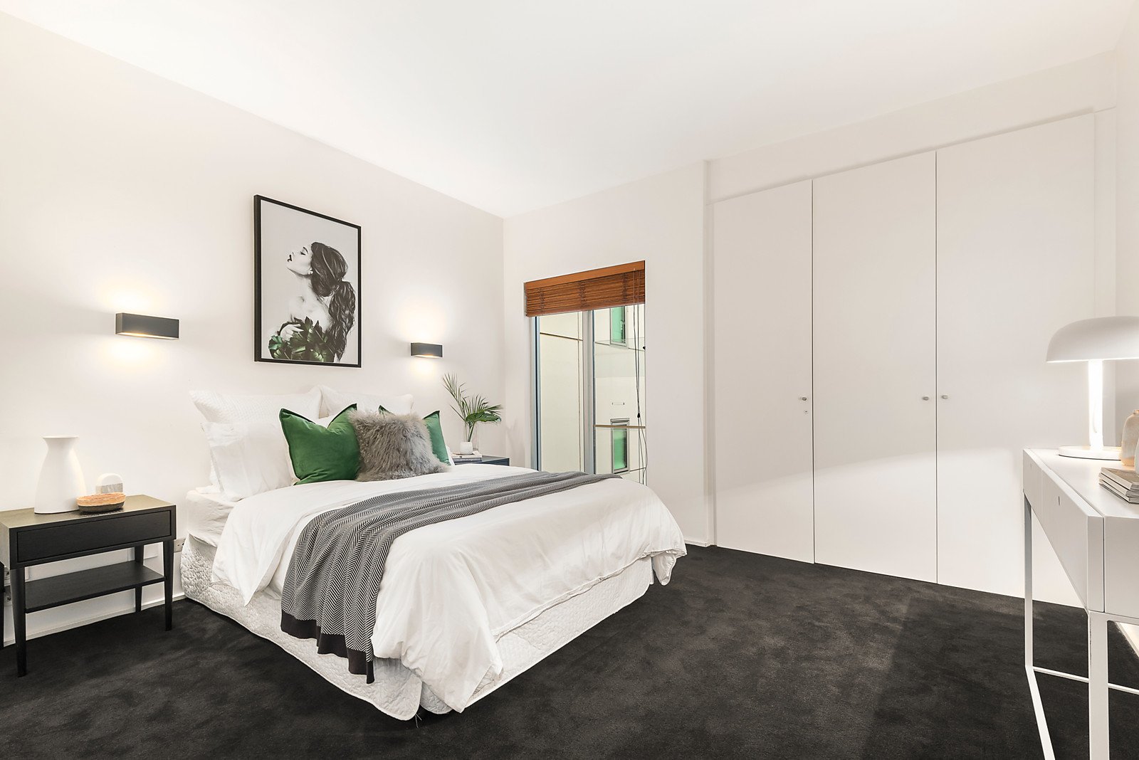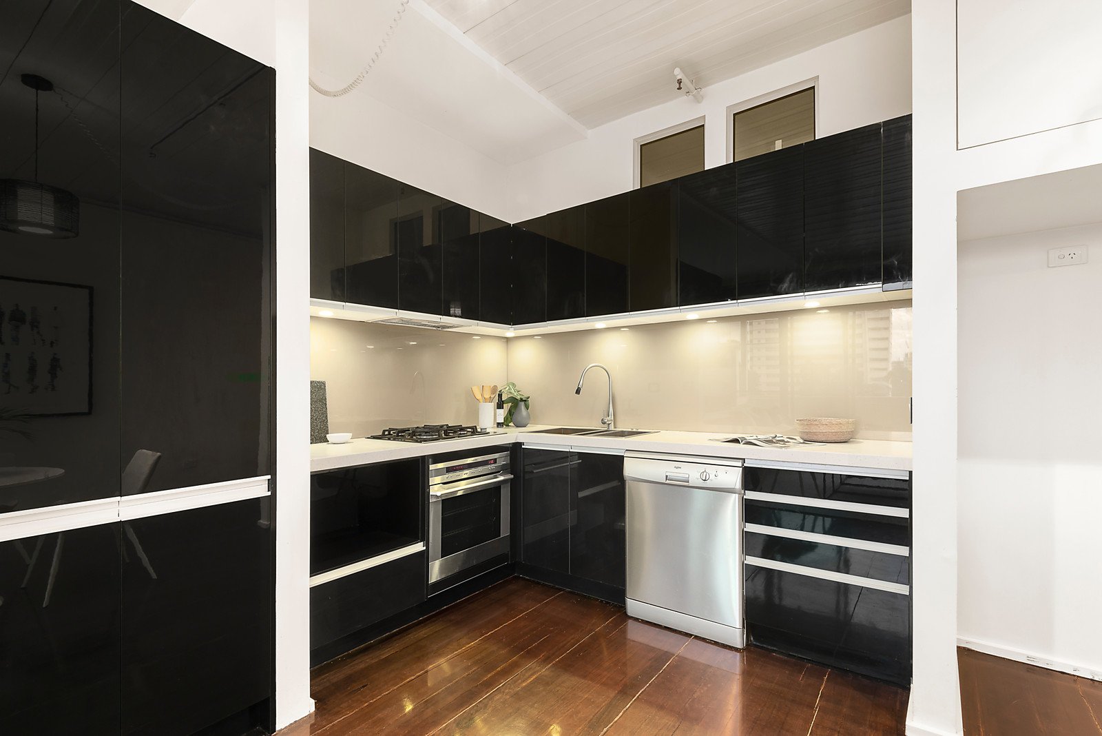 The home reveals huge, original, floor-to-ceiling windows and exposed pipework as it flows to a remarkably spacious Caesar Stone kitchen and open-plan living, where striking black cabinetry, stainless steel appliances, a bar, a sunny balcony and the city skyline form a dramatic combination. Black polished timber floors underline the warehouse characteristics of this highly secure home with intercom entry, basement parking, elevator access, a marble-topped bathroom with separate wc, plus robes in each bedroom, split system heating / cooling and ceiling fans.