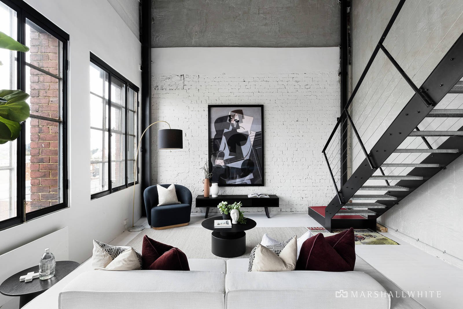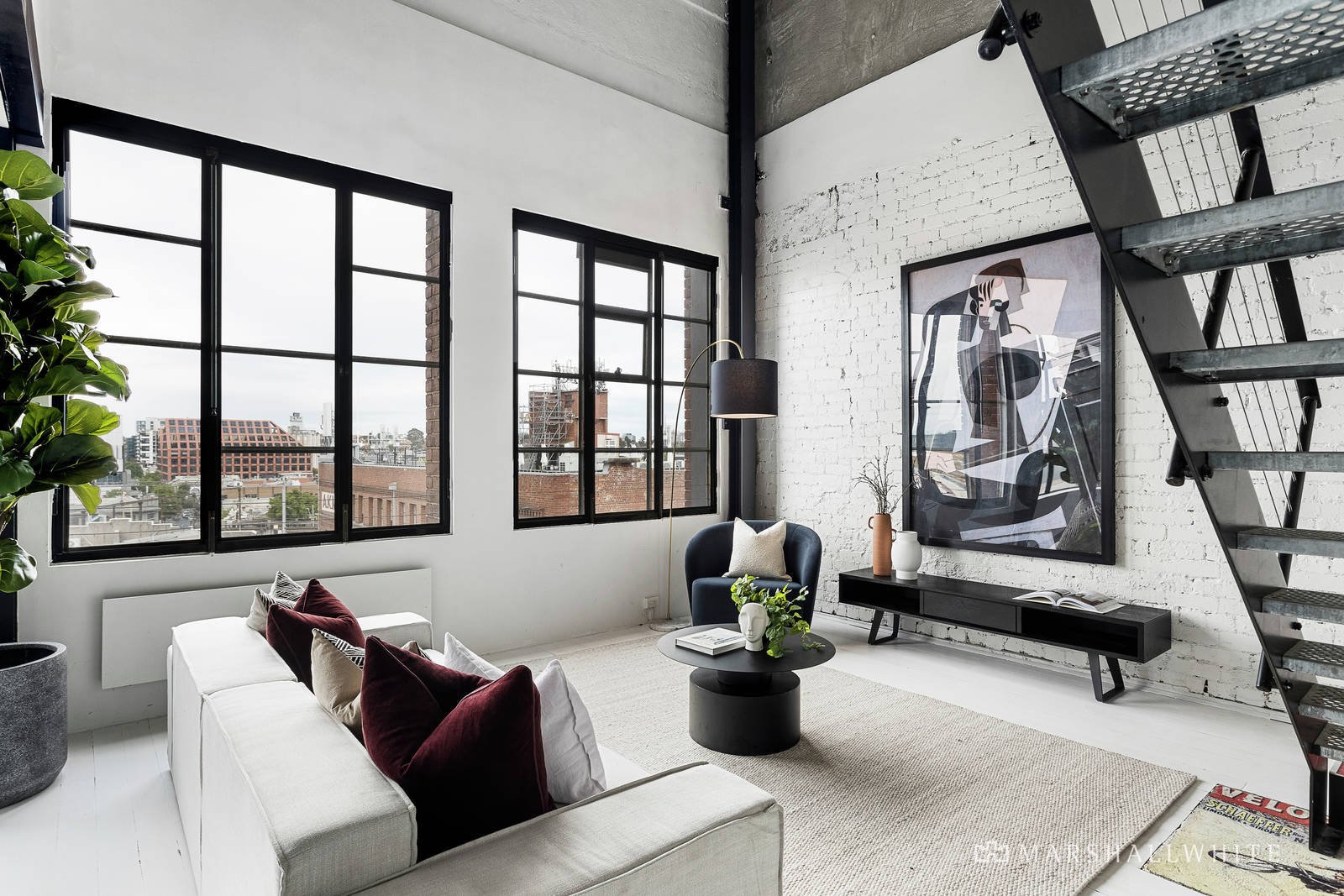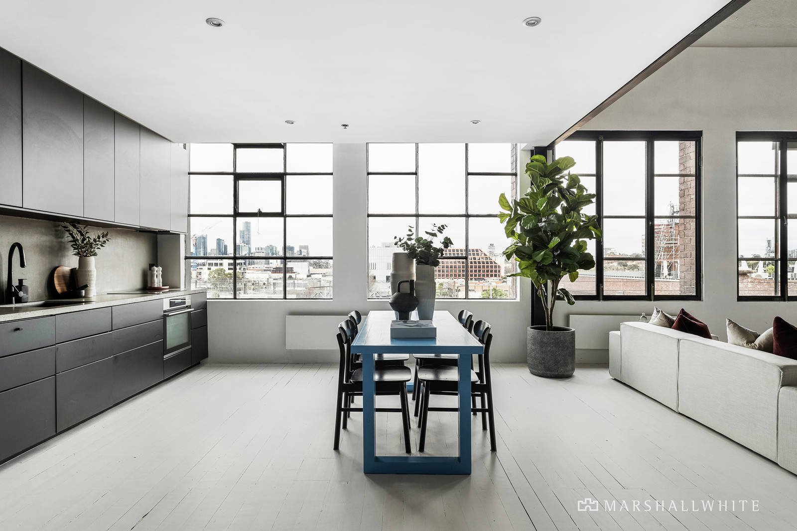 Boasting painted timber floorboards and brickwork, the generous scale of the light-filled open plan living/dining room and sleek gourmet kitchen with concrete benches is accentuated by soaring voids that showcase the original warehouse ceilings. Vast expanses of black steel framed windows provide panoramic views over Richmond to AAMI Stadium, the Botanic Gardens and Government House. Behind an innovative black steel framed partition, a versatile home office with fitted desk is equally suited as a third or guest bedroom. An industrial style steel staircase leads up to two spacious bedrooms with built in robes and a stunning designer bathroom.