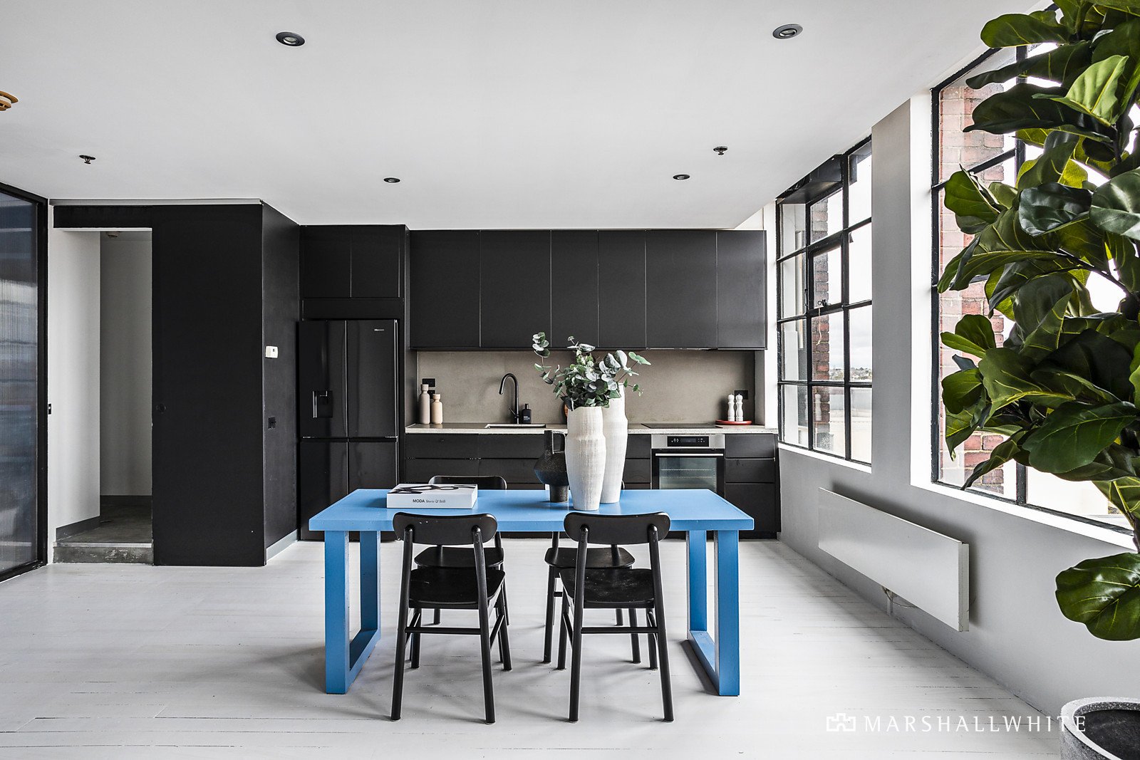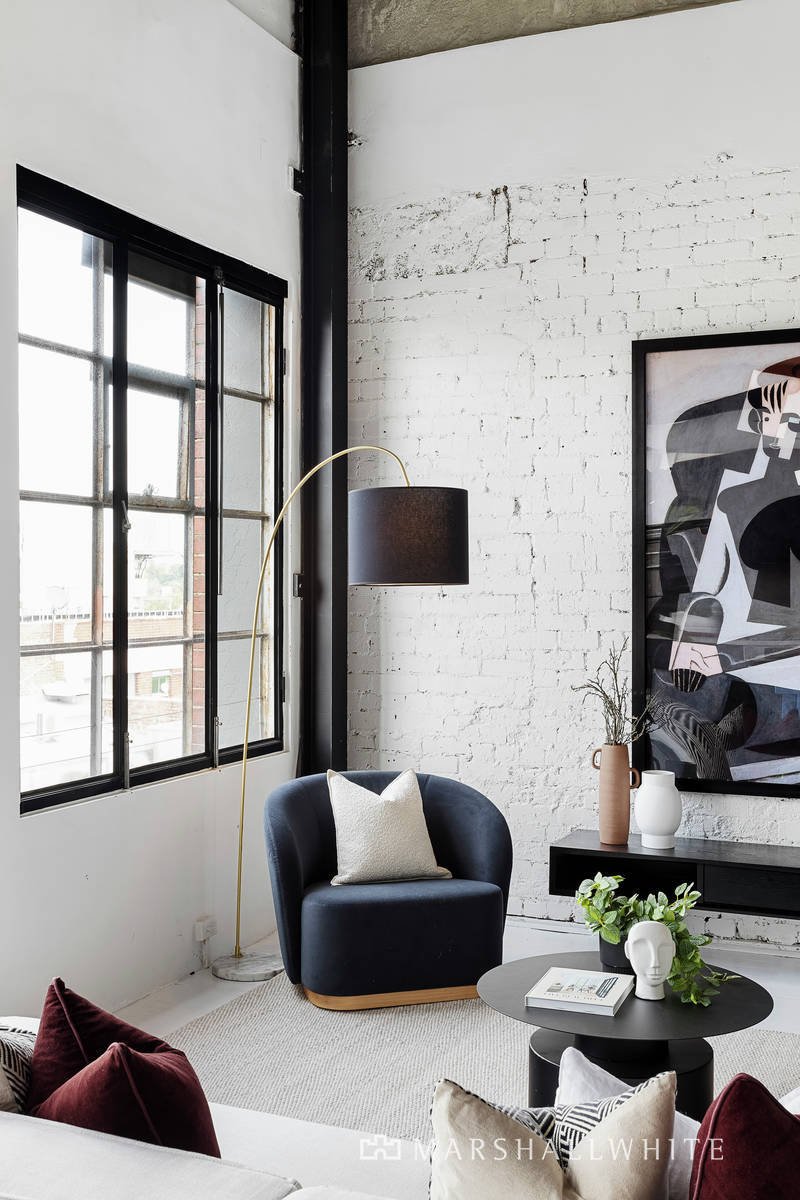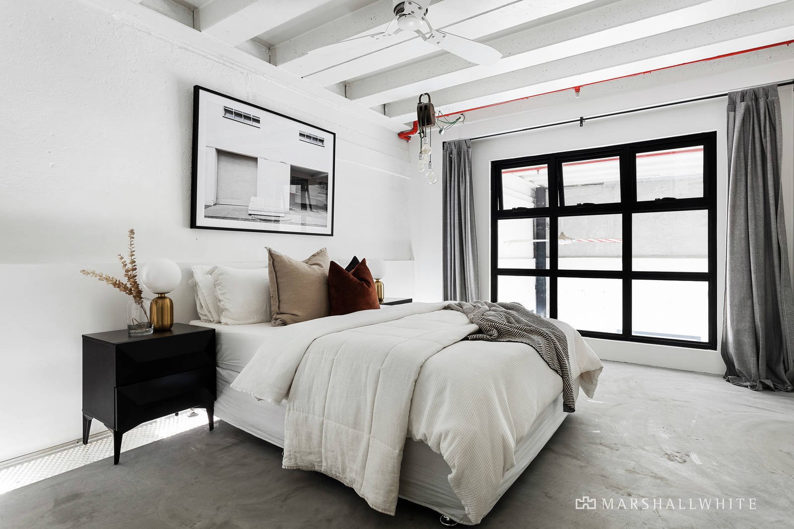 Boasting painted timber floorboards and brickwork, the generous scale of the light-filled open plan living/dining room and sleek gourmet kitchen with concrete benches is accentuated by soaring voids that showcase the original warehouse ceilings. Vast expanses of black steel framed windows provide panoramic views over Richmond to AAMI Stadium, the Botanic Gardens and Government House. Behind an innovative black steel framed partition, a versatile home office with fitted desk is equally suited as a third or guest bedroom. An industrial style steel staircase leads up to two spacious bedrooms with built in robes and a stunning designer bathroom.
