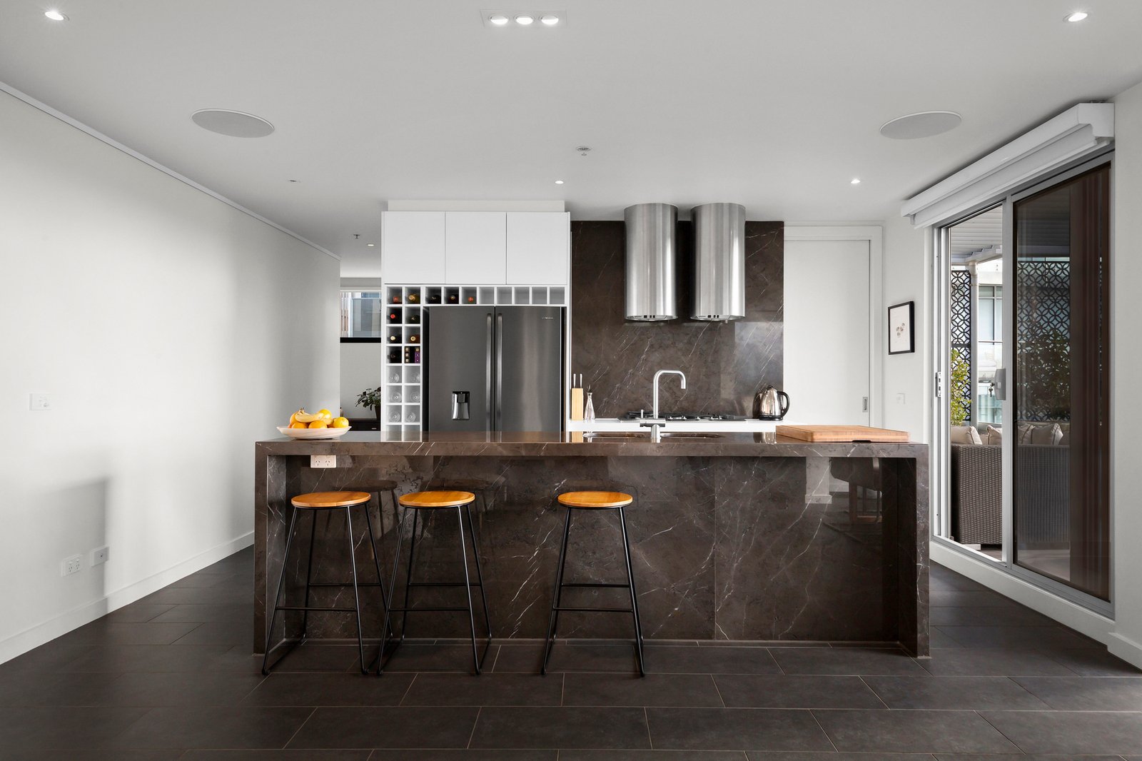 Private and peaceful with only one adjoining neighbour the apartment is at the rear of the development. It exudes prestige whilst extending to an enormous wrap around terrace that extends for indoor-outdoor entertaining amongst a glittering backdrop. The true, uninterrupted northern orientation ensures light pours through the expansive open plan living and dining domain, enhanced by walls of bi-fold doors that open the space entirely for alfresco moments. A rain sensitive automated Vergola ceiling and mains gas connection for the BBQ enhances the outdoor living, paired with a gourmet kitchen with striking marble benchtops, a walk in pantry, Miele appliances and twin Qasair rangehoods.