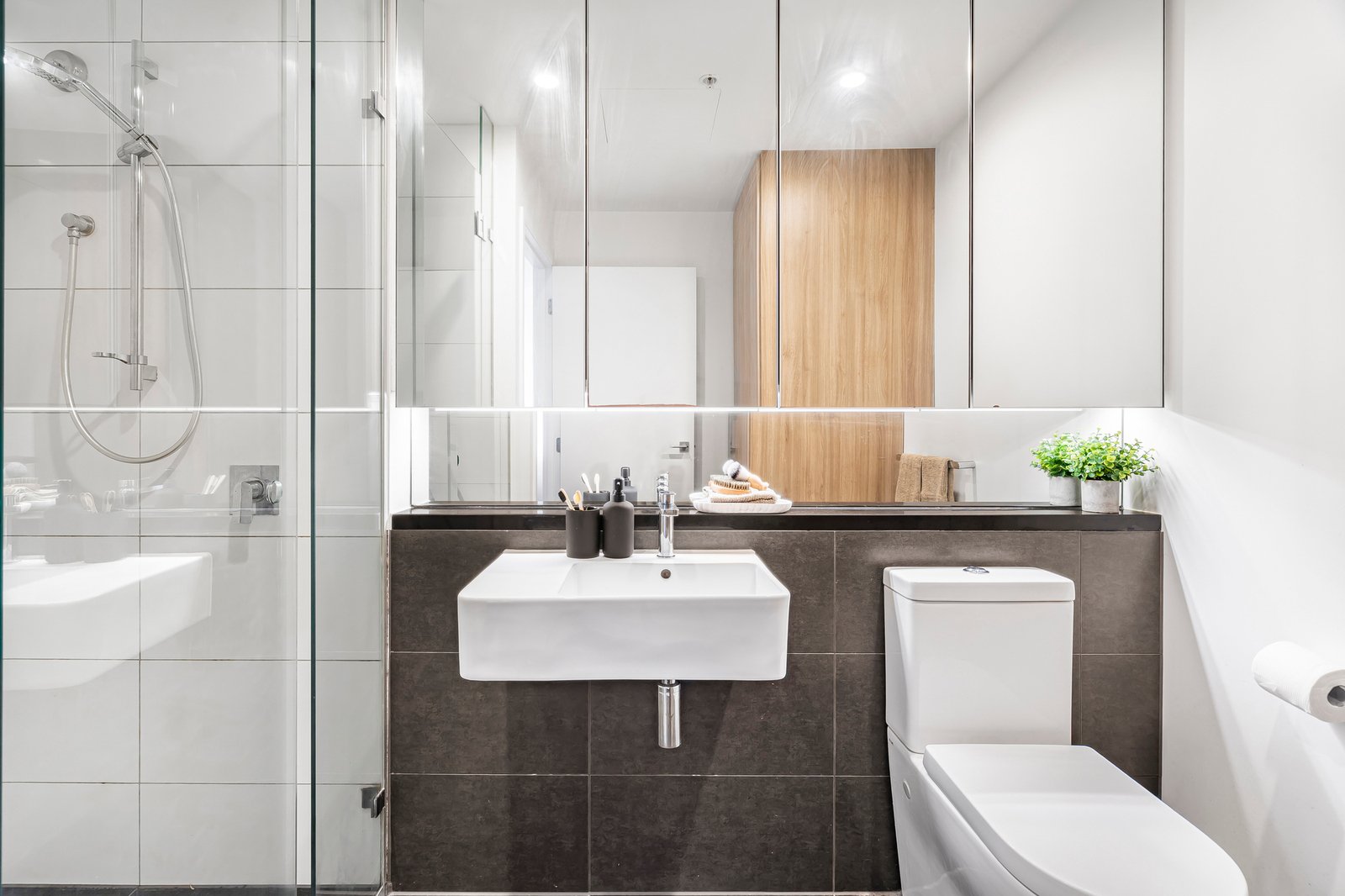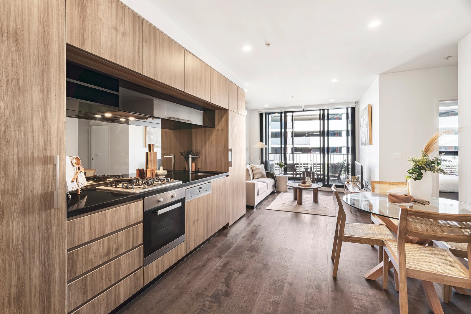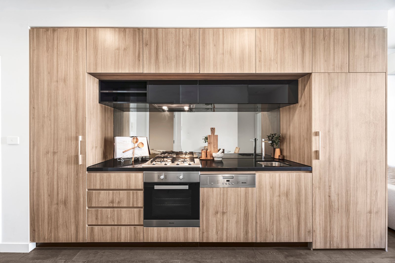 The kitchen makes a bold statement with black Caesarstone benchtops, a mirrored splashback, timber veneer cabinetry and quality Miele appliances, including an integrated dishwasher and gas cooktop. Both bedrooms feature mirrored robes and double blinds, with the bathroom offering floor-to-ceiling tiles, a frameless shower and an oversized mirrored cabinet with clever storage.