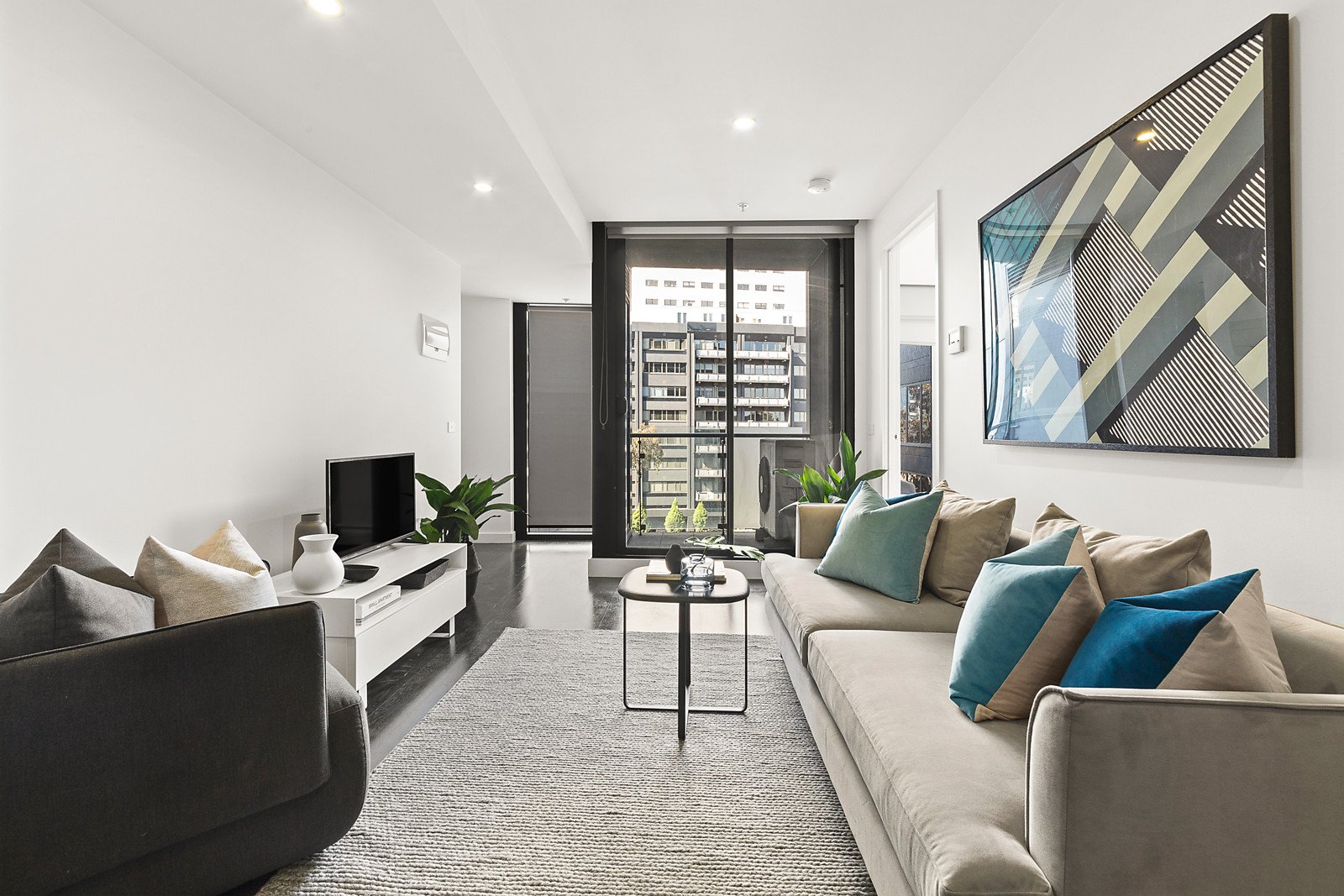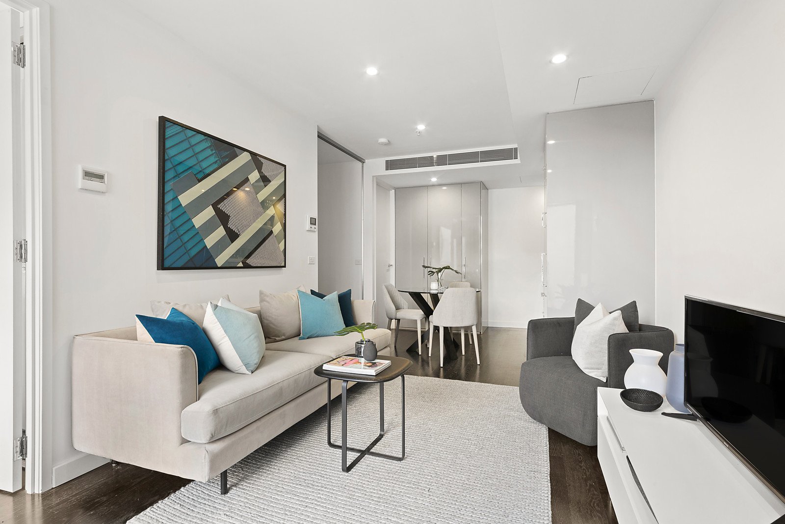 Set back away from Kings Way this near new apartment is perfectly located within close proximity to the Domain precinct, Royal Botanic Gardens, Albert Park Lake, CBD and all of South Melbourne's benefits. Offering 2 bedrooms with robes, main bathroom PLUS a powder room, open plan living leading into a well-appointed kitchen with BI fridge and DW, balcony, hidden laundry with washing machine & dryer. Includes OSP for one car, lift access, ducted heating and cooling, storage cage, NBN and Foxtel ready.