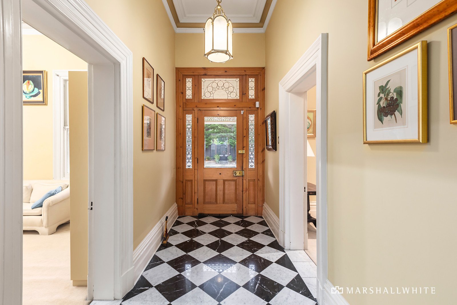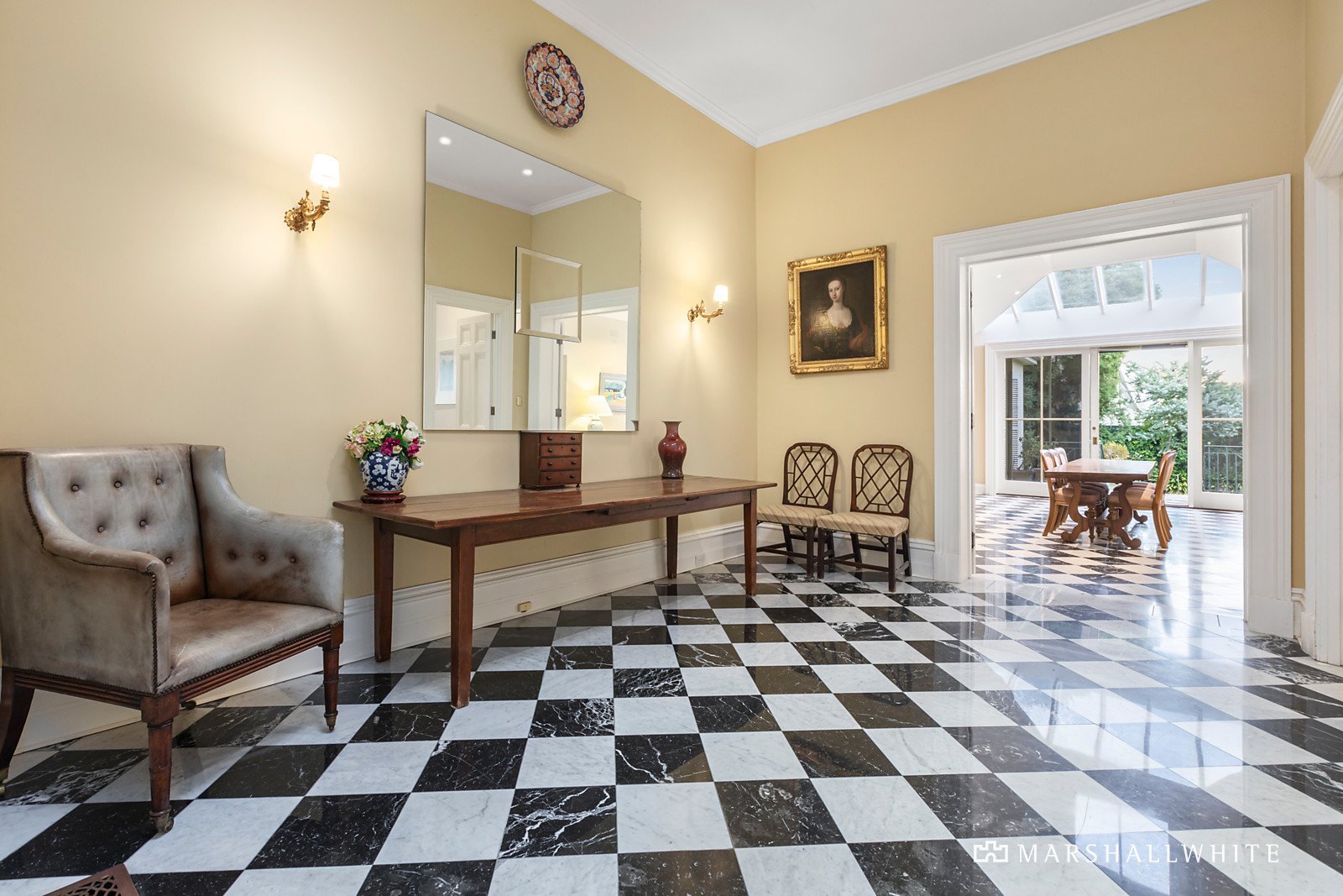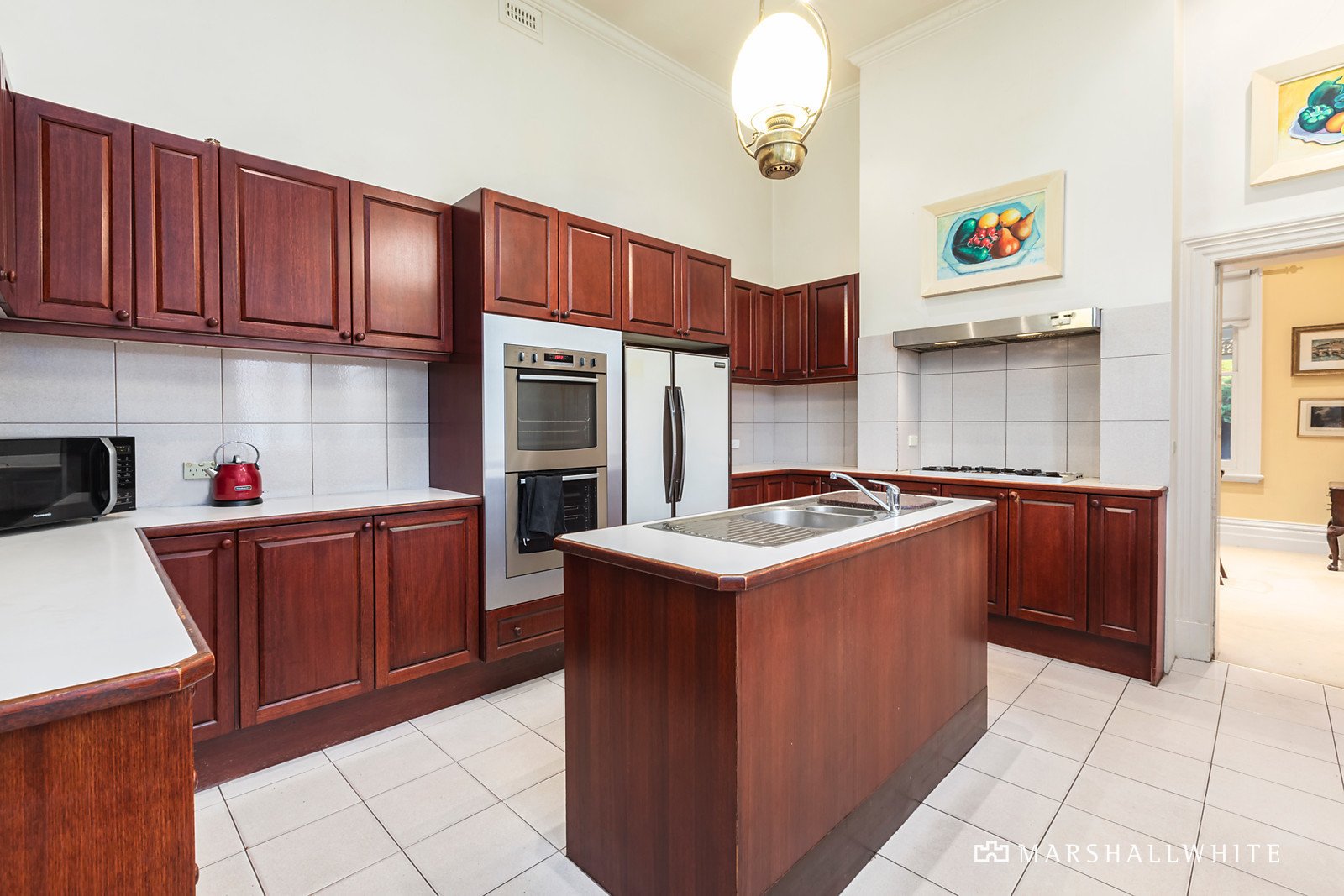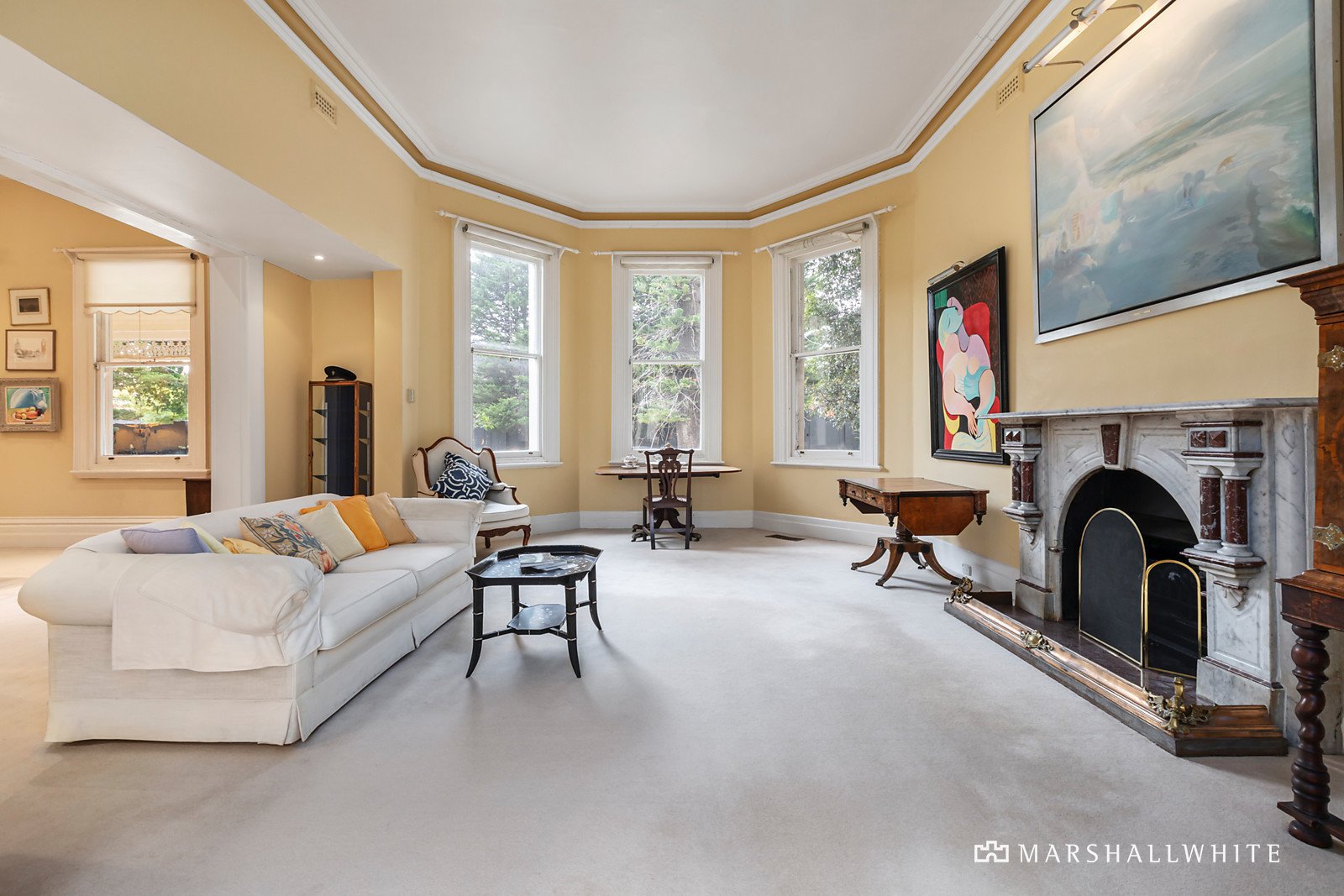 Behind a high fence line, a pair of towering pines and a full-width sandstone verandah introduce the striking home, with an imposing arched hall central to several reception rooms, all interconnecting for lavish entertaining and quiet enjoyment. Ornate cornices and ceiling roses adorn the 3.7m high ceilings, whilst marble-tiled floors and broad seating zones within the grand hallway enrich a once glamorous floor plan, complete with a grand-scale central kitchen and an entertainer's dining hall that spills seamlessly to the rear patio. Five bedrooms and three marble-tiled bathrooms include the main suite with an ensuite, walk-in robe and beautiful glass atrium.