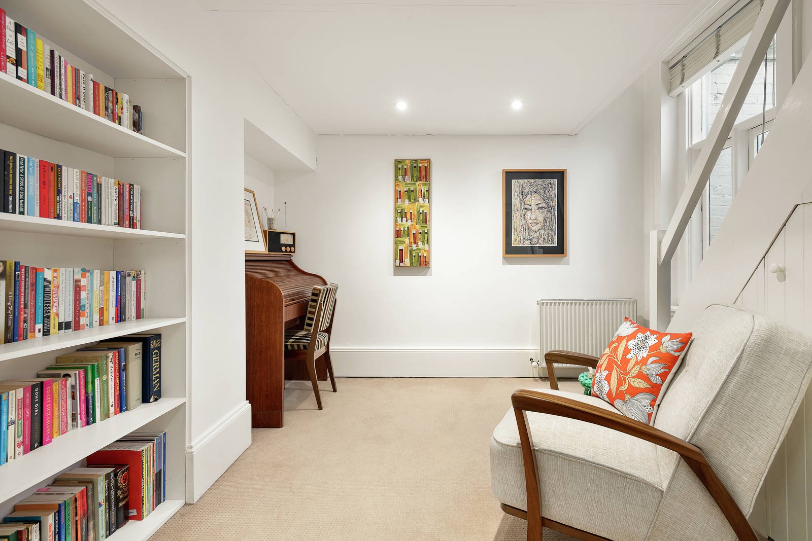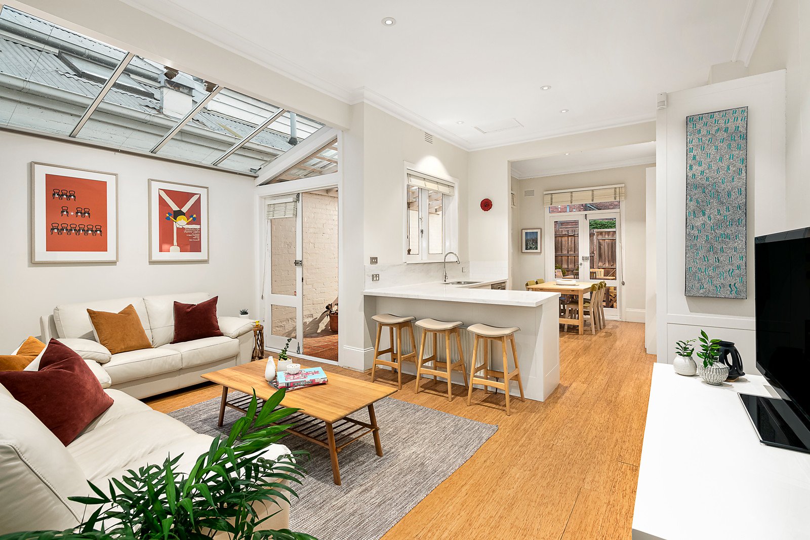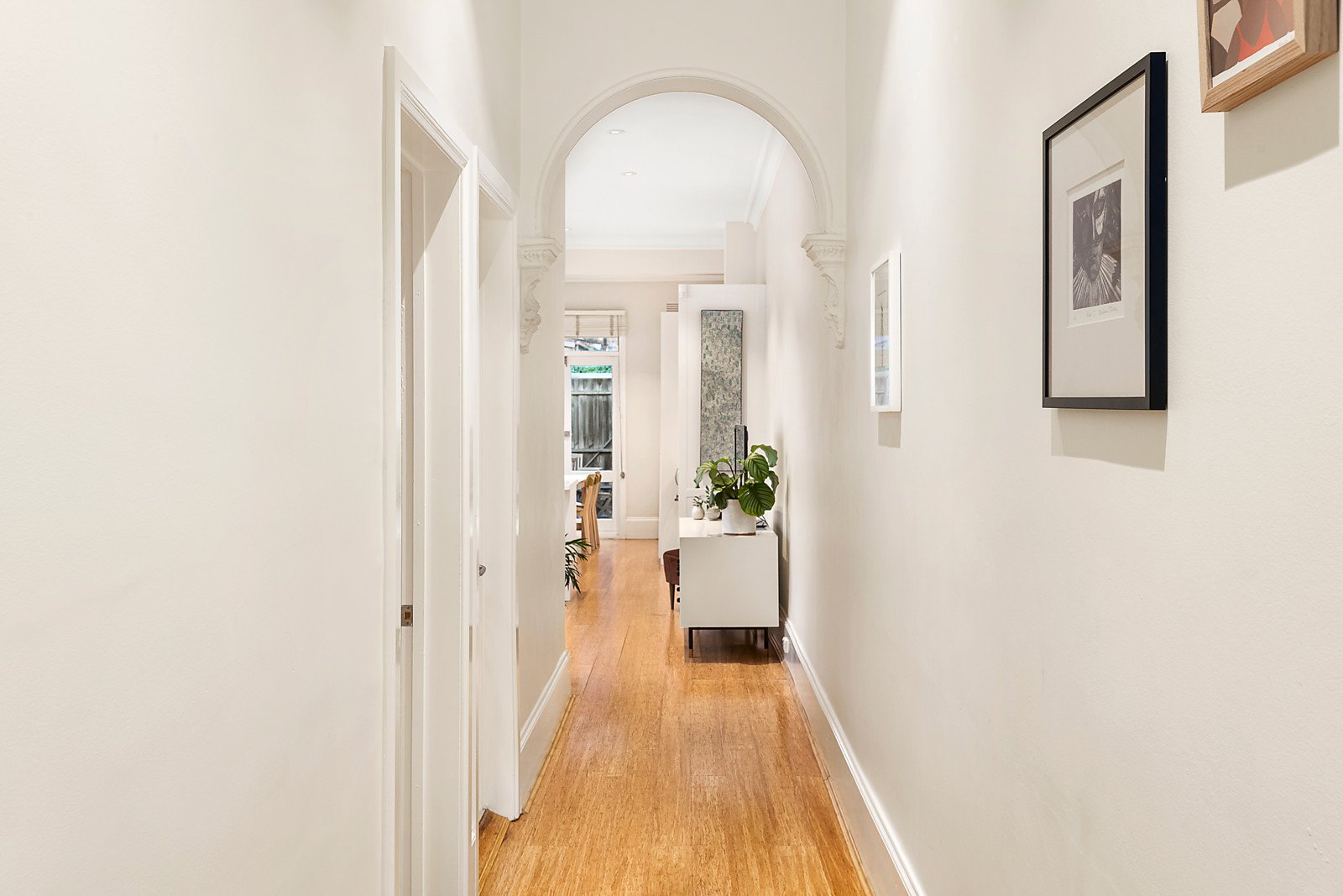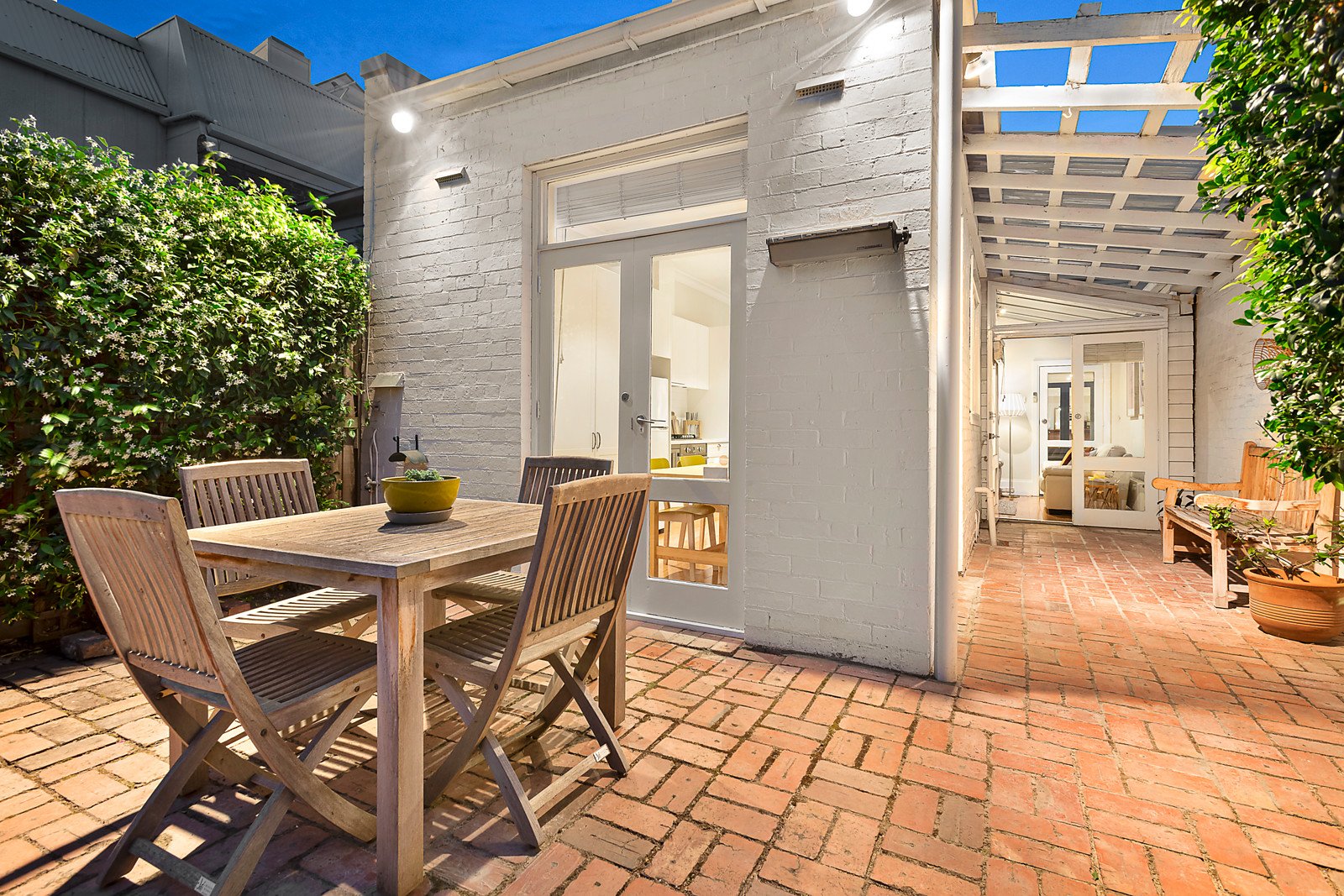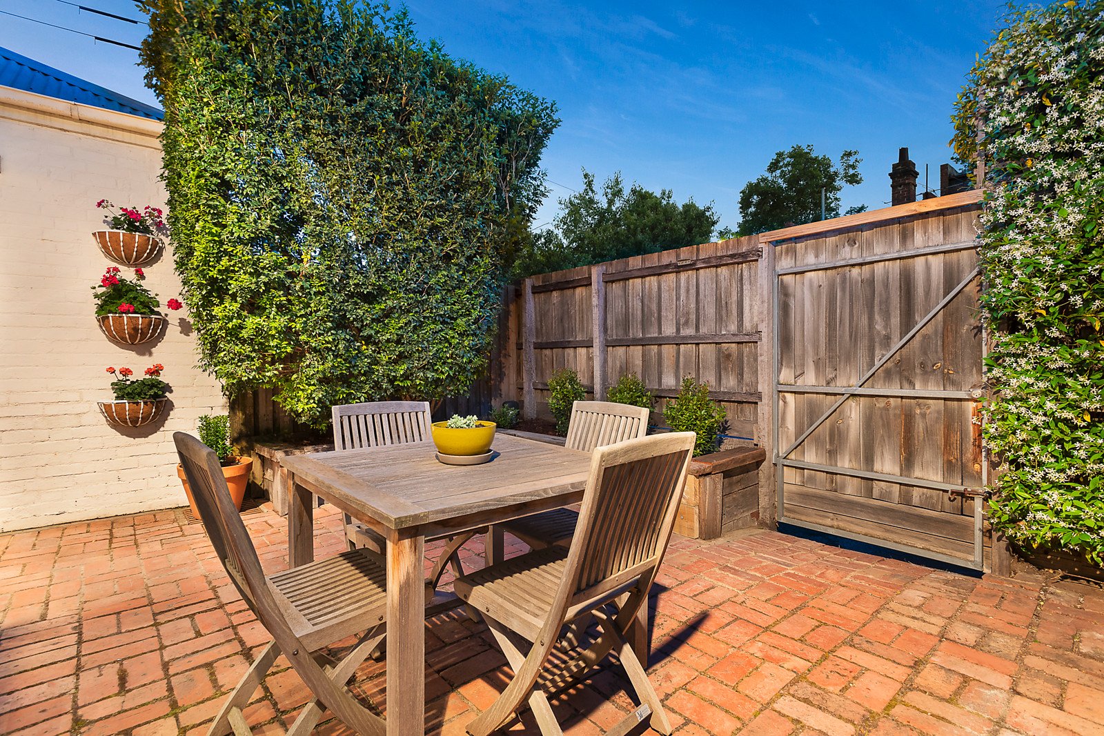 An arched hallway featuring high ceilings and bamboo floors flows through to the main bedroom with open fireplace and built in robes, a light-filled study with clever mezzanine bedroom above and a stylish bathroom. An abundance of glass accentuates the natural light in the generous living room, gourmet European kitchen boasting Corian benches and an inviting dining area. The living spaces extend out to a covered terrace for al fresco dining and the attractive private paved garden with right of way offering potential off street parking.