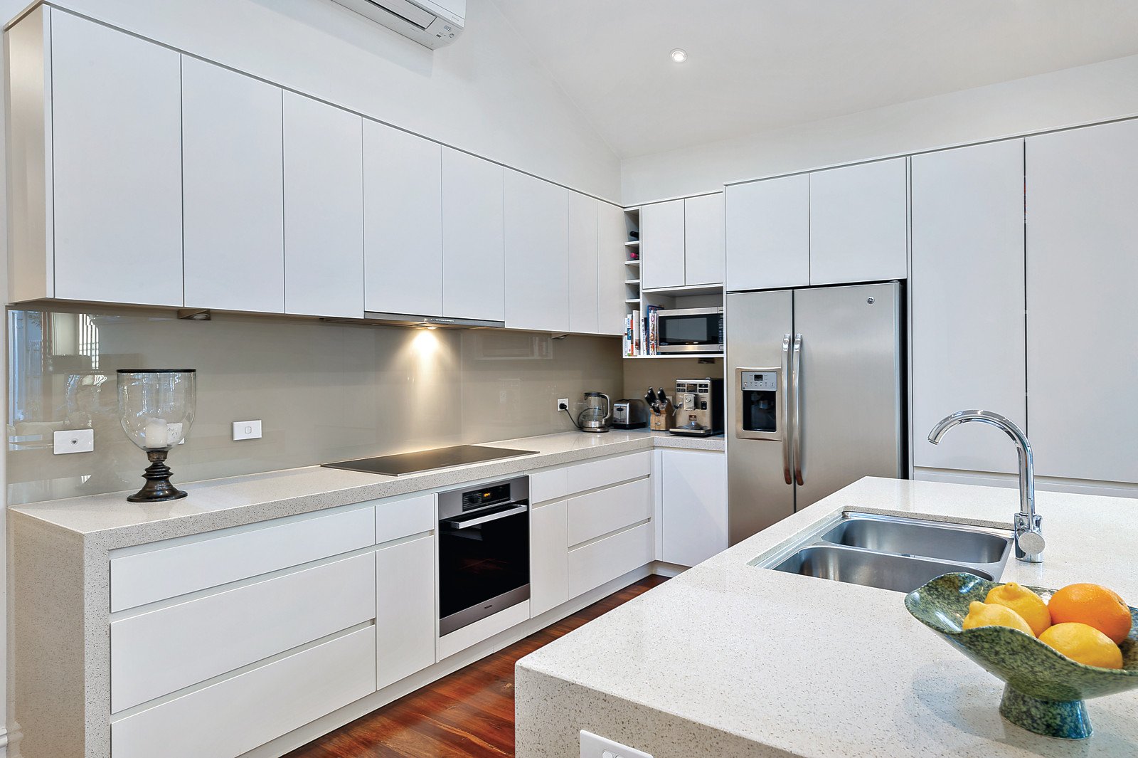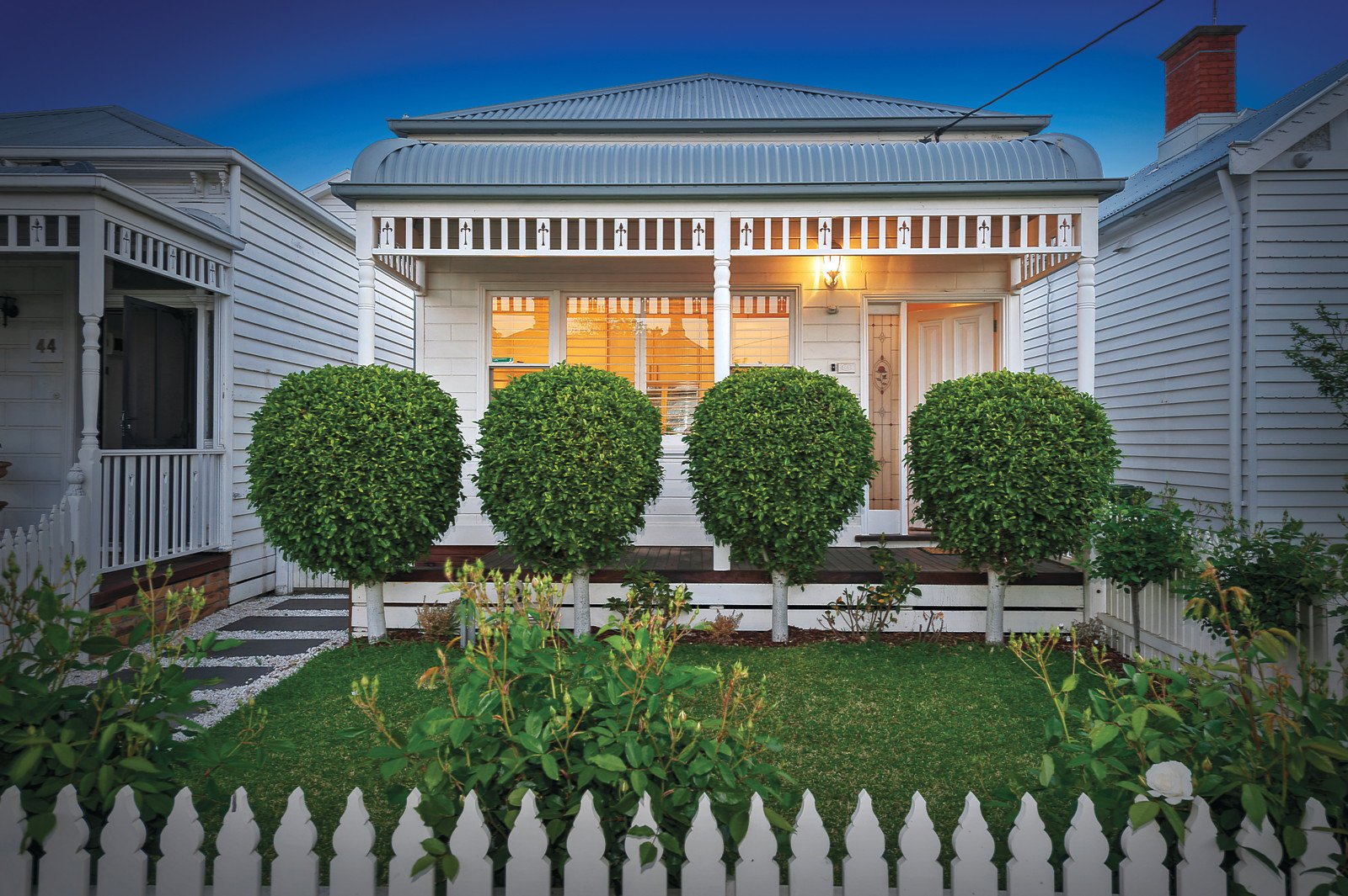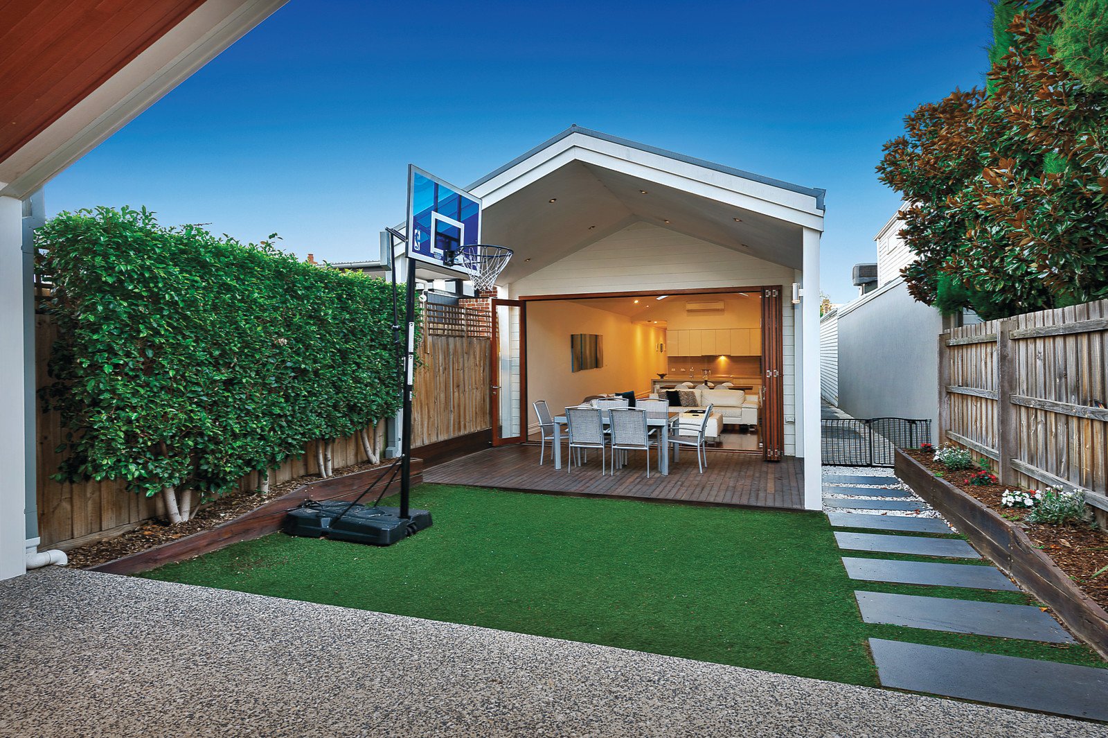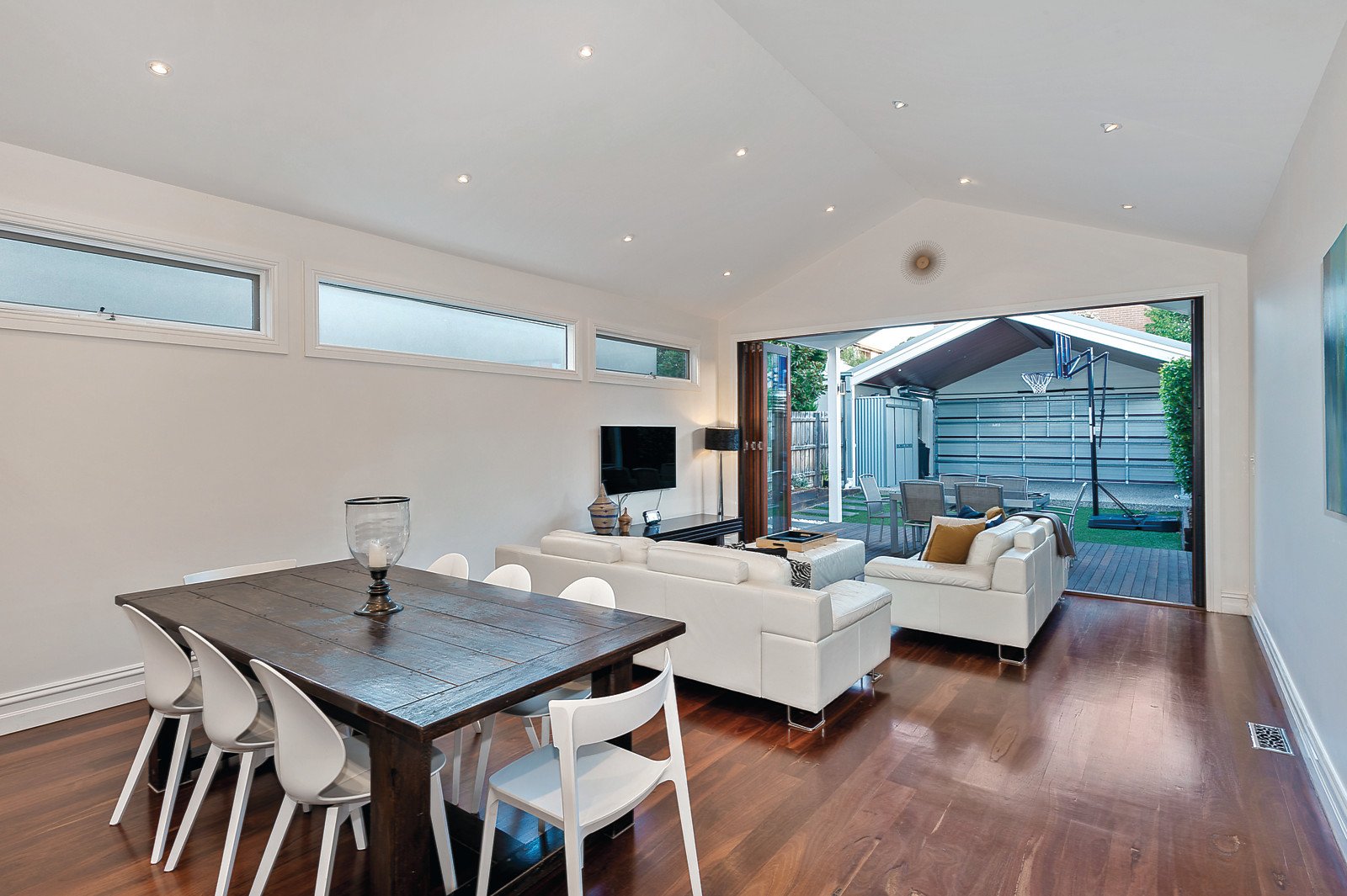 Behind the classic exterior, contemporary themes are highlighted by timber floors and stylish finishes in the wide hallway, two bright double bedrooms with built in robes, a stylish bathroom and the main bedroom with built in robe and chic en-suite. A soaring vaulted ceiling accentuates the sense of space in the generously proportioned open plan living and dining room with a streamlined gourmet kitchen complete with Miele appliances and stone benches. Bi-fold doors open the living completely to a large covered deck overlooking the private garden with a versatile double garage or outdoor entertaining/recreation area with rear lane access.