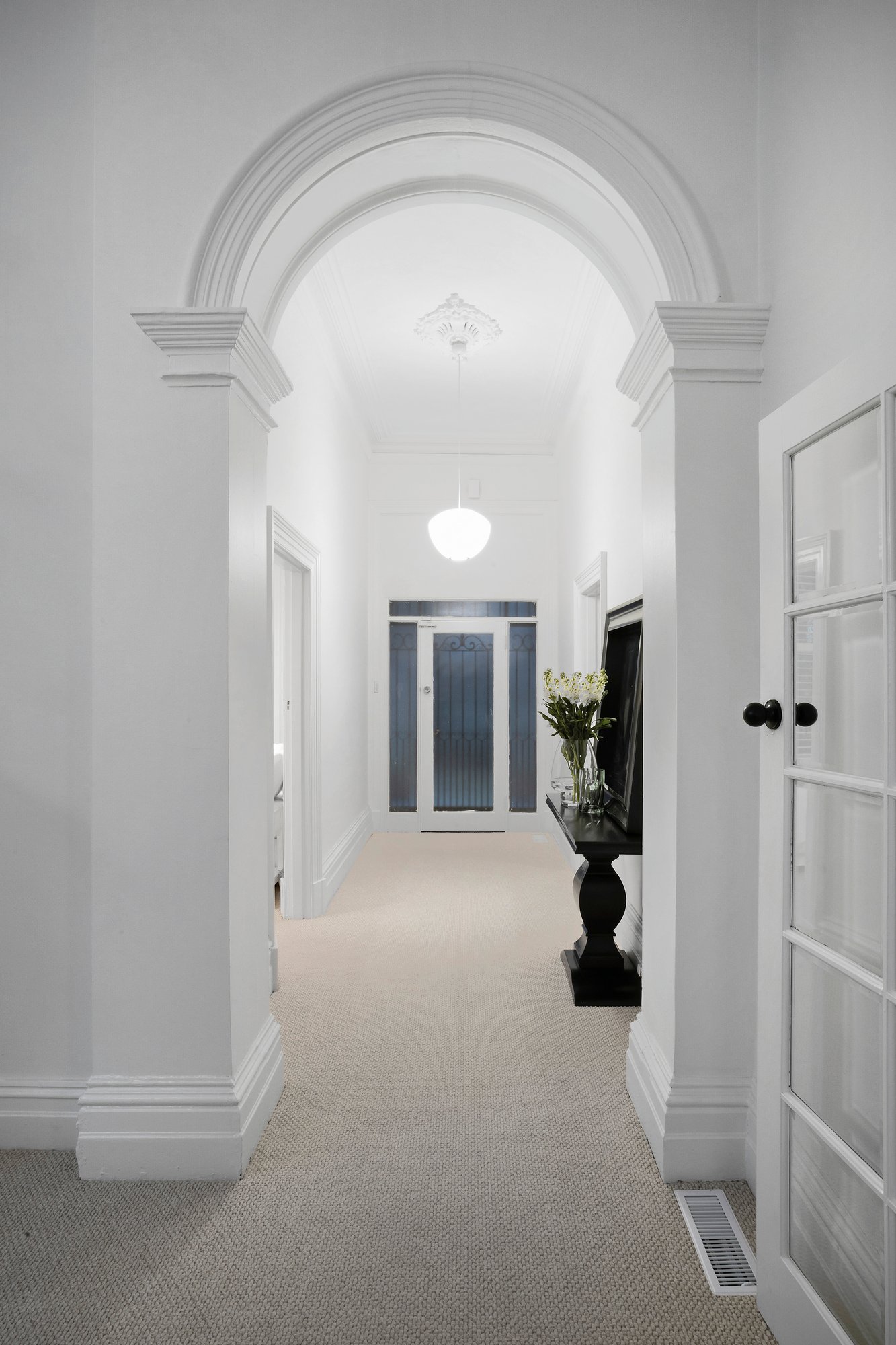 Introduced by a formal garden, traditional verandah and ornate Victorian fretwork, the home opens grandly to a central arched hallway that flows under soaring ceilings, past a formal dining and a lounge, to the relaxed joy of its open-plan rear. Subway-tiled with stone benches and Miele appliances, the kitchen is timelessly elegant, while vast family / living extends outdoors to a partially paved and partially undercover backyard.