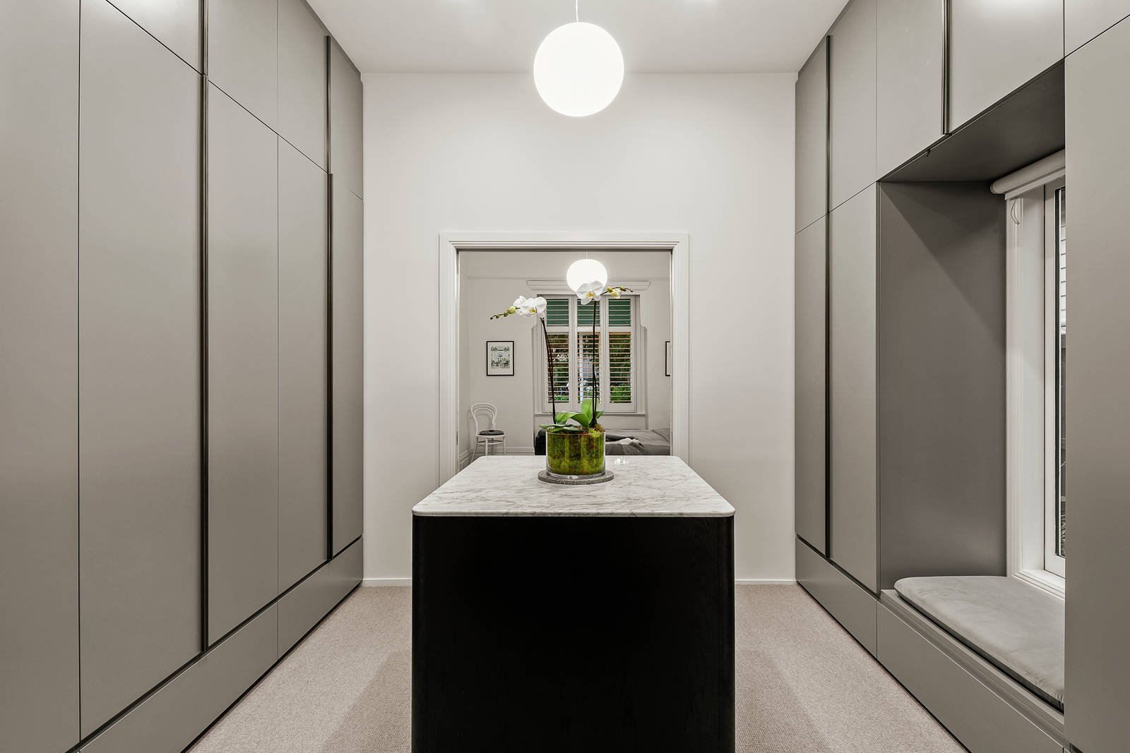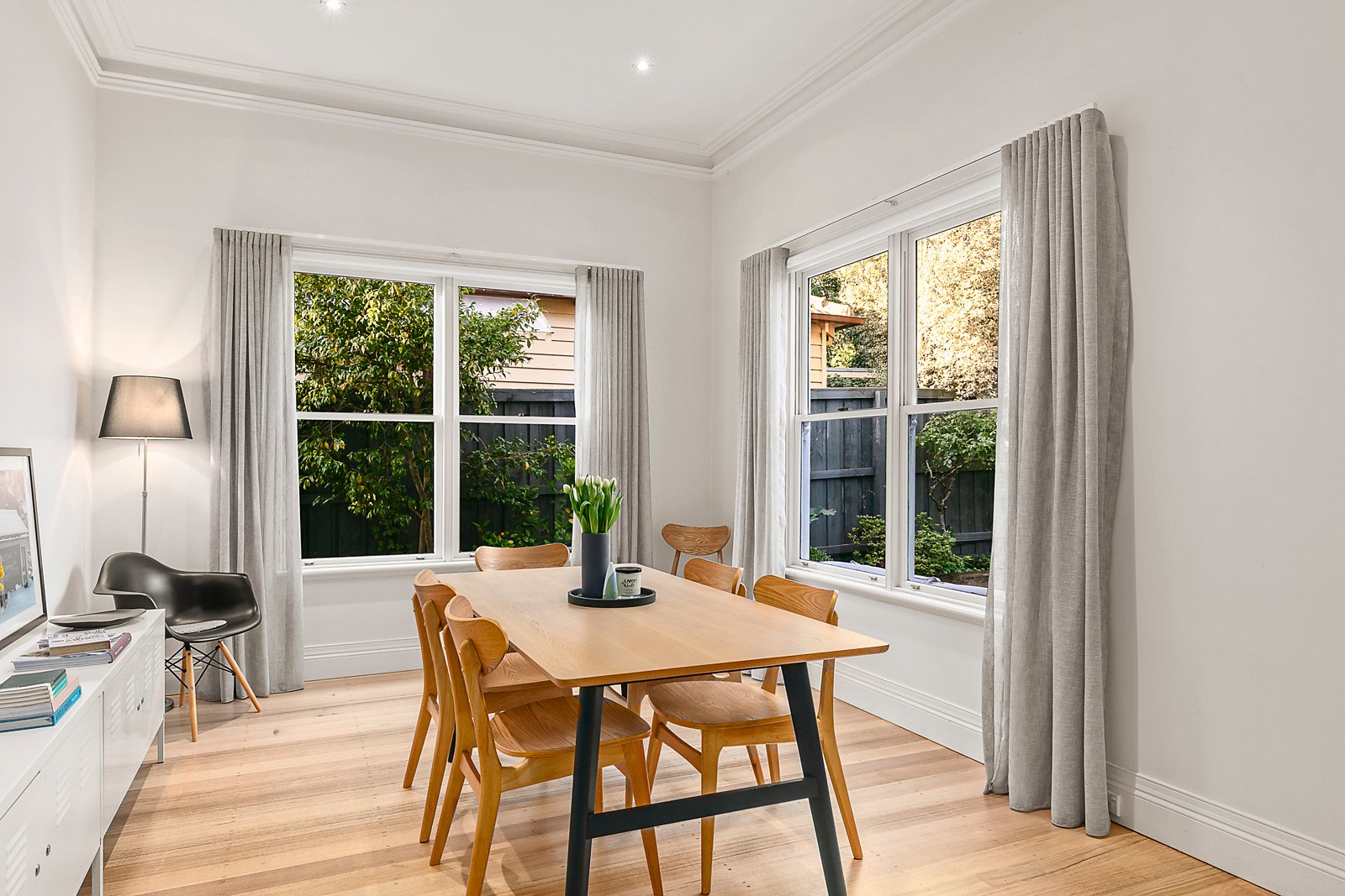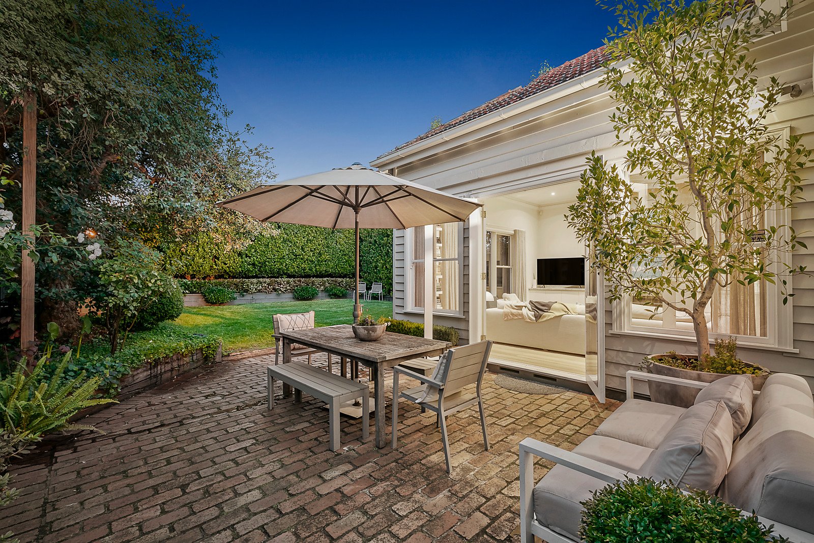 Behind the picturesque exterior profile, a central entrance hall featuring high period ceilings and Baltic pine floors introduces an elegant master suite with bespoke dressing room and luxurious marble en-suite, two additional bedrooms with robes and a second bathroom. Bathed in northern light, the generously proportioned open plan living and dining room with a fireplace and gourmet kitchen appointed with marble benches, Ilve appliances, integrated fridge/freezer and added study nook opens to a deep private northeast garden surrounded by tall hedges and sunny dining terrace.