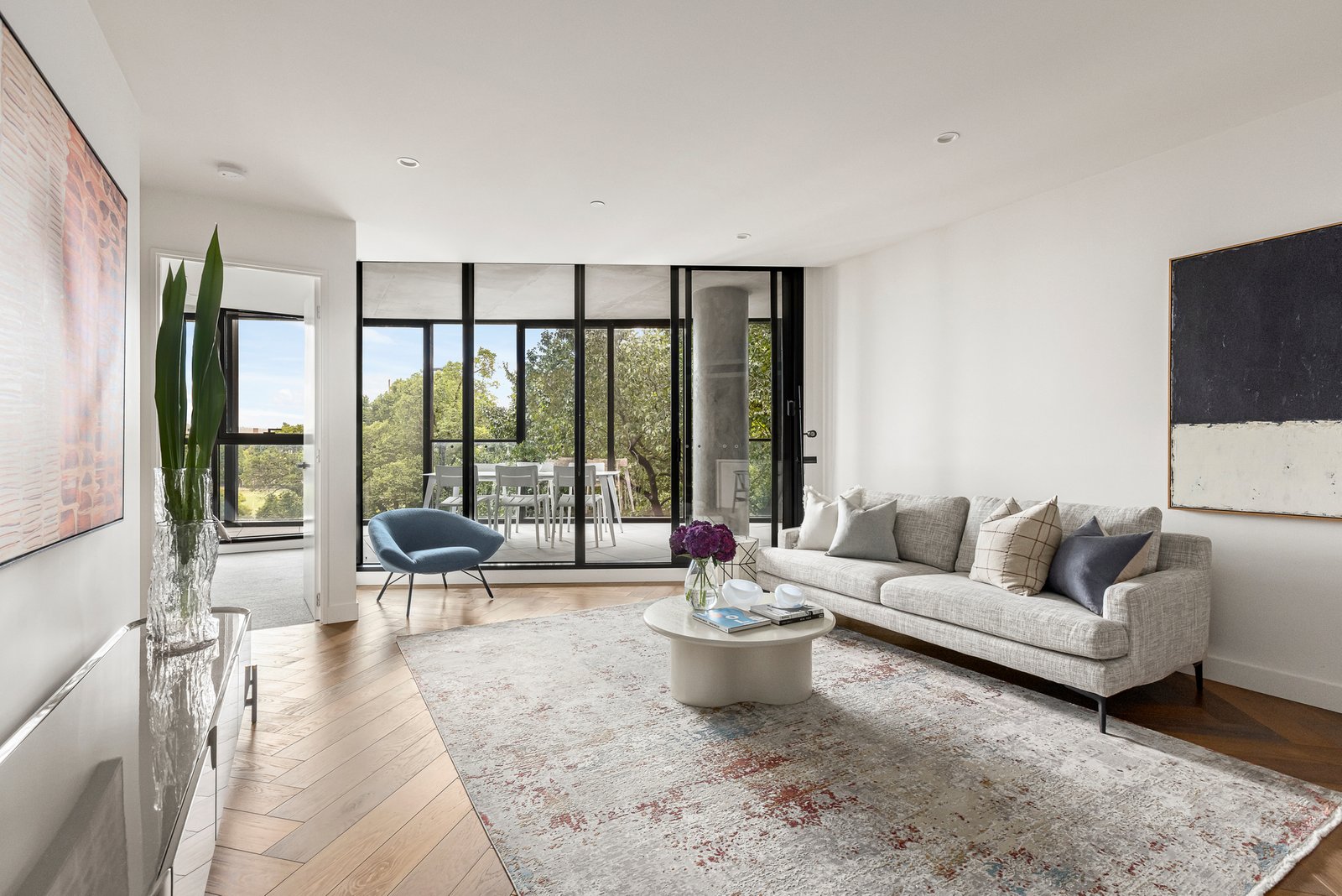 With spectacular outlooks over heritage-listed Elm trees, Paul Bangay landscaped gardens and historic buildings, the interior is faultless in its style and ambience. Private and welcoming open-plan living/dining areas distinguish between its zones for relaxation and entertainment, headlined by the sleek kitchen is uncompromising in quality. Equipped with all-electric Miele appliances, an integrated Liebherr fridge/freezer and stone benchtops, whilst herringbone oak floors add contrasting warmth, inviting comfort and indulgence in equal measure.