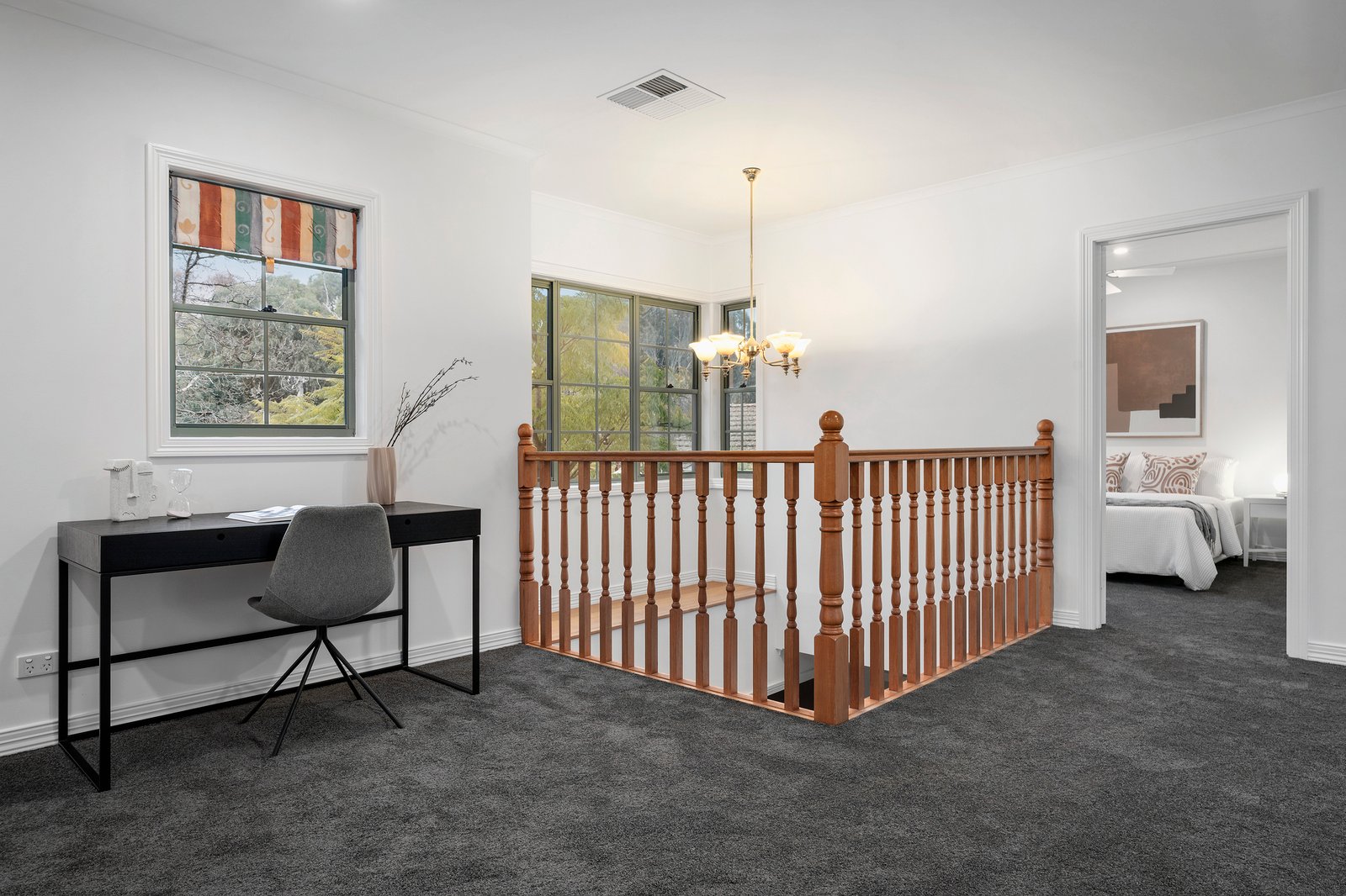 With up to six bedrooms including a self-contained zone, a study and work-from-home space, three bathrooms plus powder, and a choice of living areas including a home cinema, the home’s expansive and adaptable layout offers flexibility for multi-gen family living. Zoned on the ground floor, the primary bedroom has a walk-in robe, a shower ensuite, and delightful outlooks to a tree-fern grove. Also on this level is a fitted study, and another bedroom suite which could be set up as a fully self self-contained space, with private sideway access, a sliding door to a private garden deck, a kitchenette with sink, a bathroom with spa bath and shower. Upstairs are another four fitted bedrooms, all with unique characteristics including a light-filled rear room with lovely palm treetop views, and another with a box-bay window and uninterrupted parkland views.