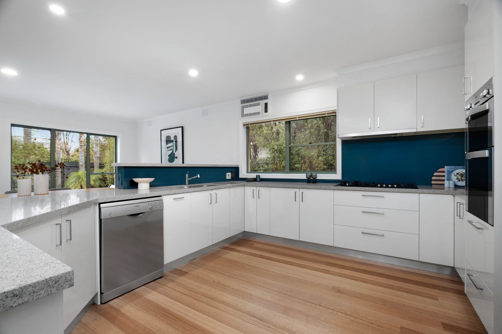 Set within glorious established gardens, the renovated original home retains its timeless charm and grandeur with a double-door entry that opens to a tiled, light-filled double-height foyer. Designed to optimise the north-facing orientation, the main open plan living area features a central entertainer’s kitchen with stone benchtops, Kleenmaid double-oven, gas cooktop, dishwasher and walk-in pantry. Glass sliding doors open to an undercover alfresco deck that overlooks the sparkling, in-ground swimming pool in sandstone-paved surrounds, and adjacent lawn area, all edged by lush tropical inspired gardens.