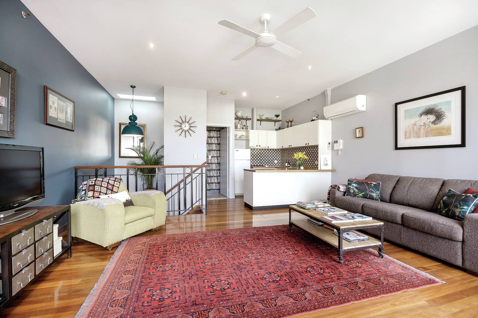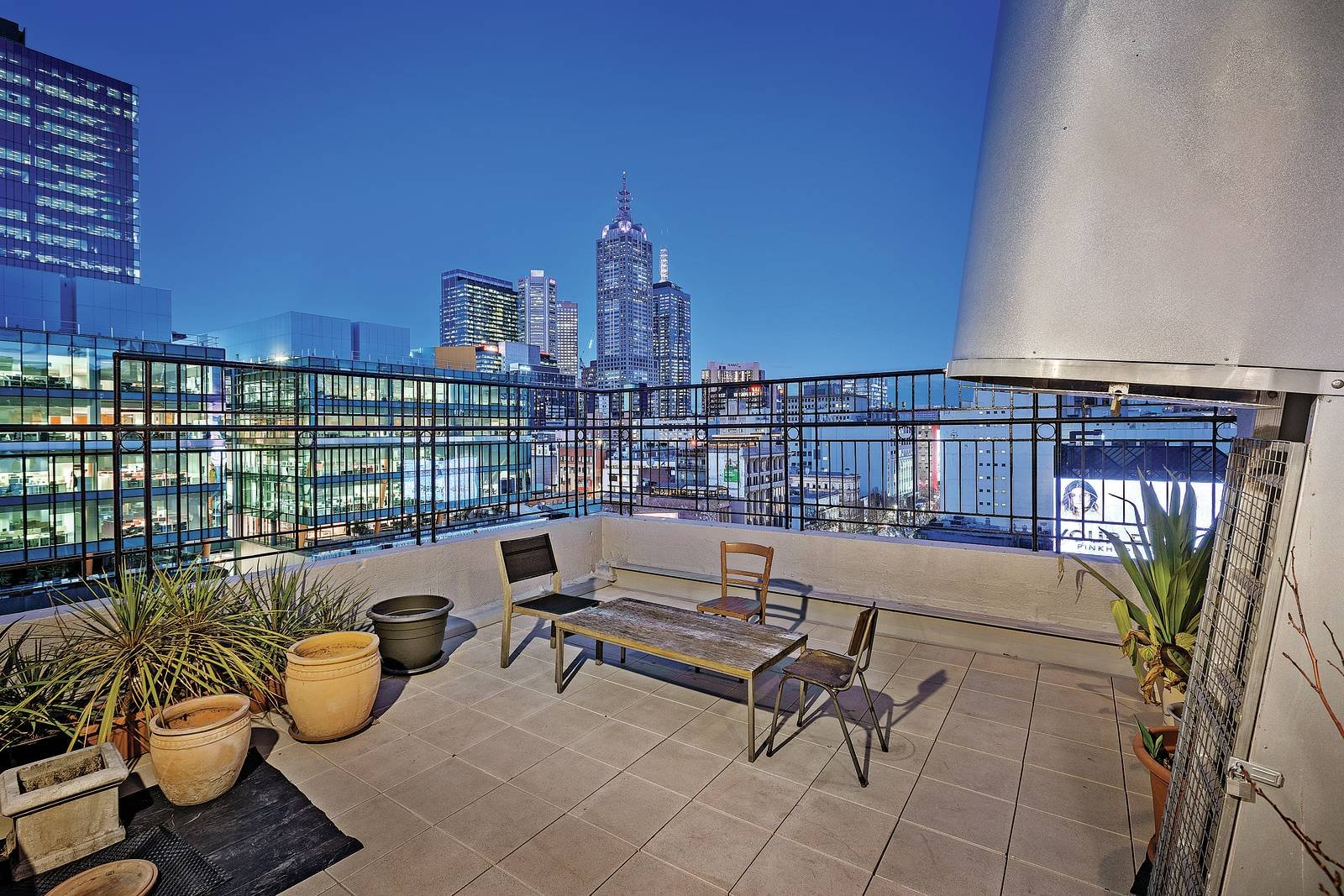 Beautifully discrete down a leafy cobblestone laneway, a secure entry opens to reveal a grand staircase and lift rising up to this top floor duplex complete with two balconies, incredible bird's eye CBD views and access to the residents' rooftop terrace. Smart style and significant space define its lofty proportions. The potential to re-configure the giant bedroom back into its original two bedroom dimensions. Complete with extensive built in robes and storage, cast iron balcony and fully renovated bathroom. Upstairs the open plan living and dining room with spacious kitchen and powder room offers unparalleled city views. Reverse cycle heating/cooling, laundry, timber floors, a communal rooftop terrace and secure parking complement this chic CBD pad surrounded by the very best of City shopping, dining, theatre, transport, RMIT and the State Library right at its doorstep.