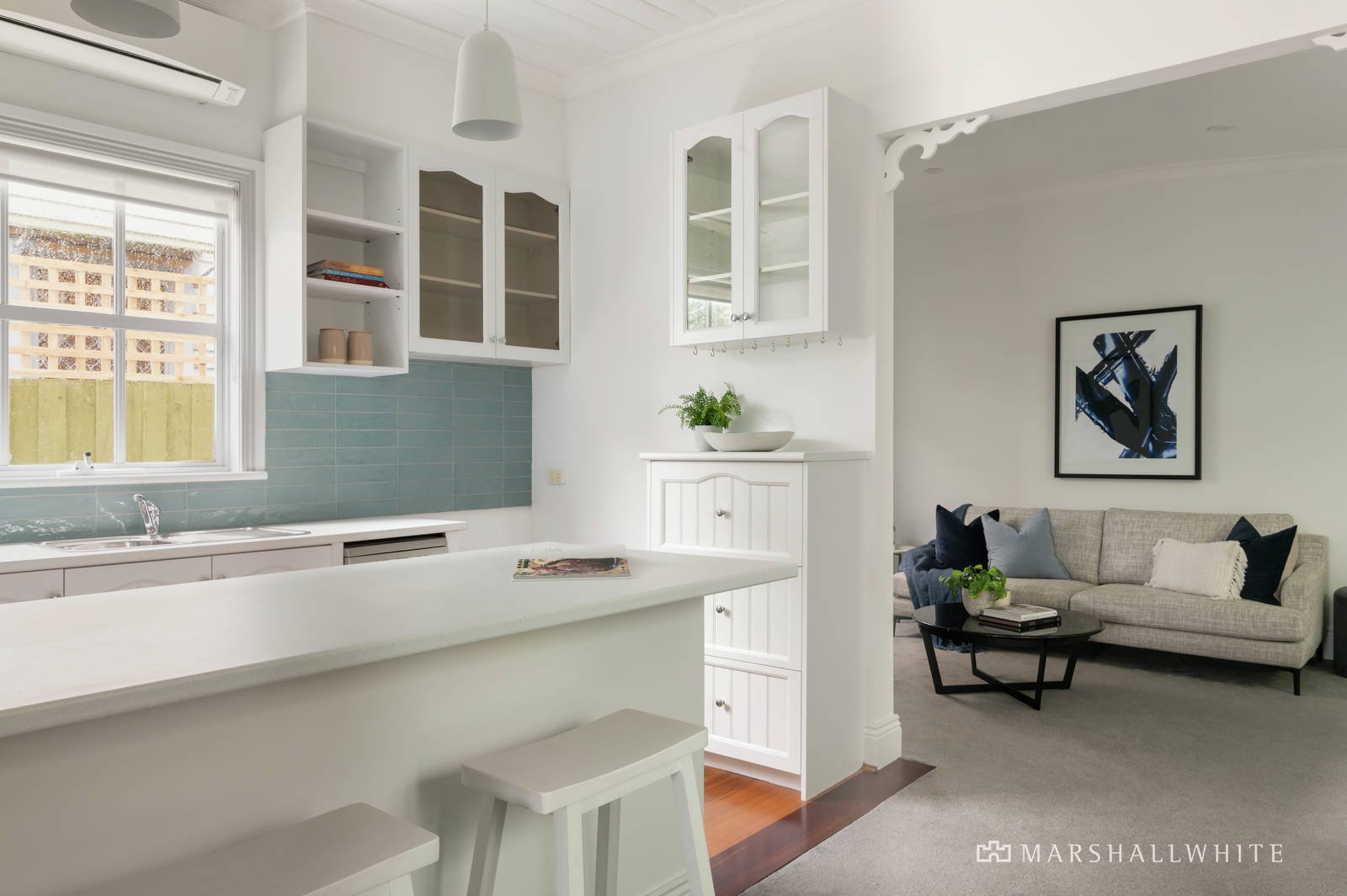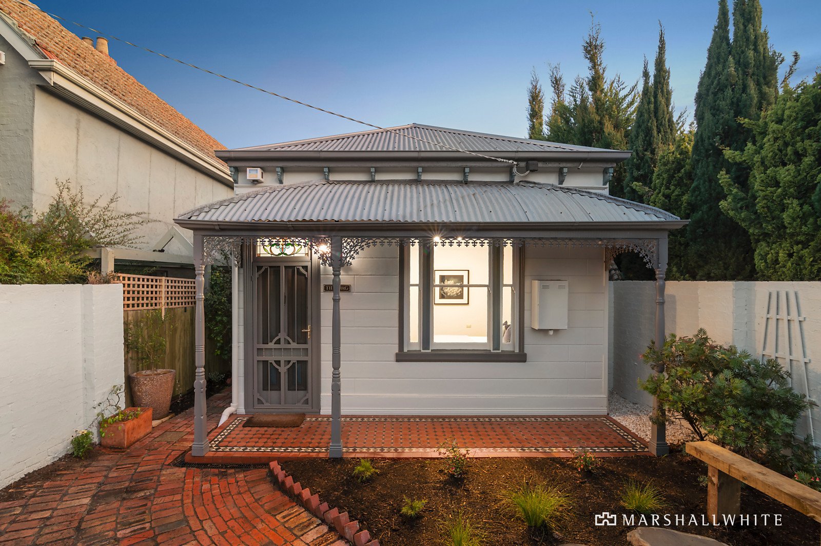 Privately and securely positioned behind a north-facing walled garden this picture perfect single-fronted, freestanding Victorian Cottage is highlighted by retained period attributes including a bull-nose iron lacework, tessellated verandah and coloured leadlight glass introducing a stylish, previously renovated and extended interior. Presenting in perfect order following just completed refurbishing the contemporary interior has instant appeal with nothing to do but move in and enjoy. High ceilings with roses plus an arched Baltic Pine hallway flows past two double bedrooms with built-in robes to a generous sitting room alongside a dining area and stylish kitchen equipped with brand new stainless steel appliances. Plus a pristine bathroom with spa bath, concealed laundry and a generous architect designed second living room. Double French doors open to a leafy courtyard garden and paved alfresco dining area, separating the house from a double garage+storage which can be opened up to extend the entertaining area if desired; and enjoys the convenience of remote rear lane access. Other features include alarm, R/C air-conditioners and a gas mains BBQ connection.