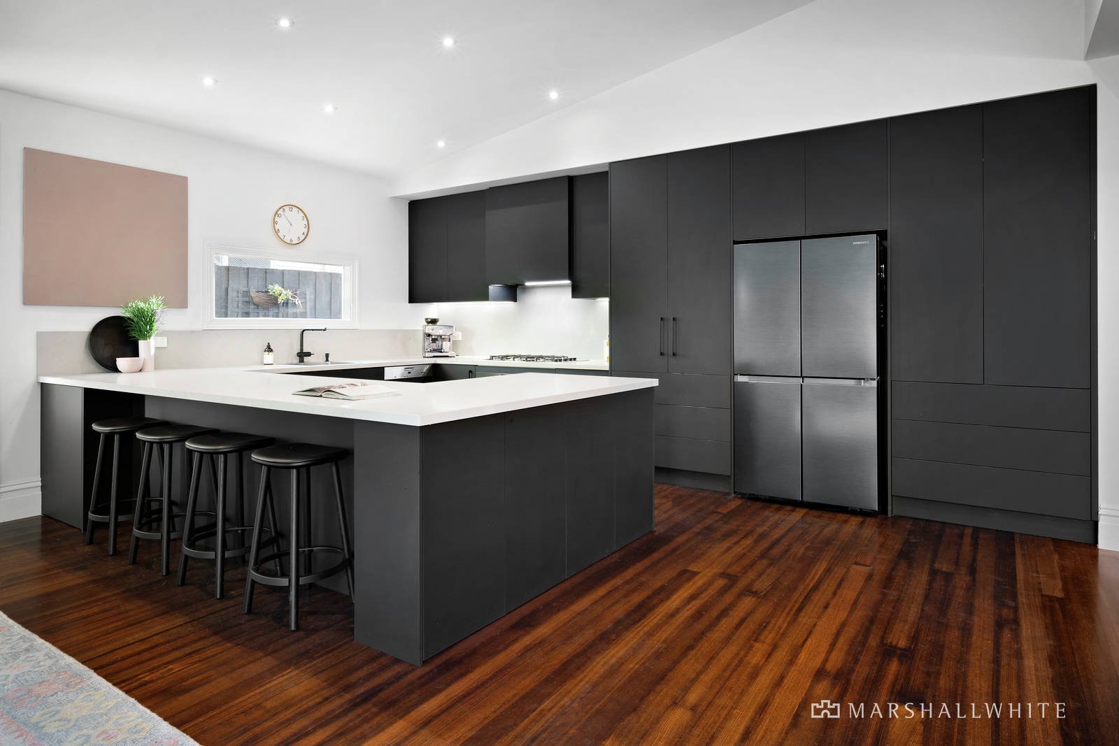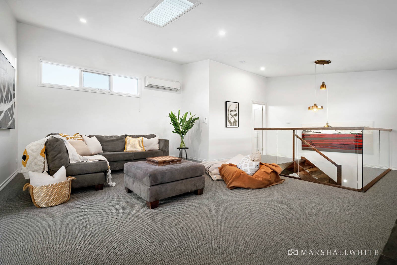 The double arched hall featuring high ceilings and dark timber floors flows through to a study nook and generous home office with built in desk. Raked ceilings accentuate the wonderful sense of space that defines the sun-drenched open plan living and dining areas either side of the sleek gourmet kitchen equipped with stone benches, 90cm oven and Miele dishwasher. A full bank of bi-fold doors allows the living area to flow seamlessly out to a large north-facing entertaining deck and the beautiful northeast garden, an entirely private oasis surrounded by ornamental pear trees. The captivating main bedroom with designer en suite and walk in robe complements three additional bedrooms with robes, a stylish bathroom with separate powder-room and a versatile and exceptionally spacious upstairs retreat with third bathroom.