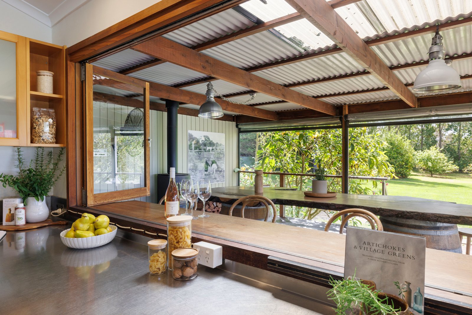 Currently under lease until 2027, the five acres under vine are planted in two sections divided by a meandering creek and a paperbark forest. Overlooking the picturesque rows of vines, the residence/cellar door has been architect designed for functionality and adaptability as either a commercially viable hospitality space, or a stylish, spacious family home. Inspired by mid-century modern design, a hand stacked dry stone wall surrounds an open fireplace and wood stack alcove above a polished concrete plinth, while two walls of bi-folding timber-framed doors open fully to the expansive undercover deck area that seems to float above the vines. Ironbark flooring enhances the rustic vibe, and another wood fire heater assures a cosy ambience in colder months. The central kitchen, adds a commercial/industrial element with stainless steel benchtops, and an impressive Rosieres ‘Paul Bocuse’ double-oven range with gas cooktop, and there is a servery window that opens to the bar-area of the side alfresco deck, designed for undercover all-season entertaining with two wood fire heaters, café blinds, and a powder room. On the lower level, there is also a large home/office, the main bedroom with access to the deck, and a second living area with kitchenette, bathroom, deck access and a storage room. Upstairs are another two bedrooms, each with split system heating/cooling and one with a Velux attic window.