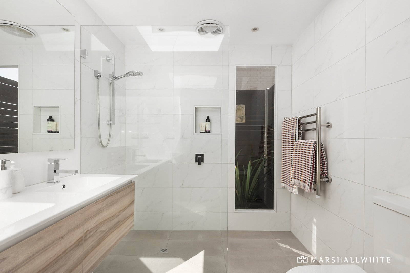 The interior features a fresh white decor with polished hardwood flooring entrance hall leading to a sitting room with OFP and double doors opening to a northern verandah, fitted study, concealed laundry and three zoned bedrooms, two with BIRs, main with WIR and fully-tiled ensuite with sky window and light well plus a pristine family bathroom with spa bath. A sleek kitchen with premium Smeg stainless steel stove and Asko dishwasher at the hub of the house overlooks an expansive family living and dining room with a sky window flowing through bi-fold doors to a wide deck with its leafy outlook of the soaring gum trees in the Reserve - perfect for relaxing with and entertaining family or friends in a private garden. Other desirable features include alarm ducted heating & evaporative cooling, quality fixtures & fittings, garden shed, gated, remote double garage/storage and front tandem off-street parking.