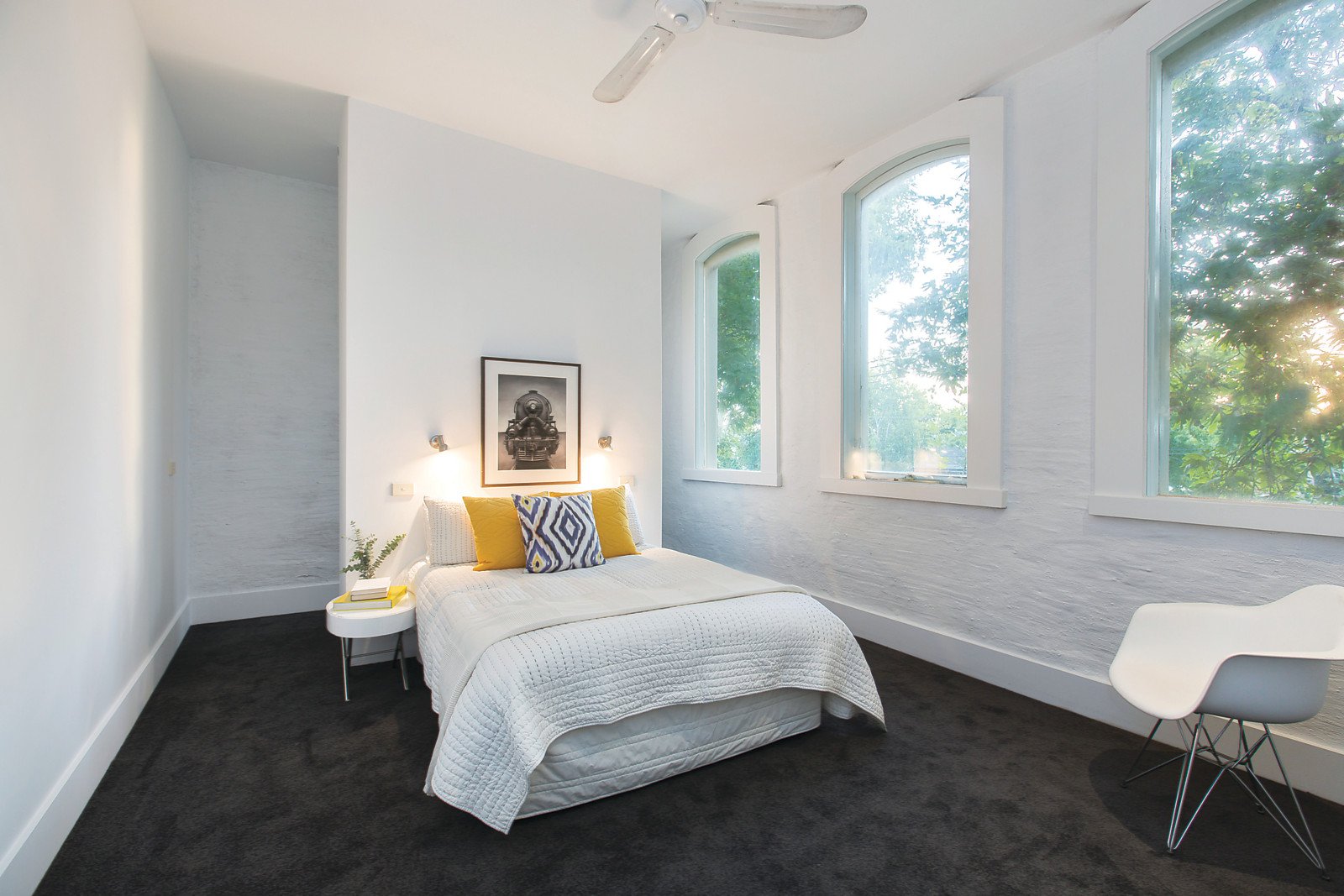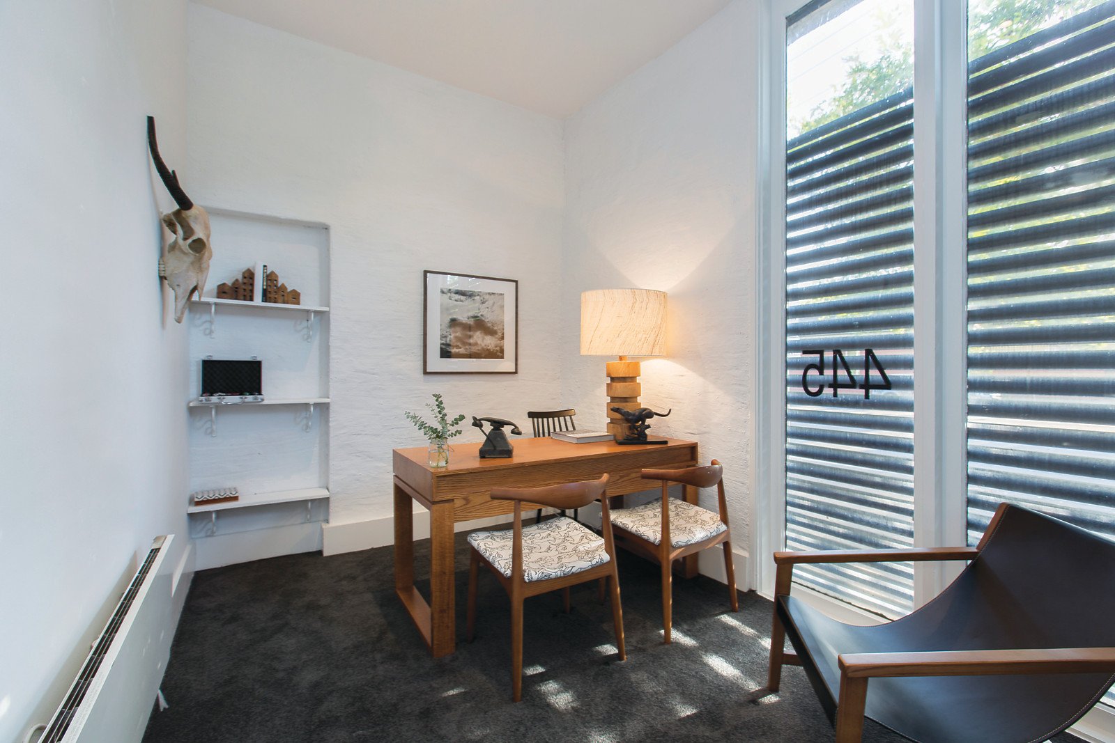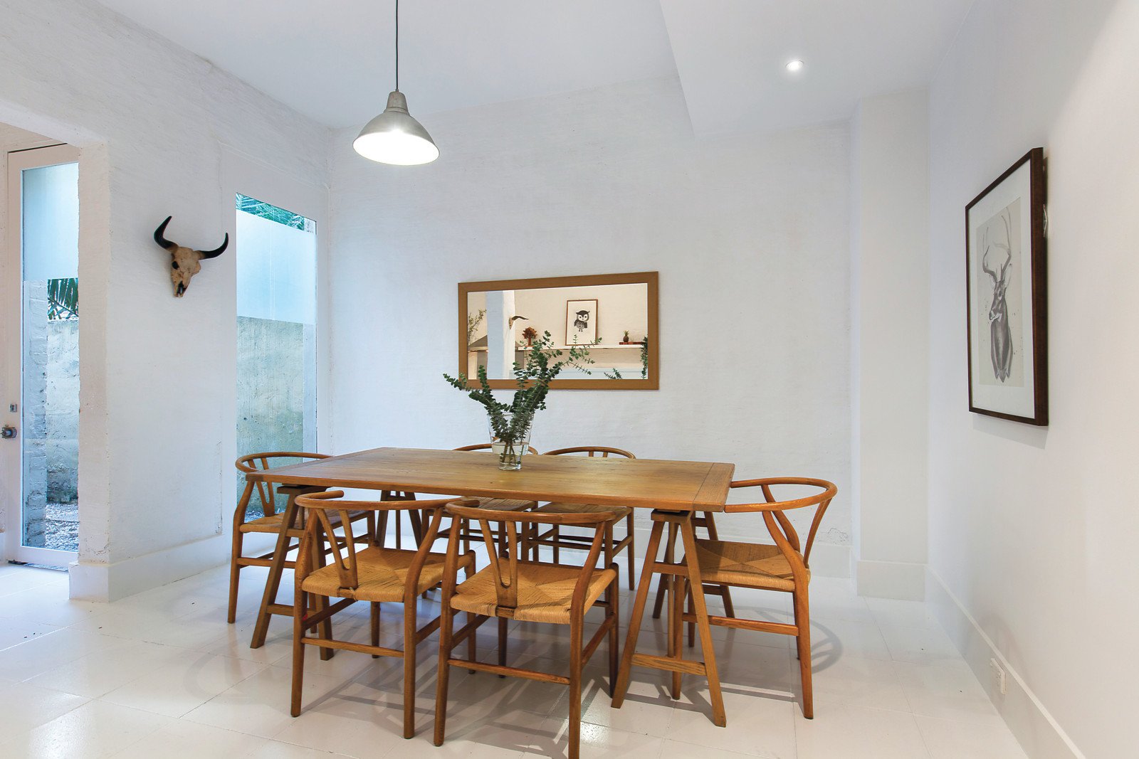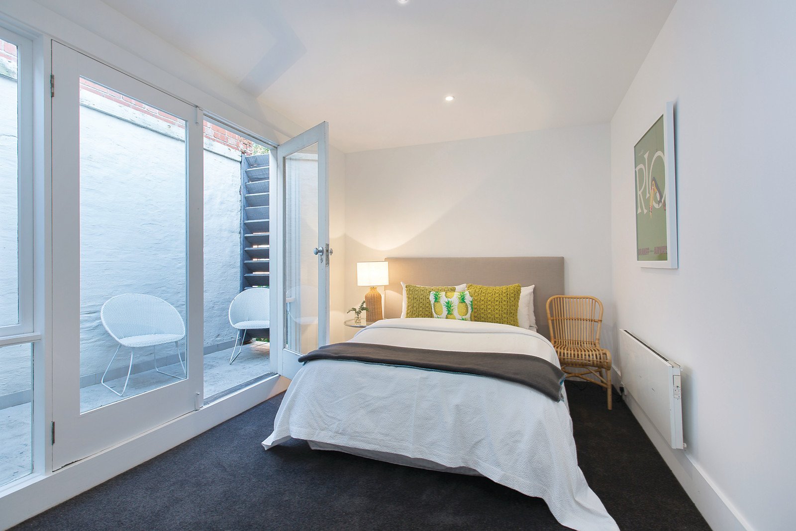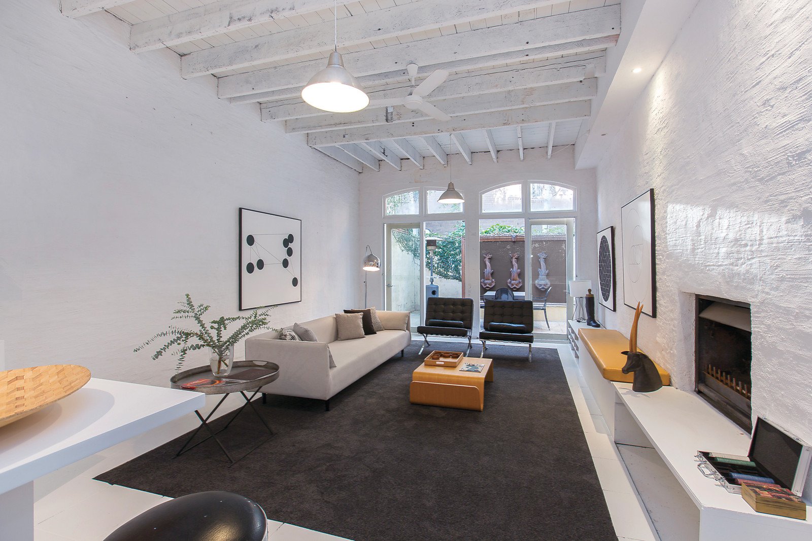 The white floors, white bagged walls and high ceilings create a wonderful sun-drenched ambience through the entrance hall, inviting dining area, well appointed kitchen and expansive living room (open fireplace) beneath rustic original rafters. The living spaces allows for fantastic natural light overlooking the north-facing paved courtyard. The three generous bedrooms are accompanied by a large retreat and main with walk in robe, study or den, two bathrooms and a private balcony.