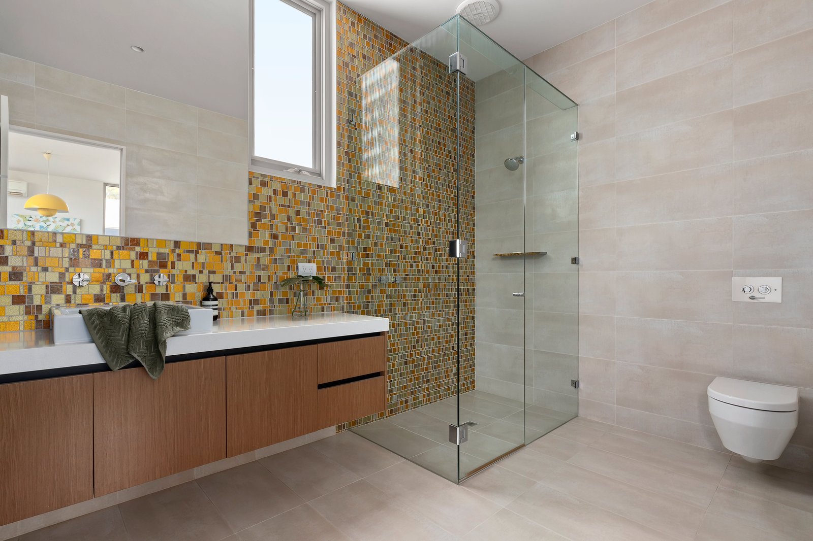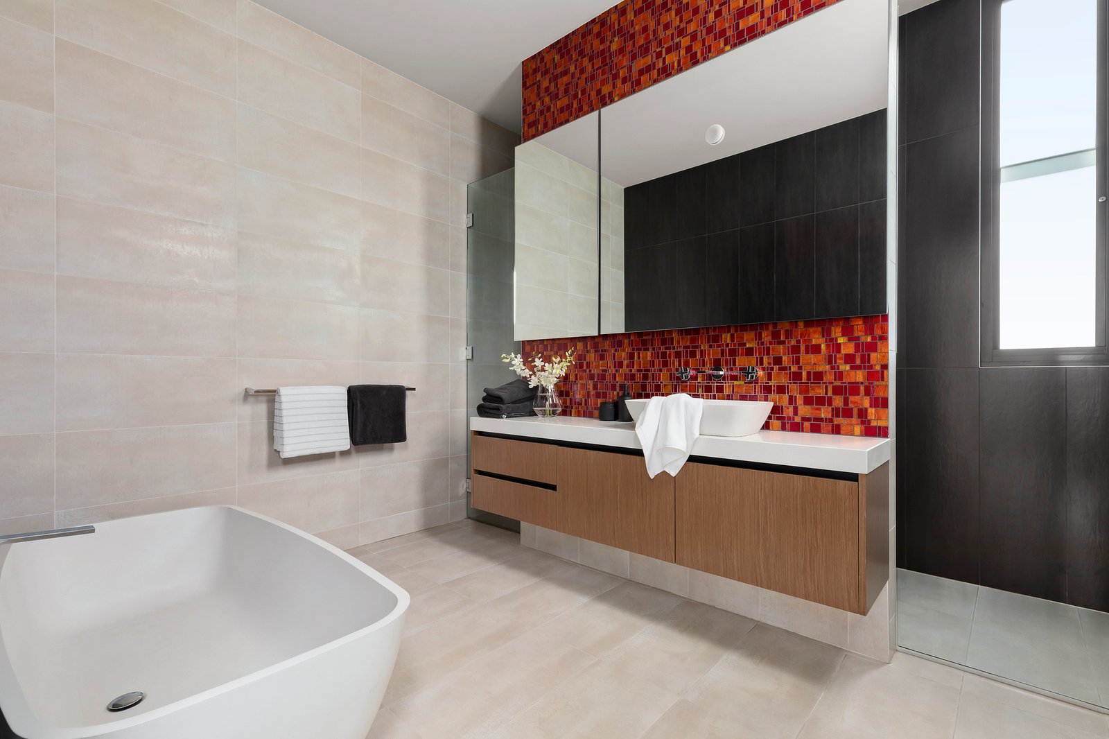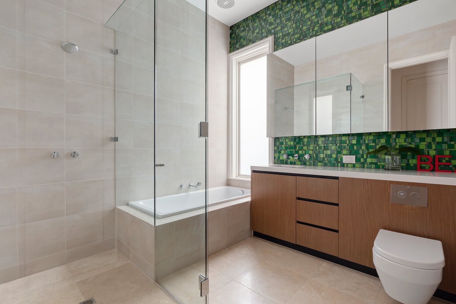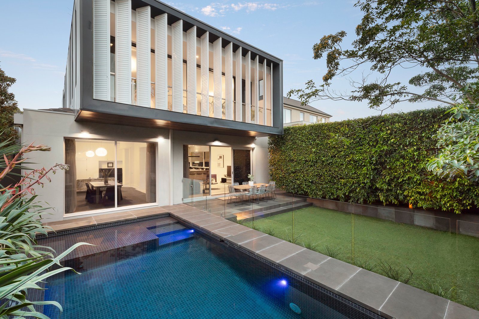 The expansive main open-plan living and dining area features bespoke cabinetry, a gas log fire heater, a stone/Miele kitchen and glass sliding doors that open out to the alfresco zone comprising a fully tiled, solar-heated salt-water chlorinated swimming pool set in bluestone surrounds, and a mod-grass lawn area and basketball hoop, all privately cocooned in lush greenery. Offering a flexible floorplan, there is a ground-level bedroom with walk-in robe and shower ensuite, and a further three bedrooms upstairs including the expansive master suite with sitting area, a full-width balcony, walk-in robe and luxe ensuite with a free-standing tub. An adjacent light-filled work-from-home space could also double as a nursery, and an under-roof storage room works well as a kid’s playroom or retreat. Additional notable features include hand-made mosaic tiling in the bathrooms, a large laundry/utility room, in-floor ducted heating, double-glazing throughout, 9.5-kilowatt rooftop solar panels, 3-phase power, and a 20,000-litre water tank.
